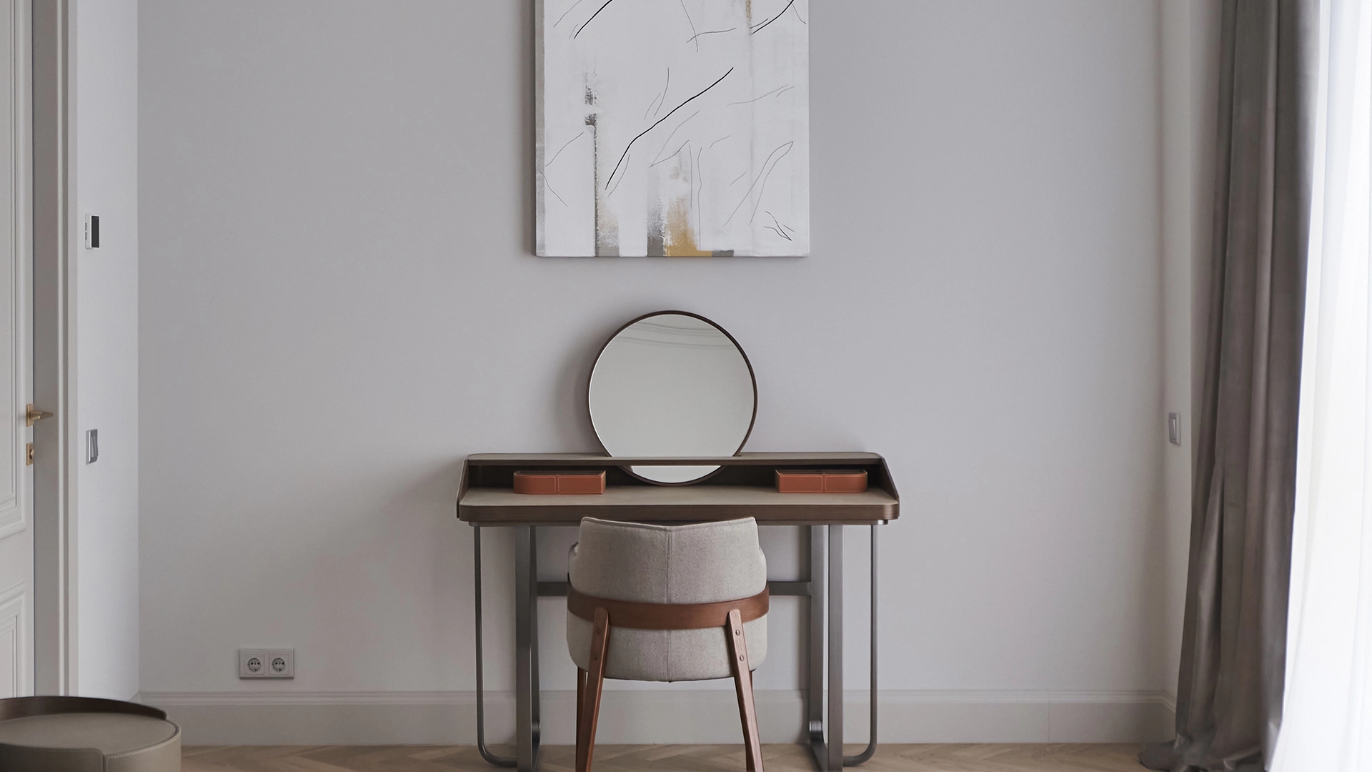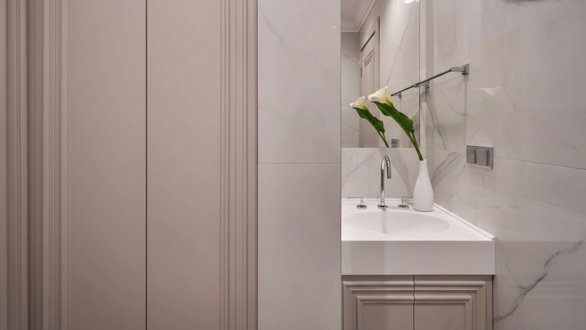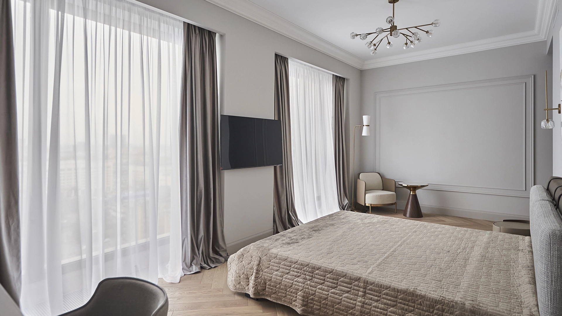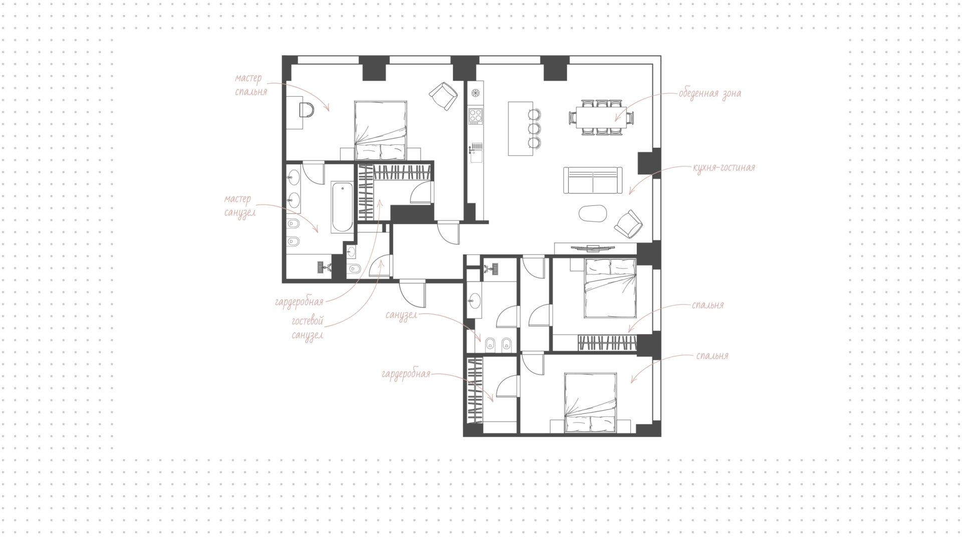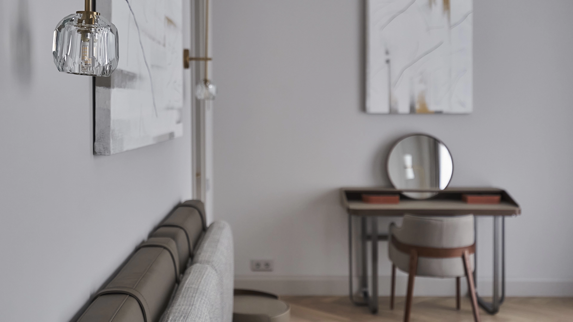 The apartment has a corner kitchen-living room, master bedroom with its own dressing room and bathroom, 2 bedrooms, dressing room, 2 bathrooms, hallway. Thanks to panoramic glazing and 3.1 meter high ceilings, the space is filled with air and natural light. The windows overlook the internal park.