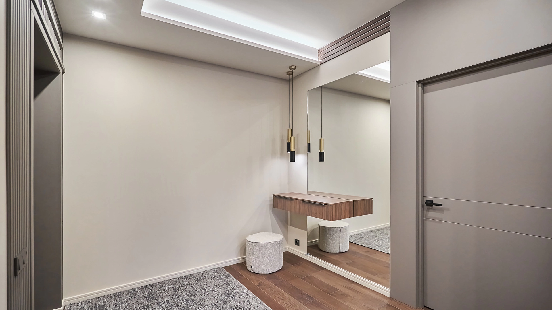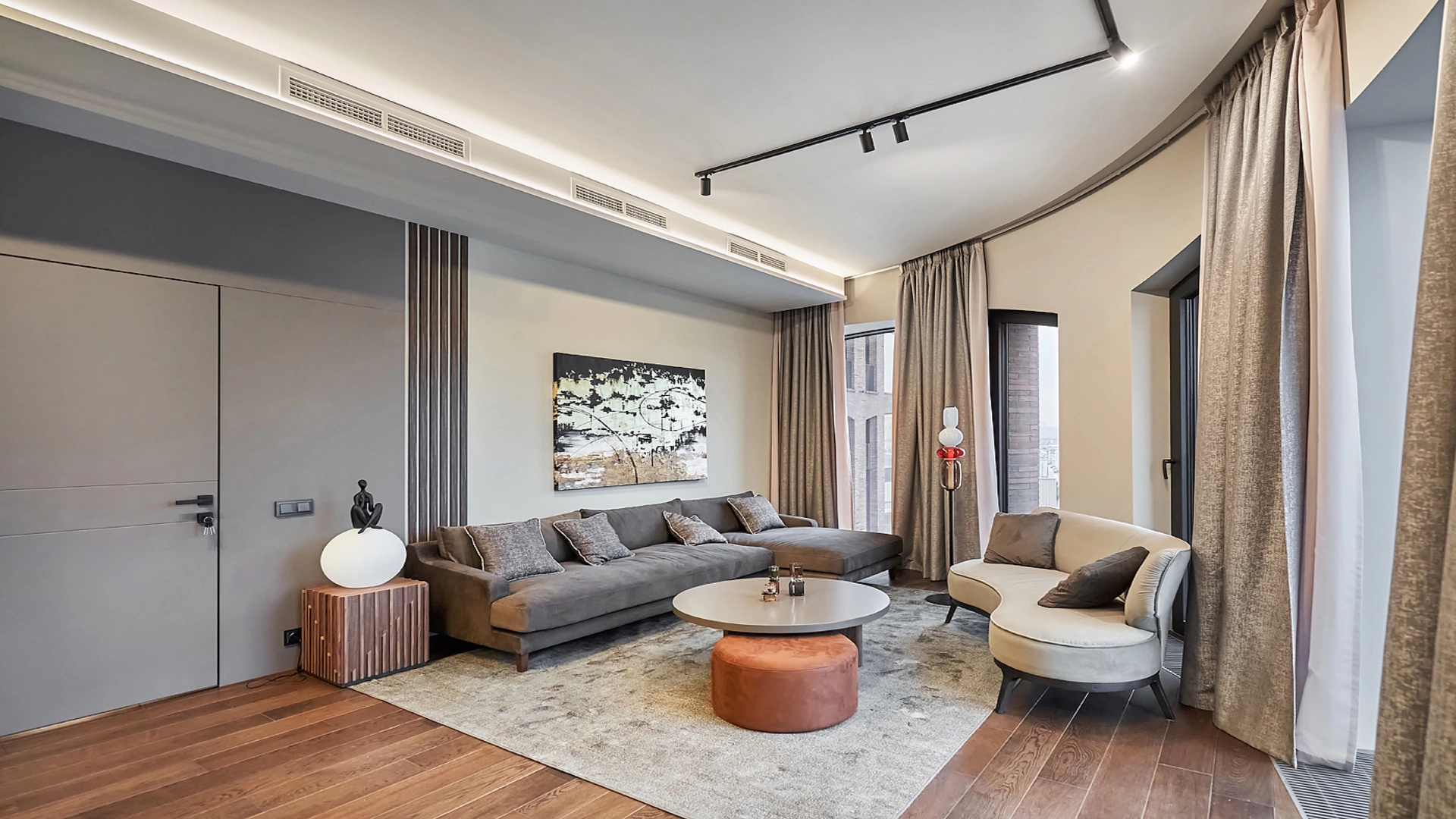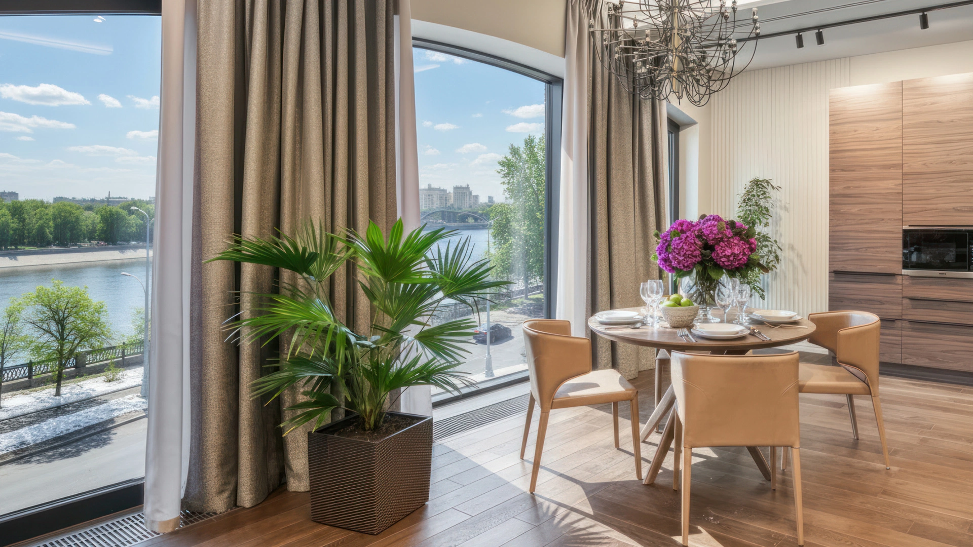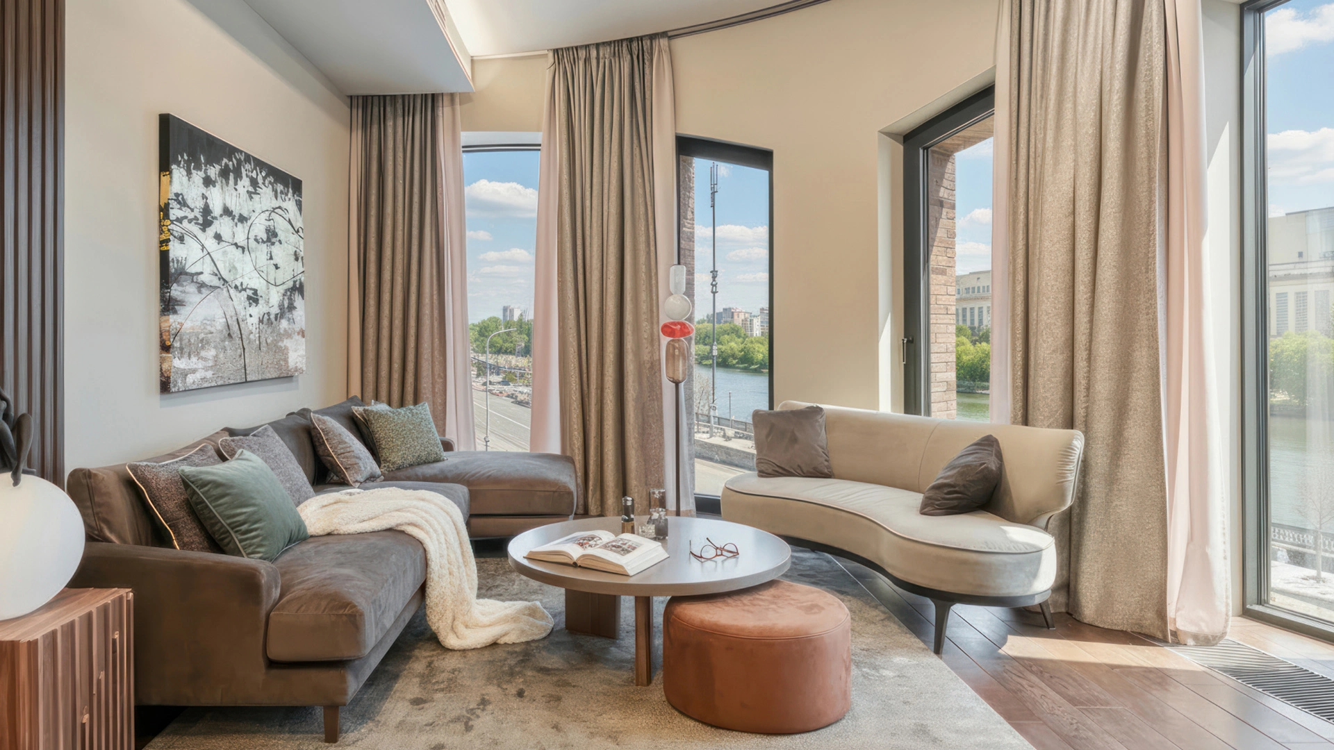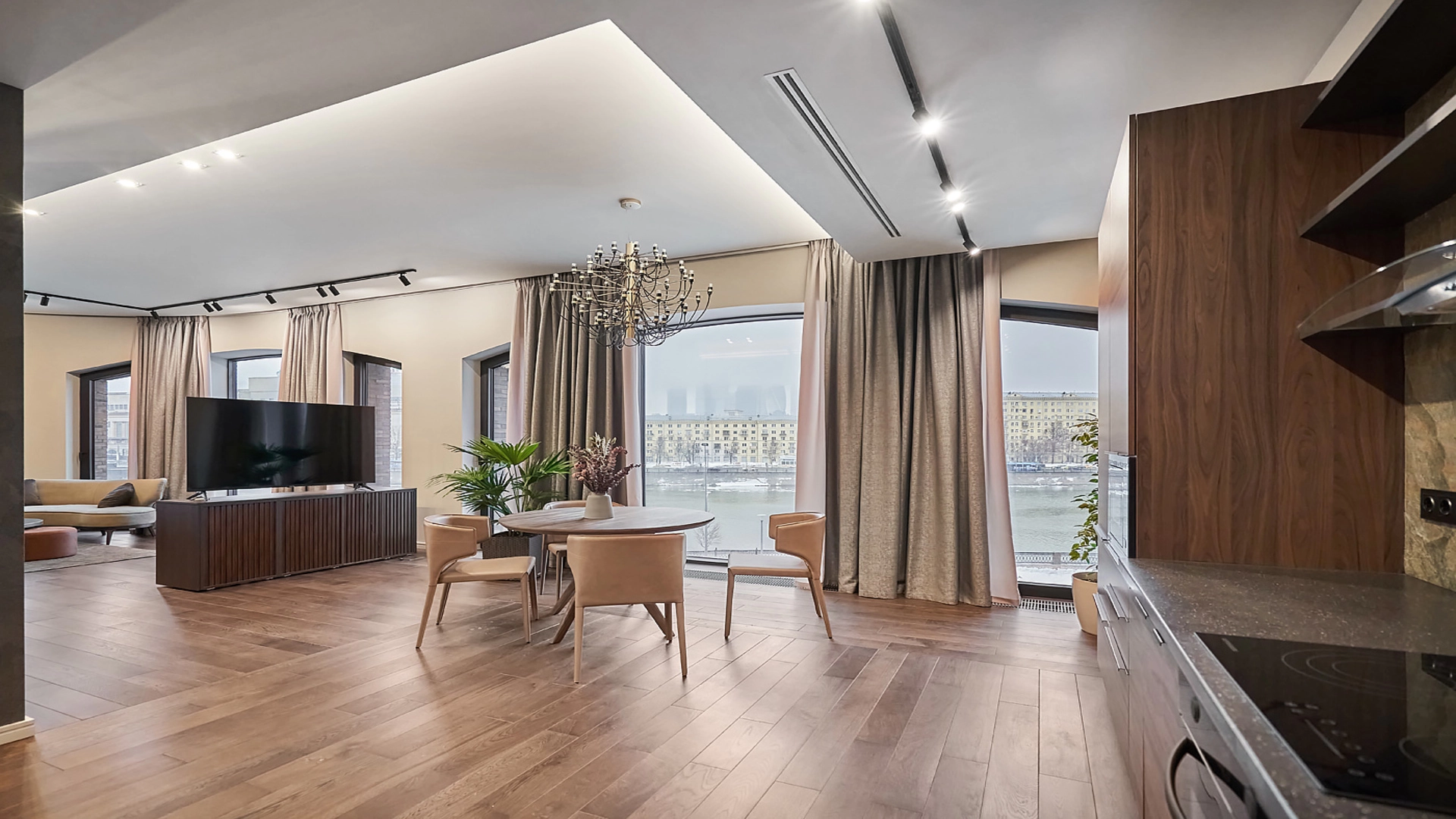 Spacious 2-bedroom apartment of 150 m² located on the 3rd floor of a premium complex by the river. It has been renovated in a modern style. The interior is decorated in warm sandy shades. The apartment is furnished and equipped with Kuppersberg appliances.