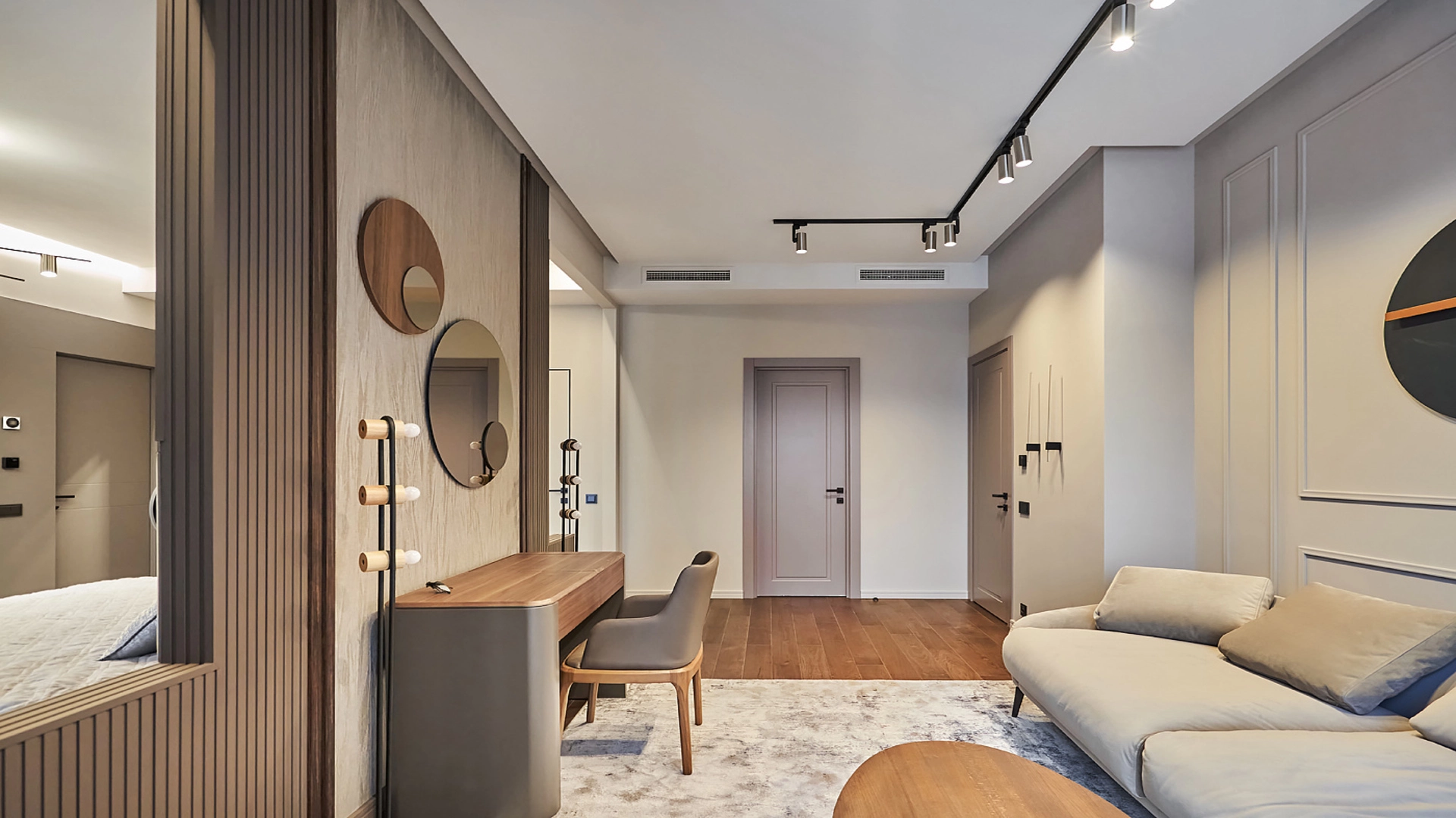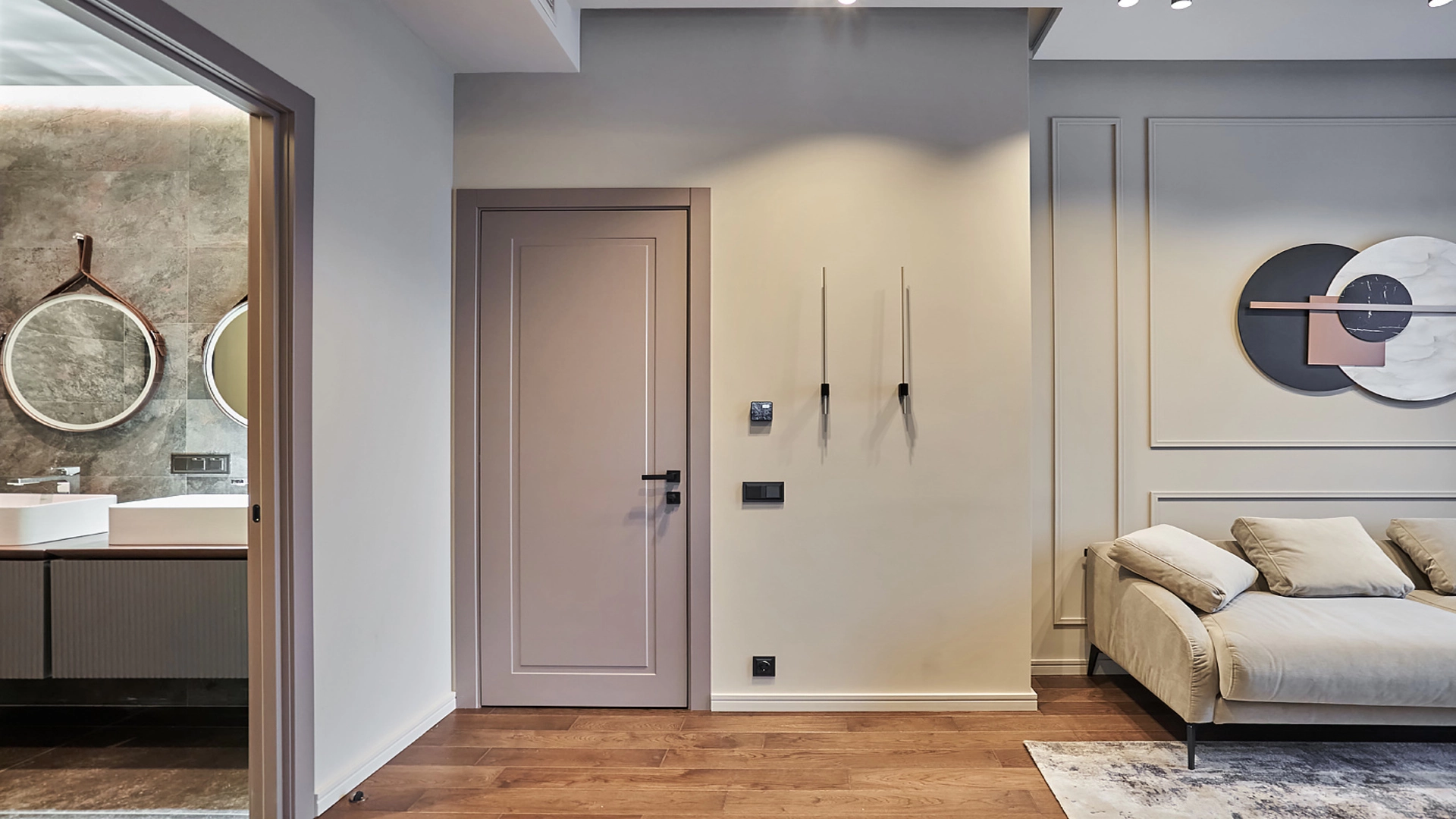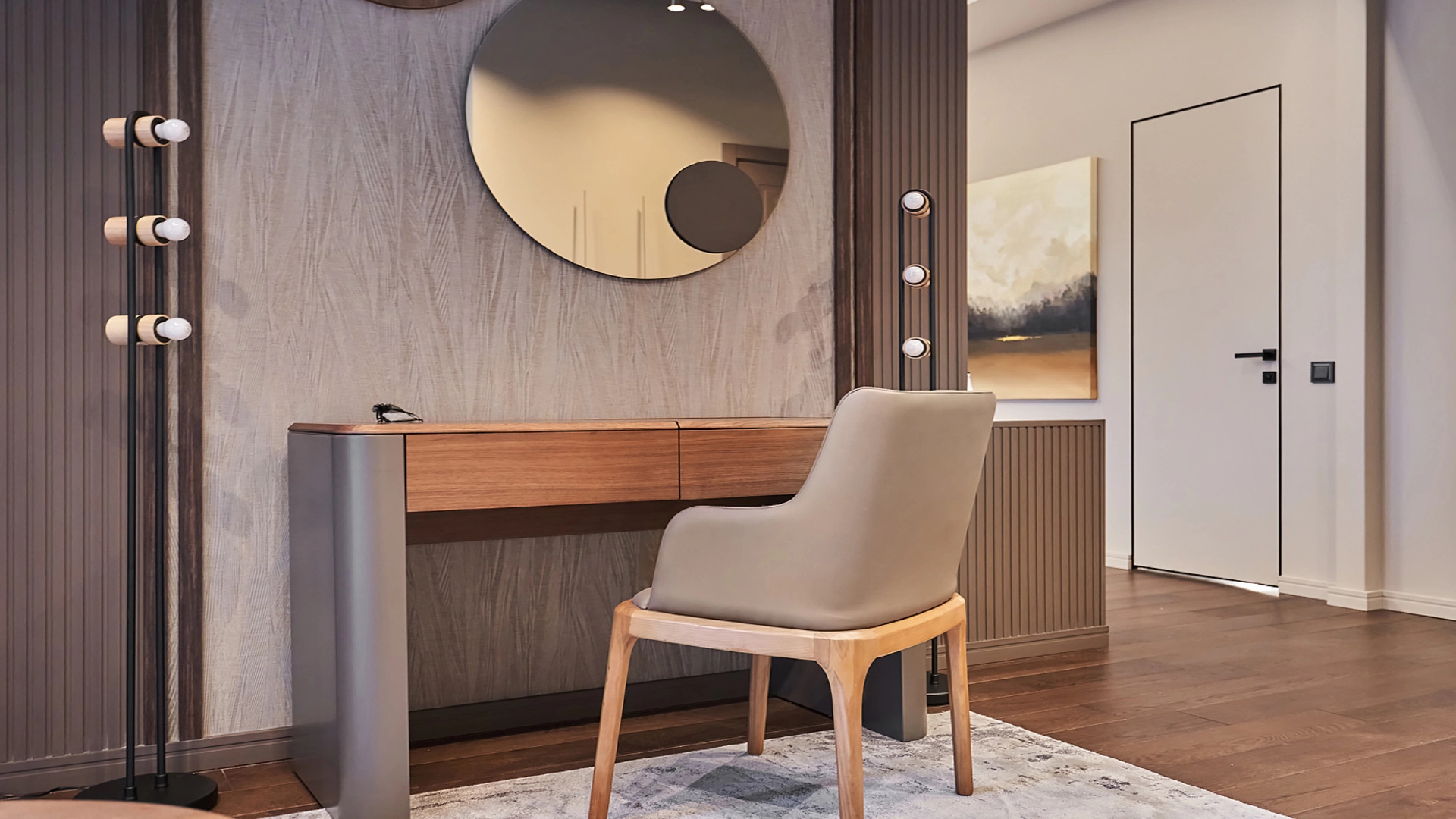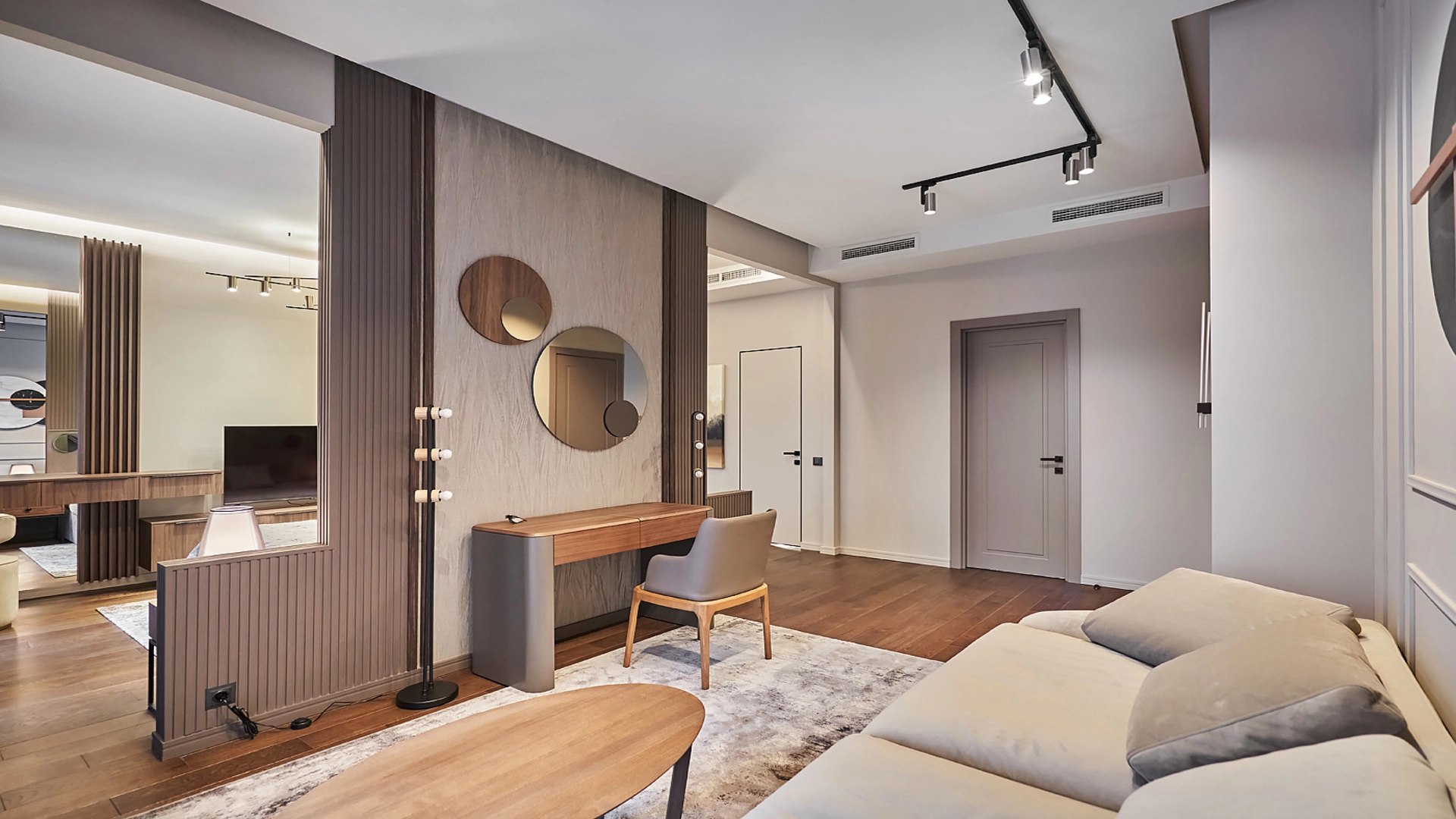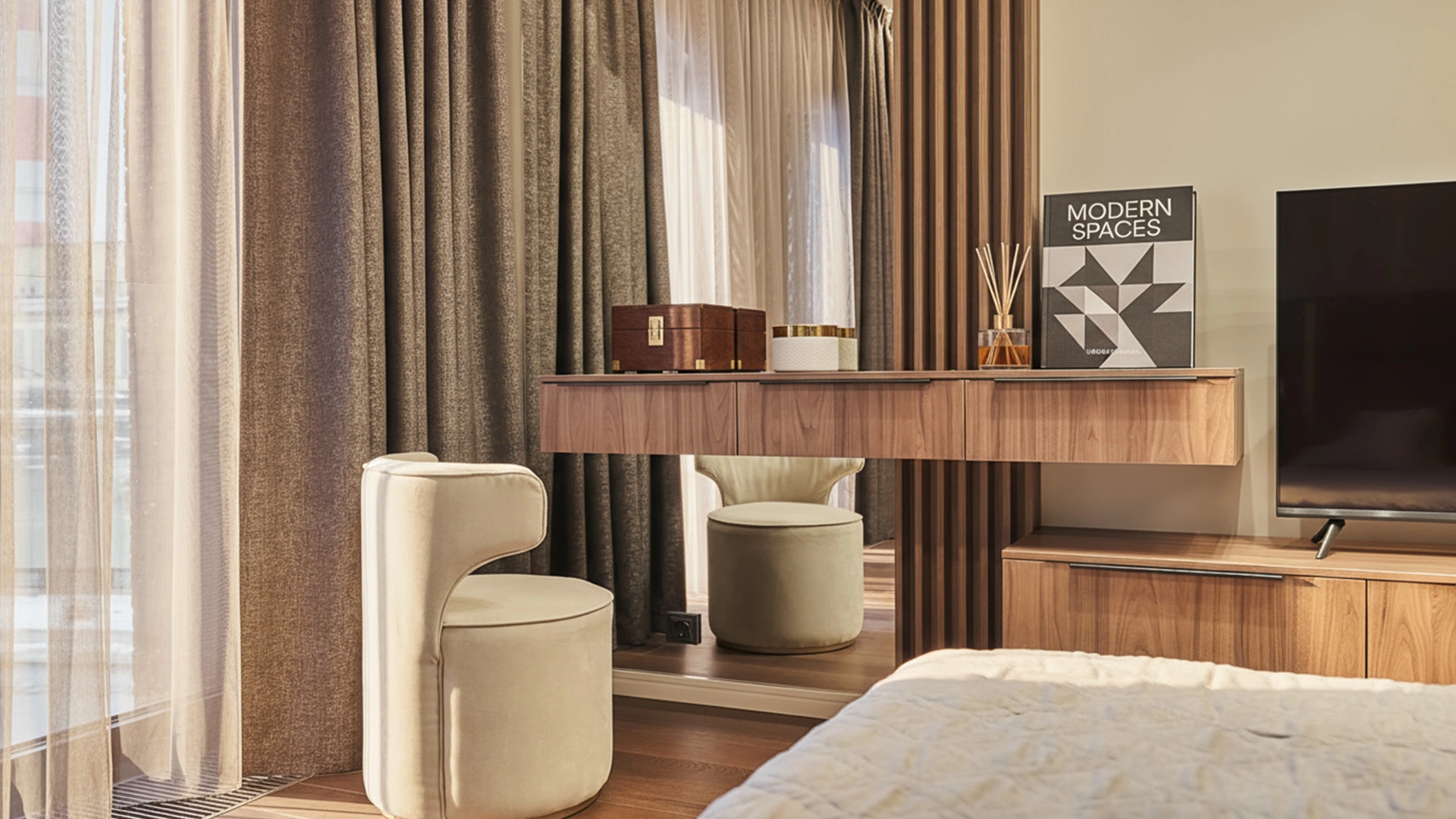 Spacious 2-bedroom apartment of 150 m² located on the 3rd floor of a premium complex by the river. It has been renovated in a modern style. The interior is decorated in warm sandy shades. The apartment is furnished and equipped with Kuppersberg appliances.