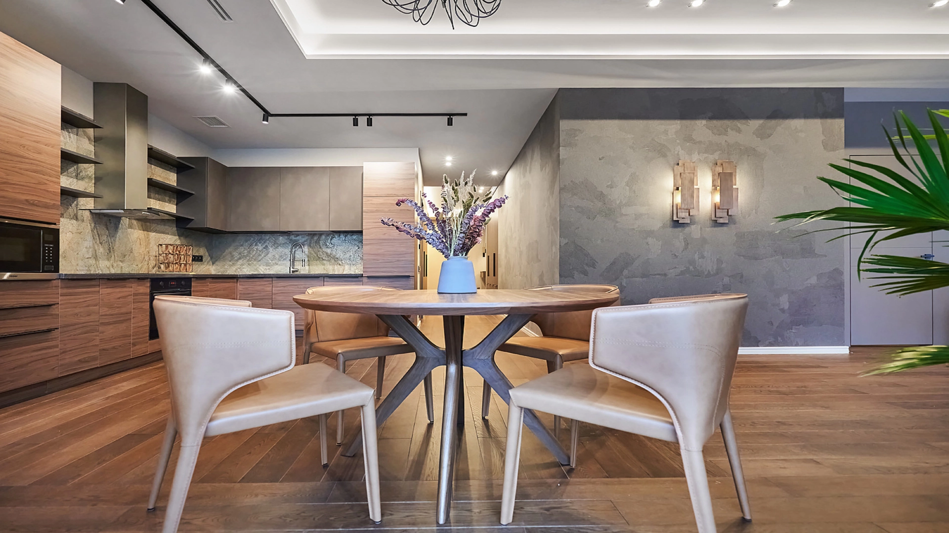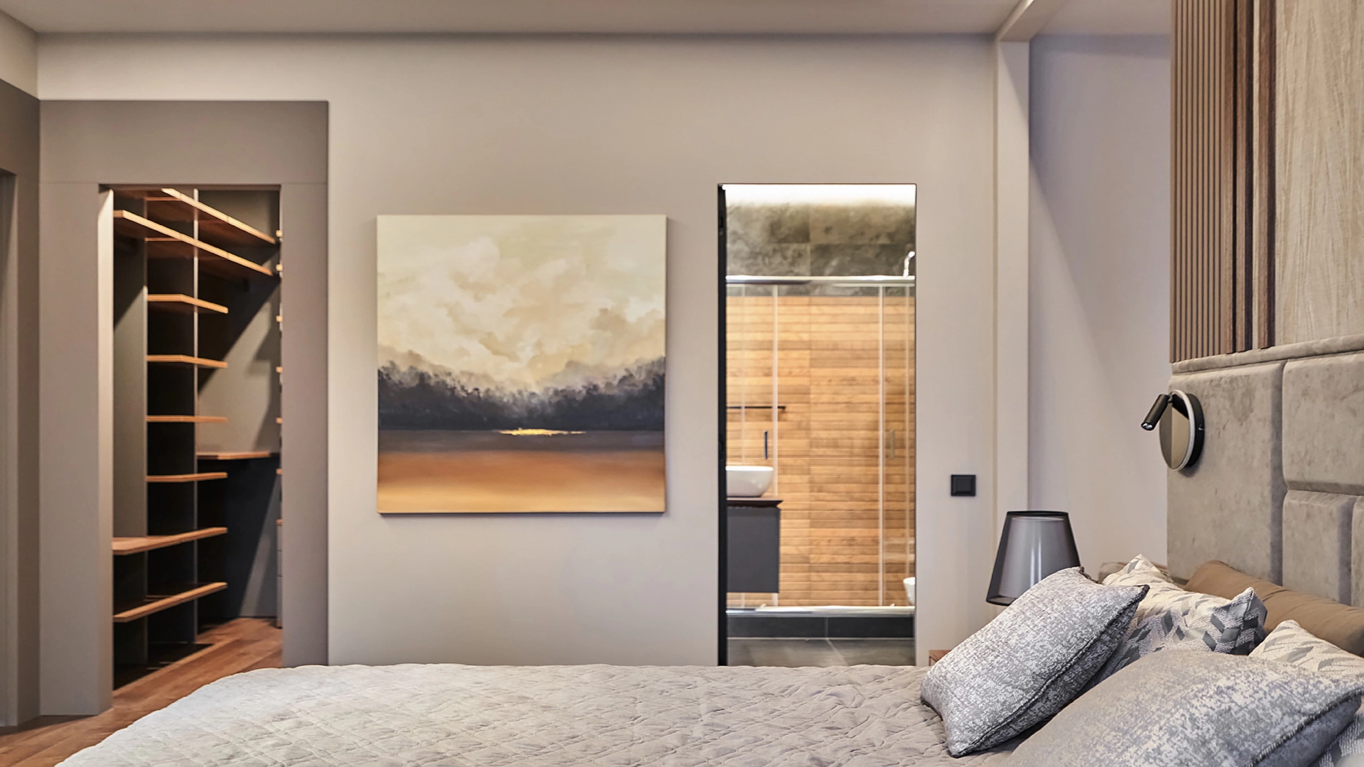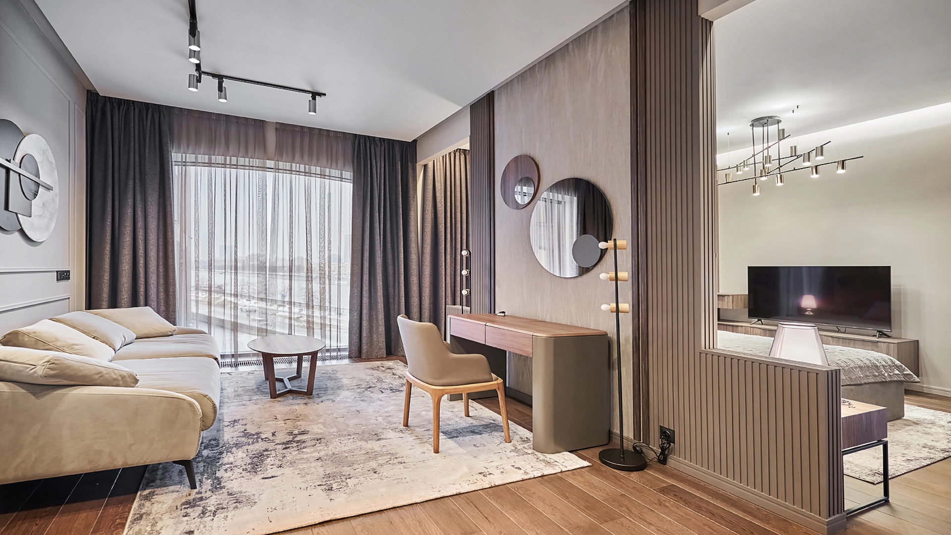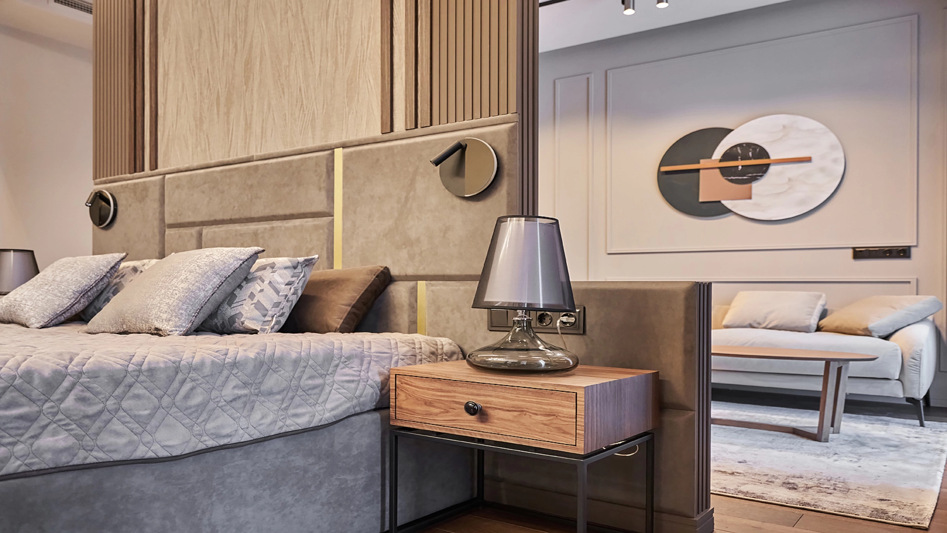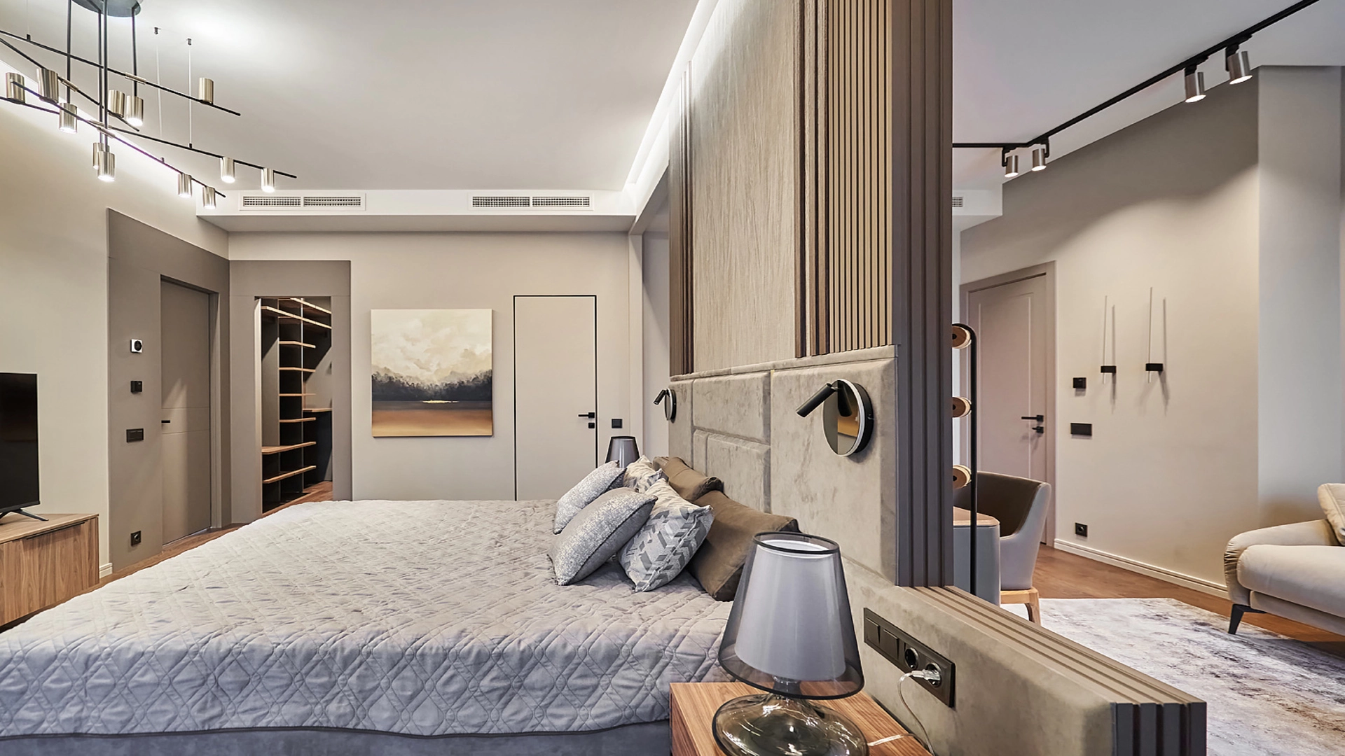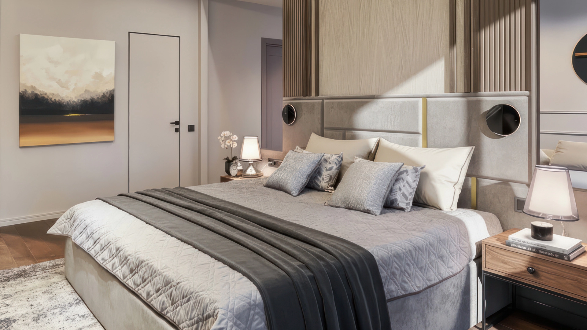 Spacious 2-bedroom apartment of 150 m² located on the 3rd floor of a premium complex by the river. It has been renovated in a modern style. The interior is decorated in warm sandy shades. The apartment is furnished and equipped with Kuppersberg appliances.