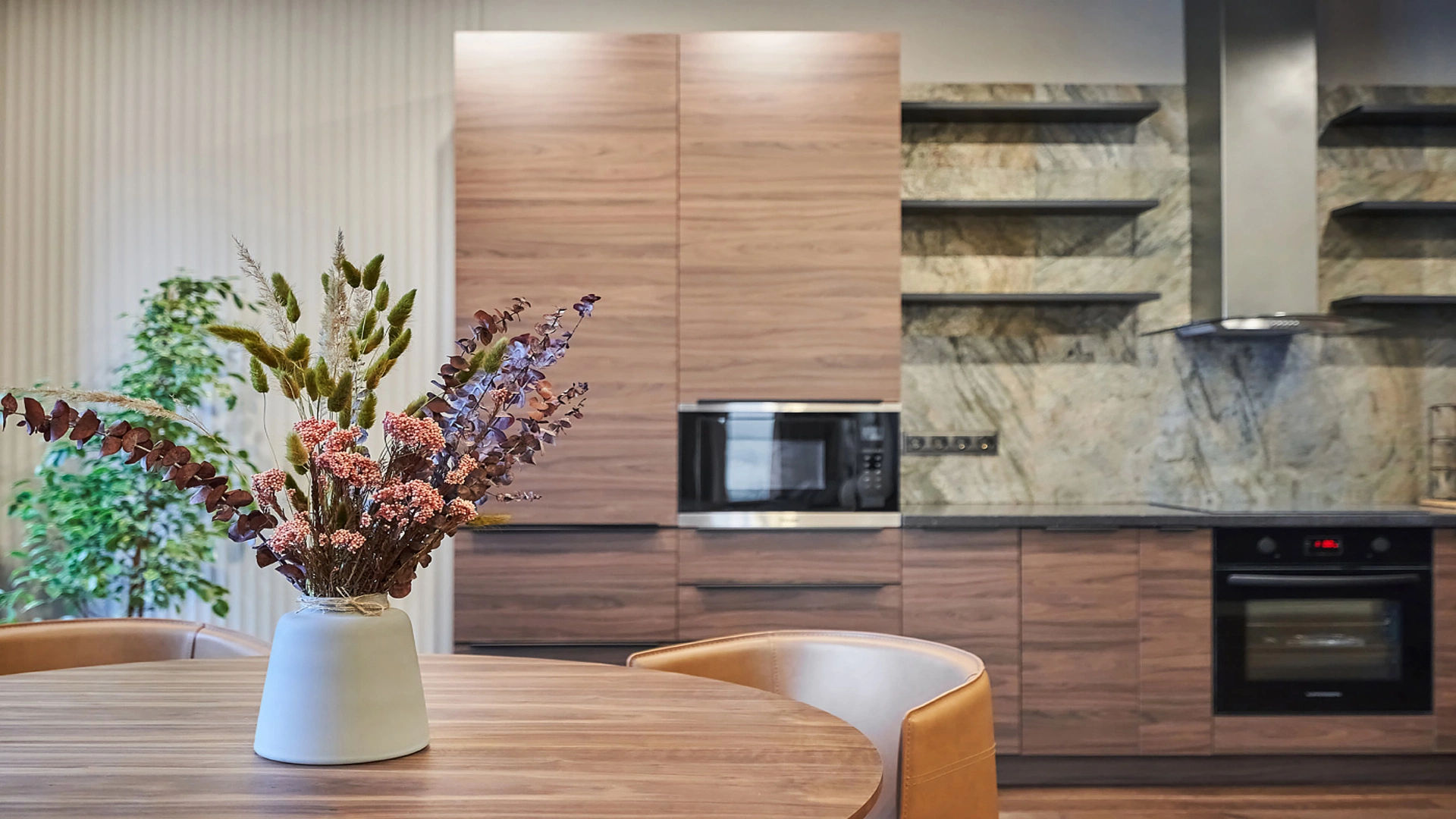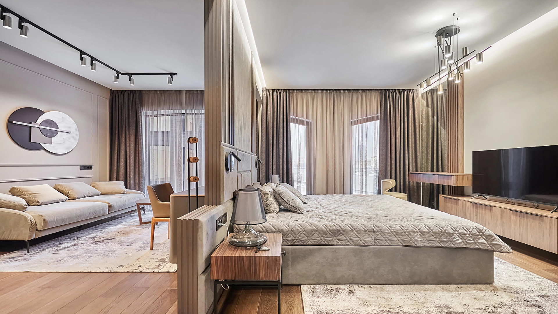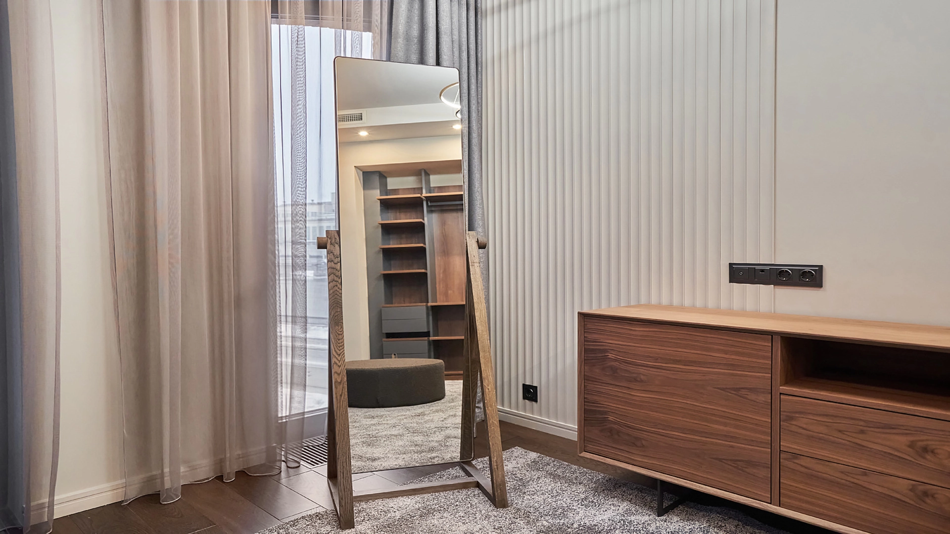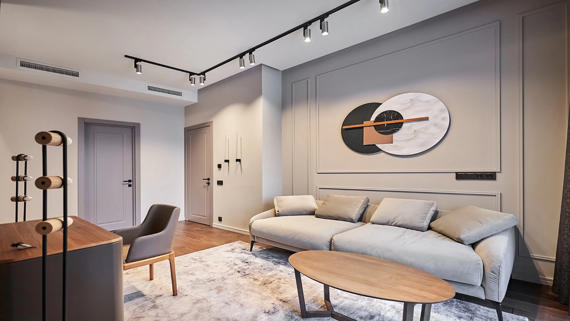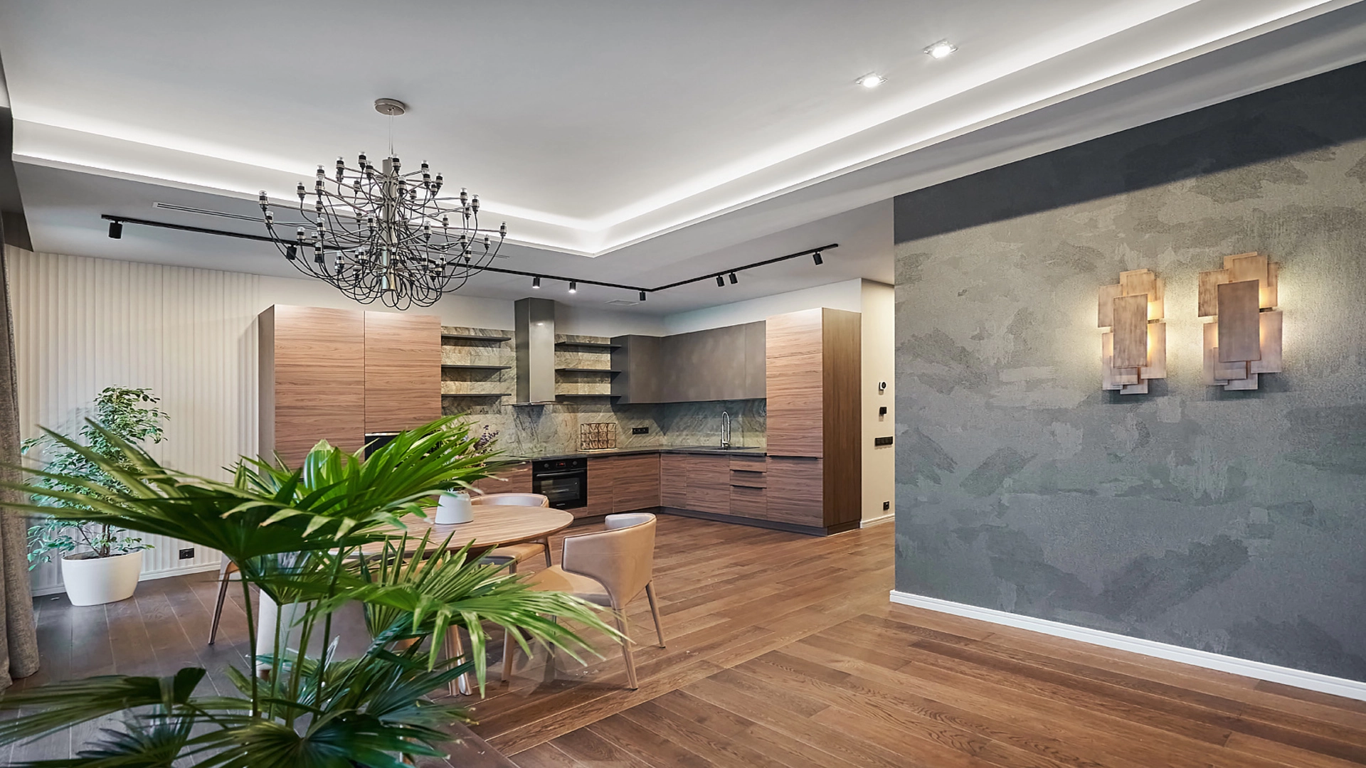 Spacious 2-bedroom apartment of 150 m² located on the 3rd floor of a premium complex by the river. It has been renovated in a modern style. The interior is decorated in warm sandy shades. The apartment is furnished and equipped with Kuppersberg appliances.