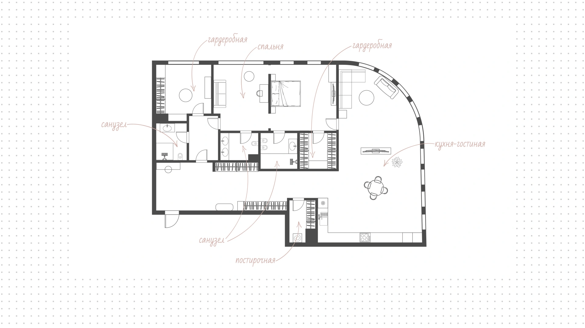 The apartment has a kitchen-living room with a cozy sitting area and bay windows "in the floor", 2 bedrooms, united by a single space and zoned by a partition, 2 bathrooms with shower cabins and a dressing room. From the windows of the apartment opens a panoramic view of the embankment. The price includes 1 parking place.