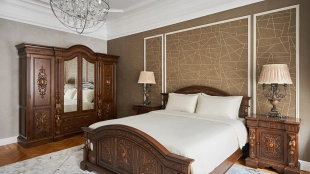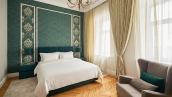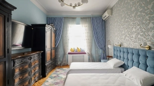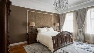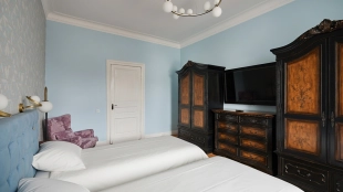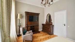 Spacious 5-bedroom apartment in a historic mansion in the Tsvetnoy Boulevard area. The apartment with total area of 180 m² is located on the 3rd floor. The apartment has been renovated in classic style using premium materials. The interiors are furnished with upholstered and carved wooden furniture and decorative items. There is a fireplace in one of the bedrooms. Thanks to a large number of windows and ceilings 3.1 meters high, the space is filled with natural light.