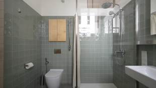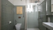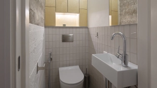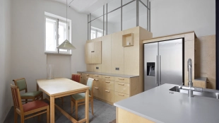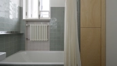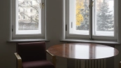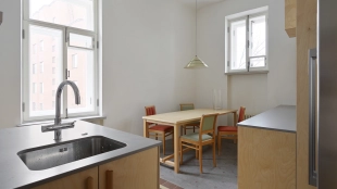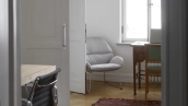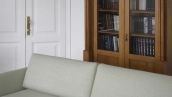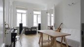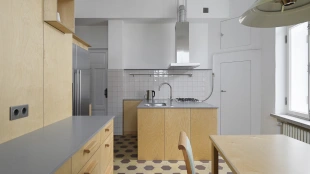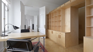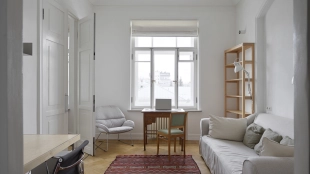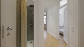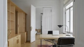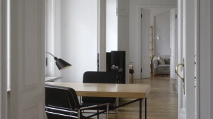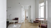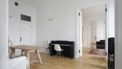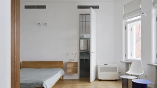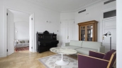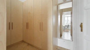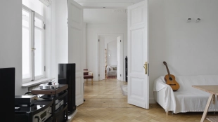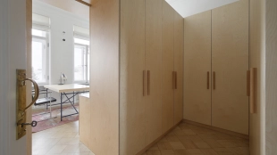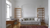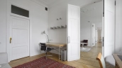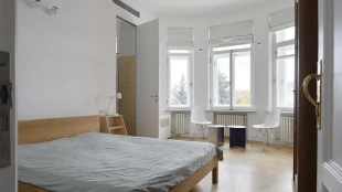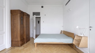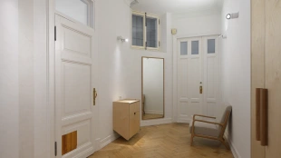 The rooms feature light wood parquet flooring and custom-made furniture and vintage-inspired elements. High ceilings and white doors visually enlarge the rooms, filling the rooms with light. During the renovation, the ventilation and air conditioning, heating, plumbing, and low-current systems were also replaced.