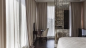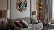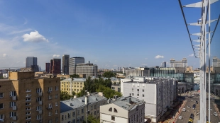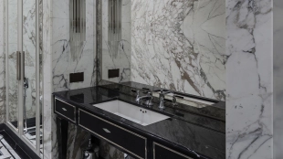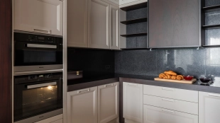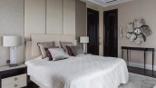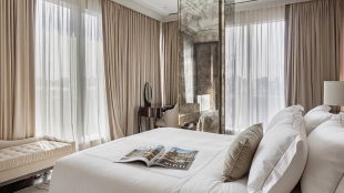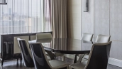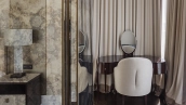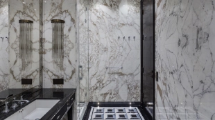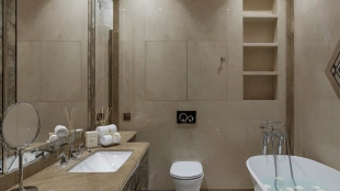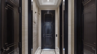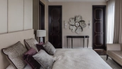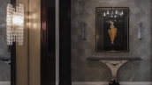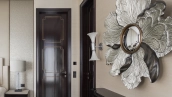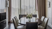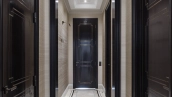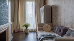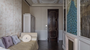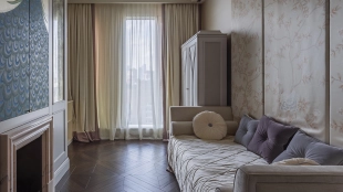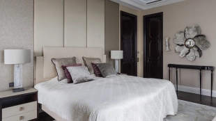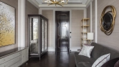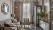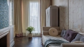 Spacious three-bedroom apartment in the premium-class complex "Four Winds" in Tverskoy district. The apartment with an area of 186 m² is located on the ninth floor. The interior is decorated in a modern style in laconic warm colors, natural marble, precious woods, eel skin are used in the finishing.