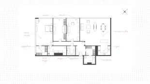 The layout includes a kitchen-living-dining room, master bedroom with its own bathroom and dressing room with a window, two bedrooms, bathroom, dressing room, laundry room, hall. The apartment is fully equipped with furniture and appliances. Thanks to the panoramic glazing and high ceilings, the space is filled with natural light and offers views of the city and the landscaped area of the complex.