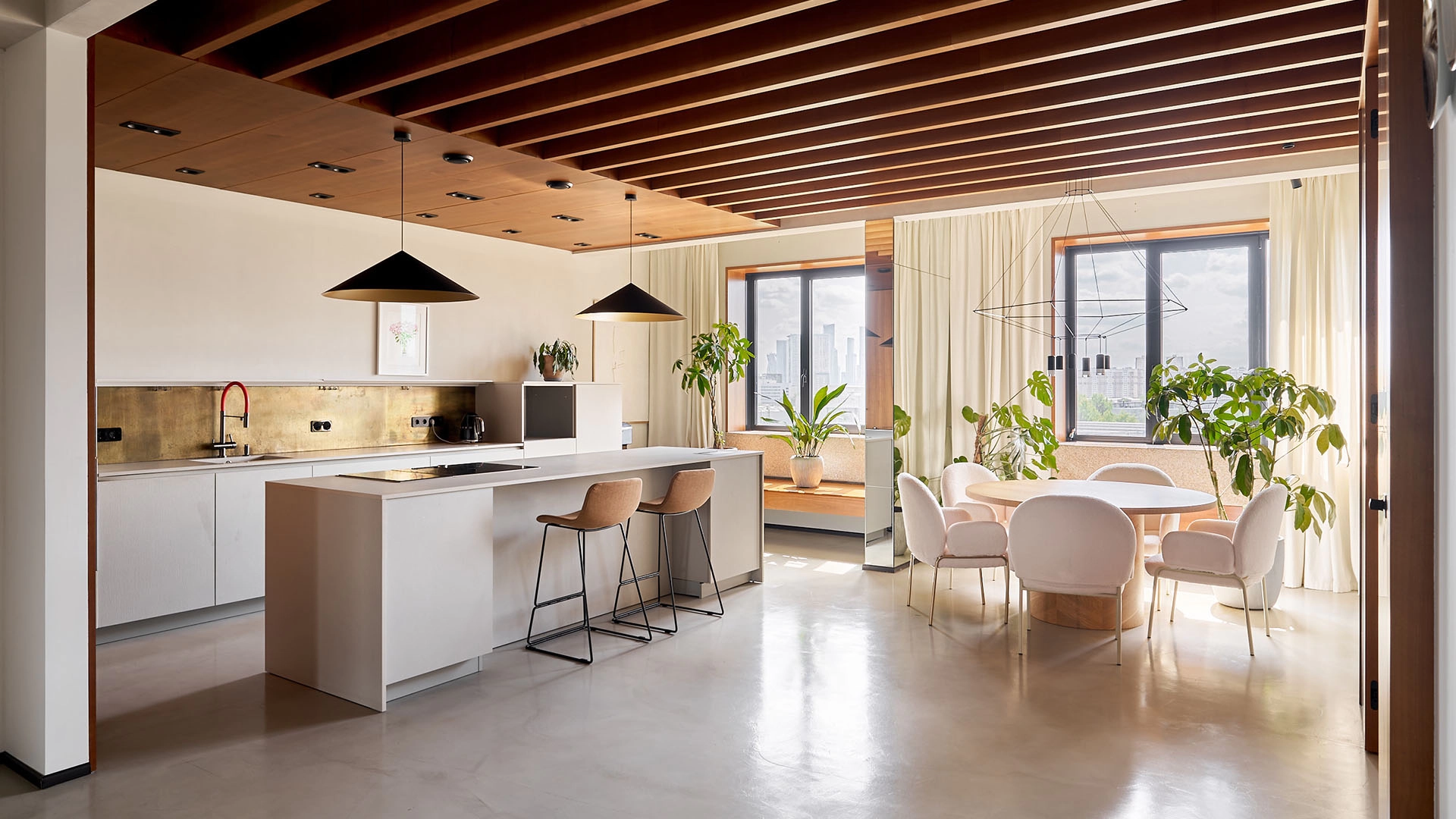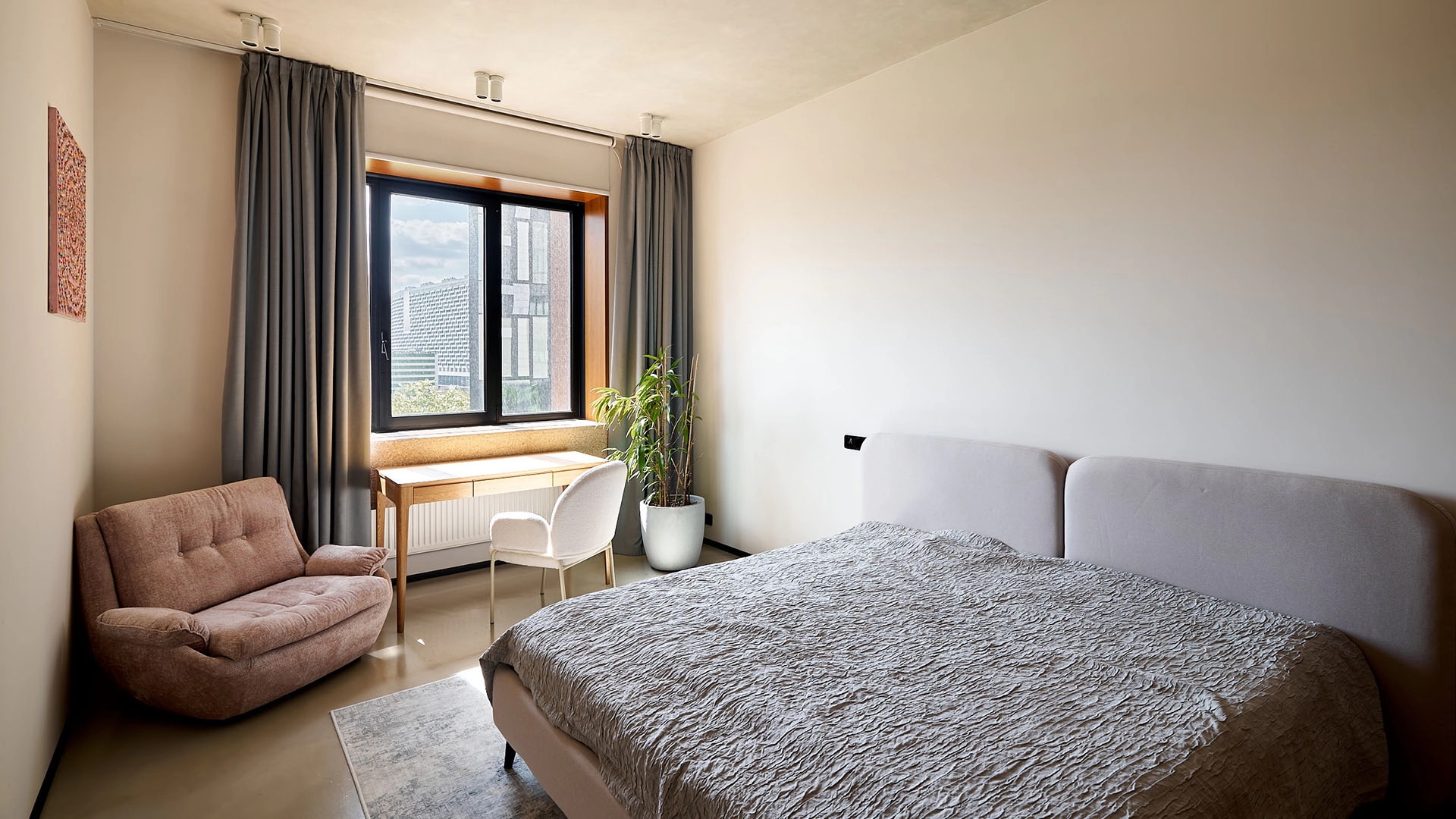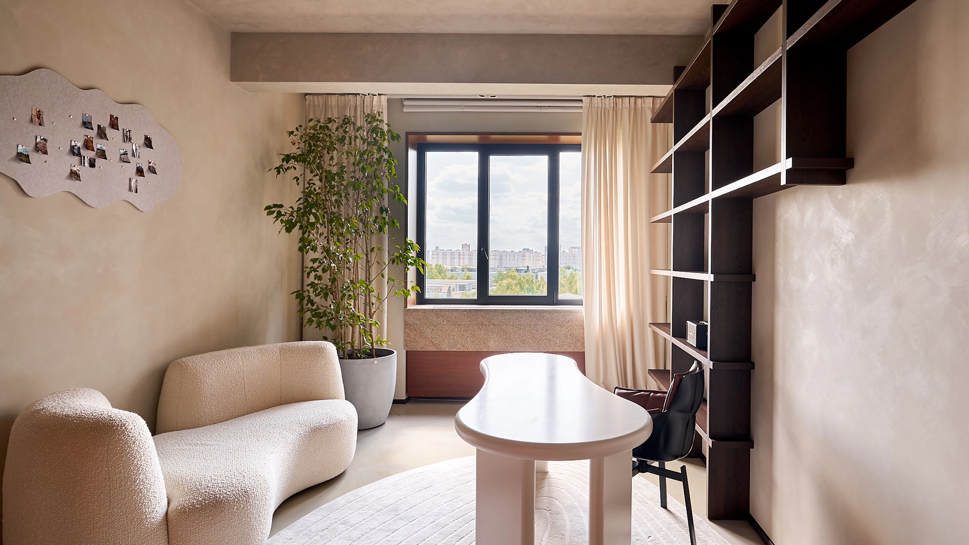 Spacious 2-bedroom apartment with a total area of 150 m² in the premium complex "Iskra-Park" on the 8th floor. It has a designer finish in a modern style in light colors. Thanks to panoramic windows and high ceilings the space is filled with natural light. Planned kitchen-living room with island and dining area, master bedroom with bathroom, second bedroom, study, bathroom with shower, dressing room, pantry, hallway. The apartment is fully furnished and equipped with household appliances. The windows offer a picturesque view of the city towards the business center "Moscow-City" and the landscaped courtyard.