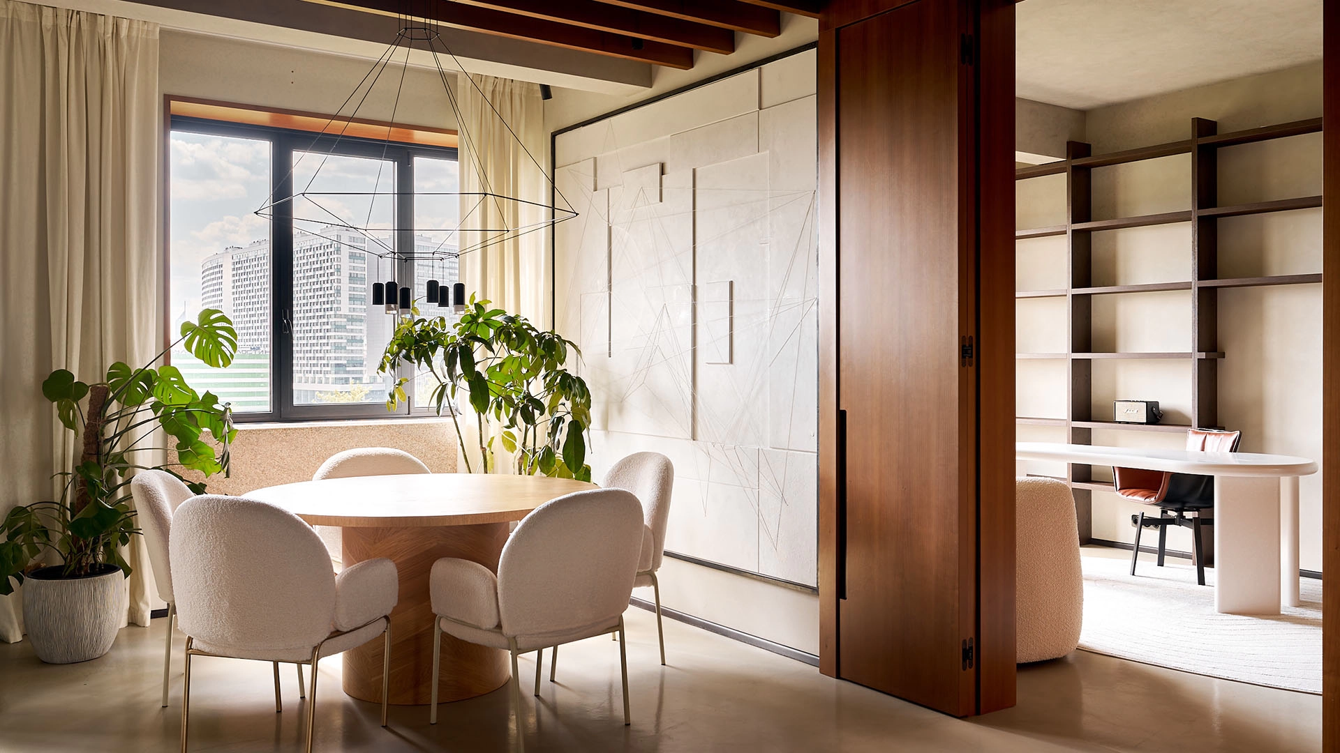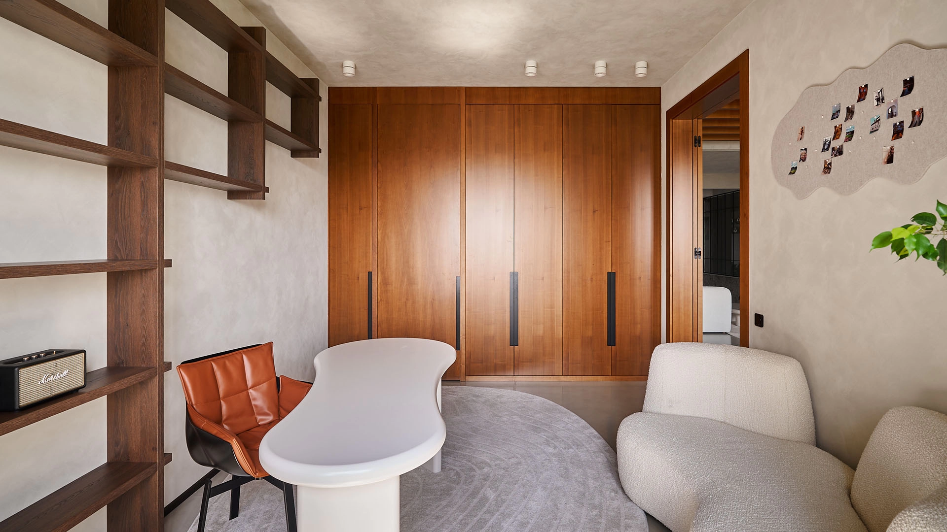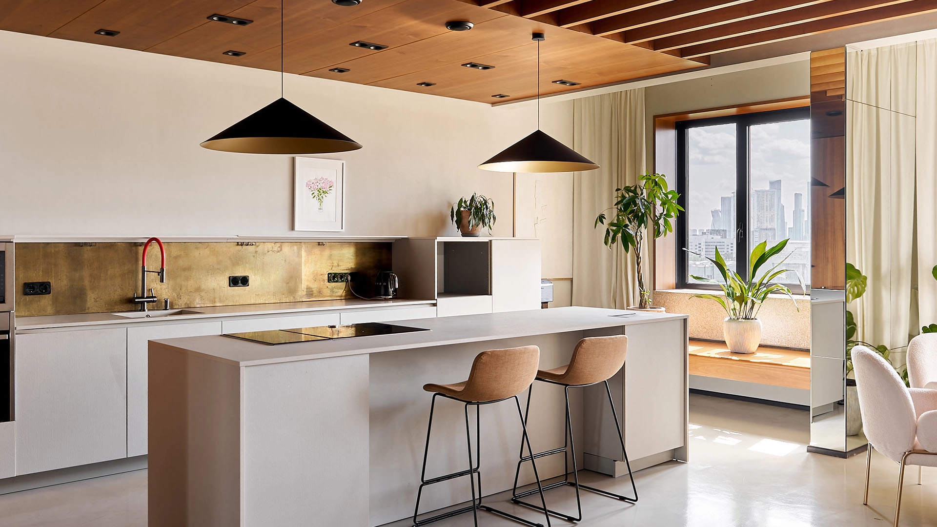 Spacious 2-bedroom apartment with a total area of 150 m² in the premium complex "Iskra-Park" on the 8th floor. It has a designer finish in a modern style in light colors. Thanks to panoramic windows and high ceilings the space is filled with natural light. Planned kitchen-living room with island and dining area, master bedroom with bathroom, second bedroom, study, bathroom with shower, dressing room, pantry, hallway. The apartment is fully furnished and equipped with household appliances. The windows offer a picturesque view of the city towards the business center "Moscow-City" and the landscaped courtyard.