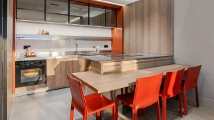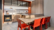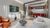 Layout: spacious living-dining room with kitchen area, master bedroom with en-suite bathroom, second bedroom, second bathroom with shower and washing machine, hall with closet. The master bathroom has two sinks, bath and shower. The apartment is equipped with modern Italian furniture. Arclinea Italia kitchen set, Tacchini sofa, Baxter bed, B&B walk-in closet. Miele appliances - dishwasher, oven, hob, fridge.