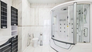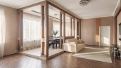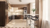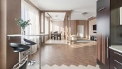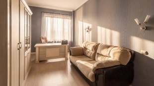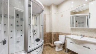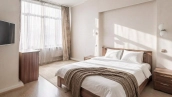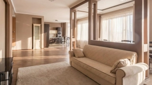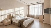 Apartment of 192 sq.m. in a house on Novy Arbat on the 5th floor. The apartment has been renovated in a modern style. The interior is kept in laconic beige-brown colors, the floor is covered with parquet and large tiles. There is a corner kitchen with built-in appliances. The ceilings are 3.3 meters high. The apartment is provided without furniture, possible purchase for the client.