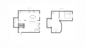 1st level: kitchen-living room with dining area, bathroom with shower, hallway with storage room. The kitchen can be zoned with curtains. 2nd level: recreation area, workplace, bedroom. The bedroom has a large window overlooking the living room. There is an air conditioning system. The windows overlook a quiet courtyard.
