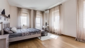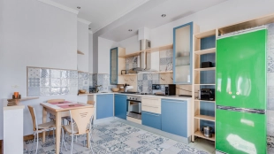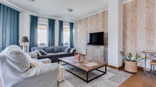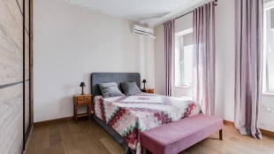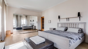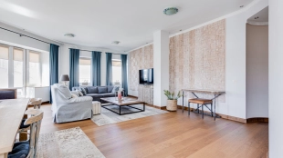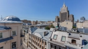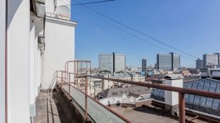 A 2-bedroom apartment with a total area of 150 m² in a house on the Old Arbat on the last 8th floor. Designer renovation with the use of natural wood. The interior is decorated in light colors, the floors are laid with wooden board. The apartment is fully equipped with upholstered furniture and household appliances. Ceiling height is 3.2 meters. The windows overlook Novy Arbat, the Foreign Ministry building and a quiet courtyard.