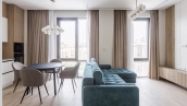 Spacious bright 2-bedroom apartment with a total area of 80 m² in Fili City complex in Filiovsky Park neighborhood. It has a premium modern finish, panoramic floor-to-ceiling windows, lots of natural light. Layout: living room-dining room-kitchen, two bedrooms, bathroom with double sink and shower, guest bathroom, laundry room, dressing room, hall. The apartment is fully equipped with modern furniture, appliances, dishes, linens. In the living room there is an air conditioning system, washing machine and dishwasher. From the windows there is a view of the city, "Moscow City", the territory of the complex. It is possible to rent a parking space in the underground parking lot.