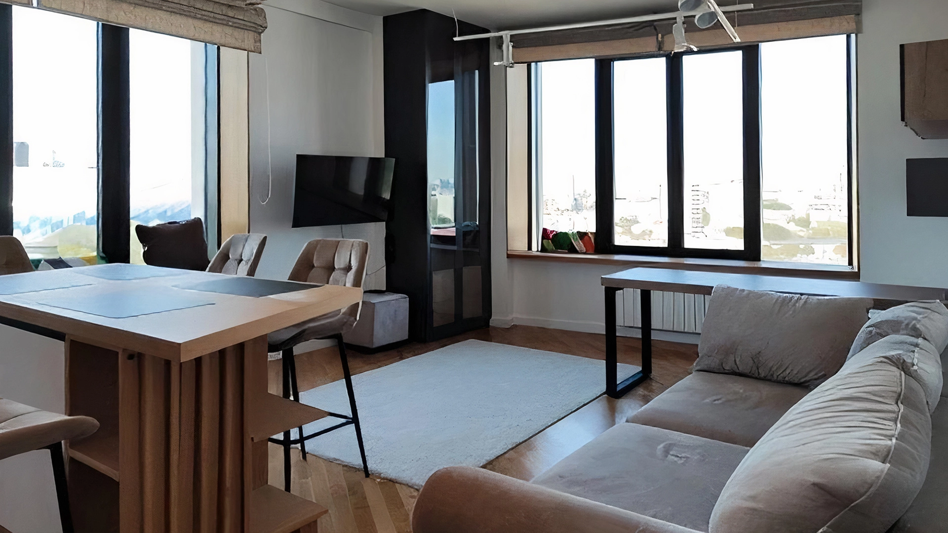 View 1-bedroom apartment with an area of 66 m² in a premium-class complex "VTB Arena Park" on the 15th floor. Designer finishing in modern style in laconic light colors. Large windows and 3.2 meters high ceilings fill the space with light. Planned corner kitchen-living room, bedroom, dressing room, bathroom with shower, hallway. The apartments are fully furnished and equipped with household appliances. The bathrooms are equipped with European-made sanitary ware. The windows offer panoramic views of the city and VTB Arena stadium.