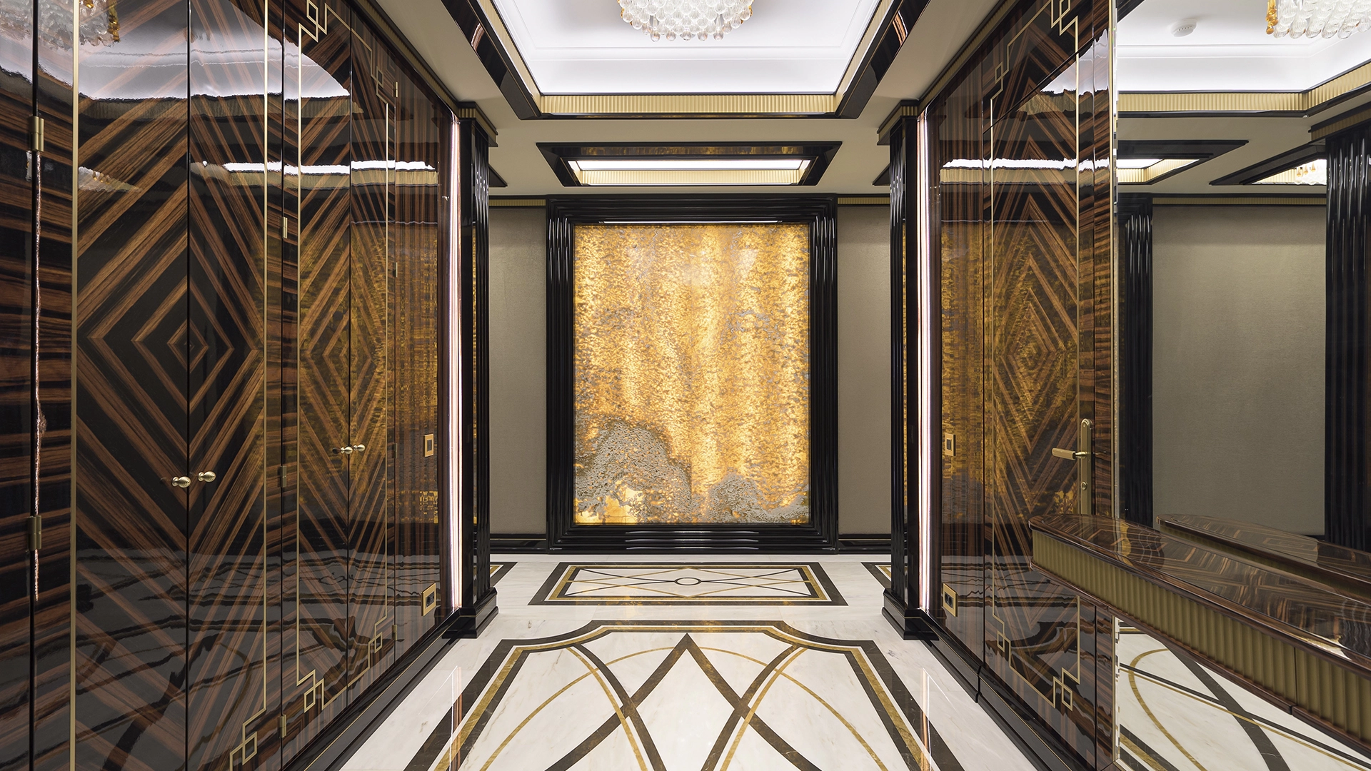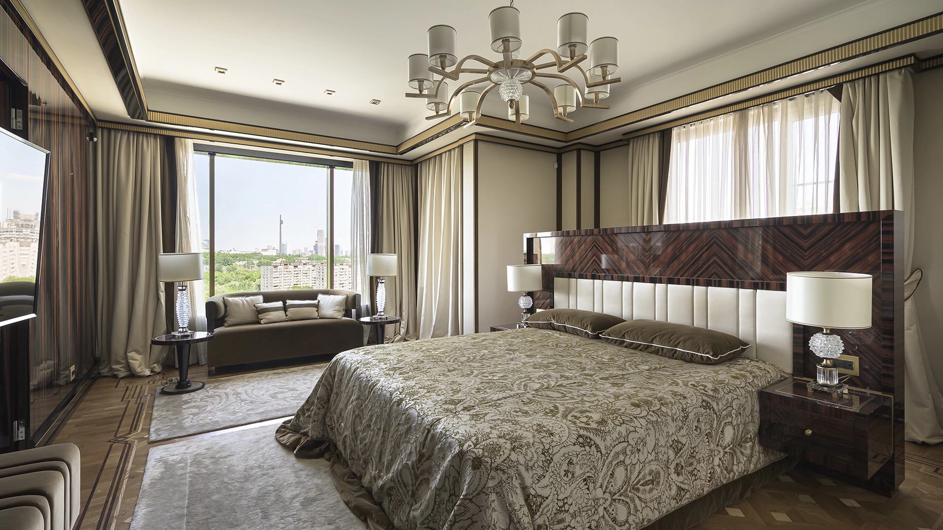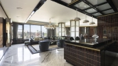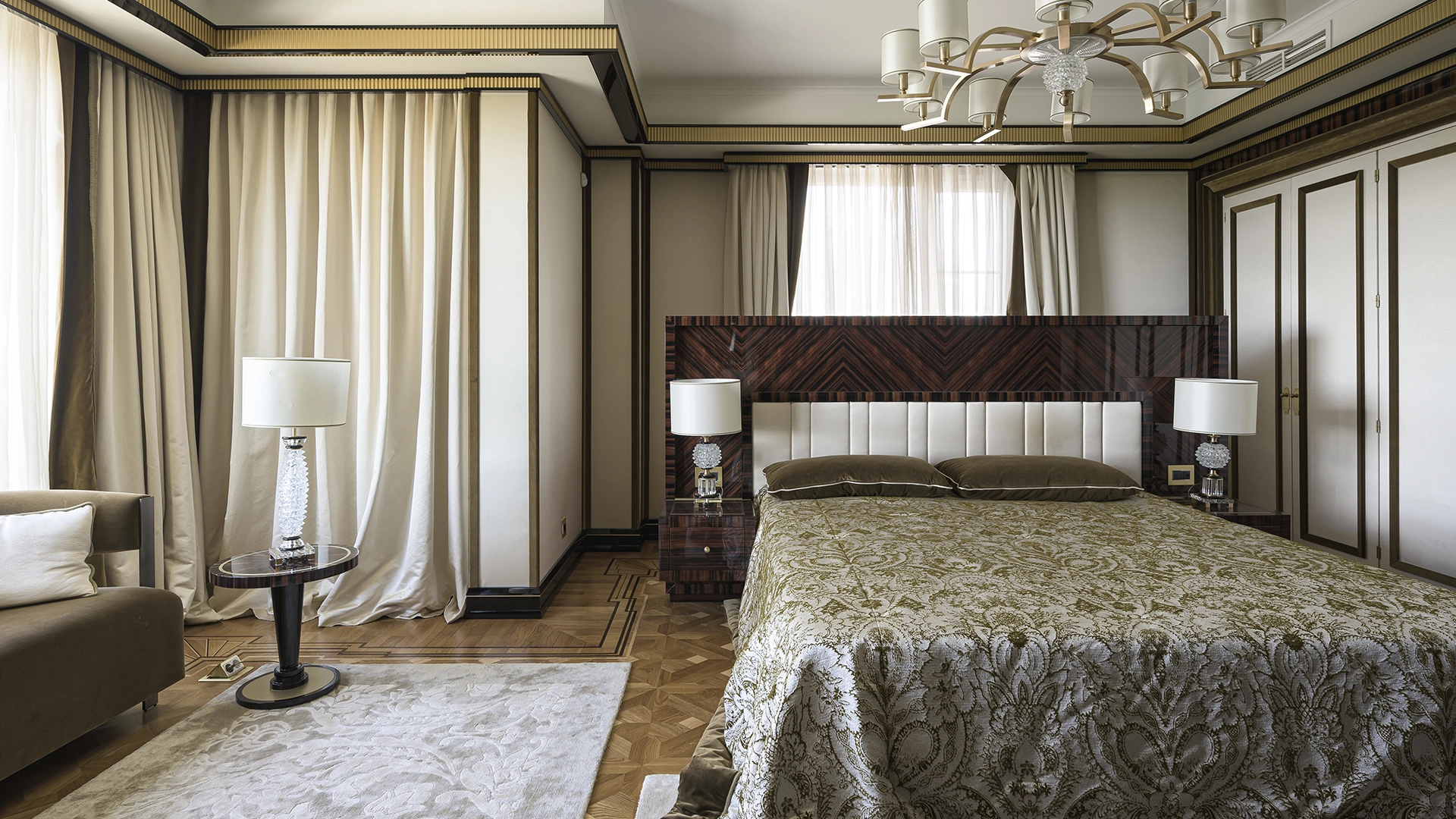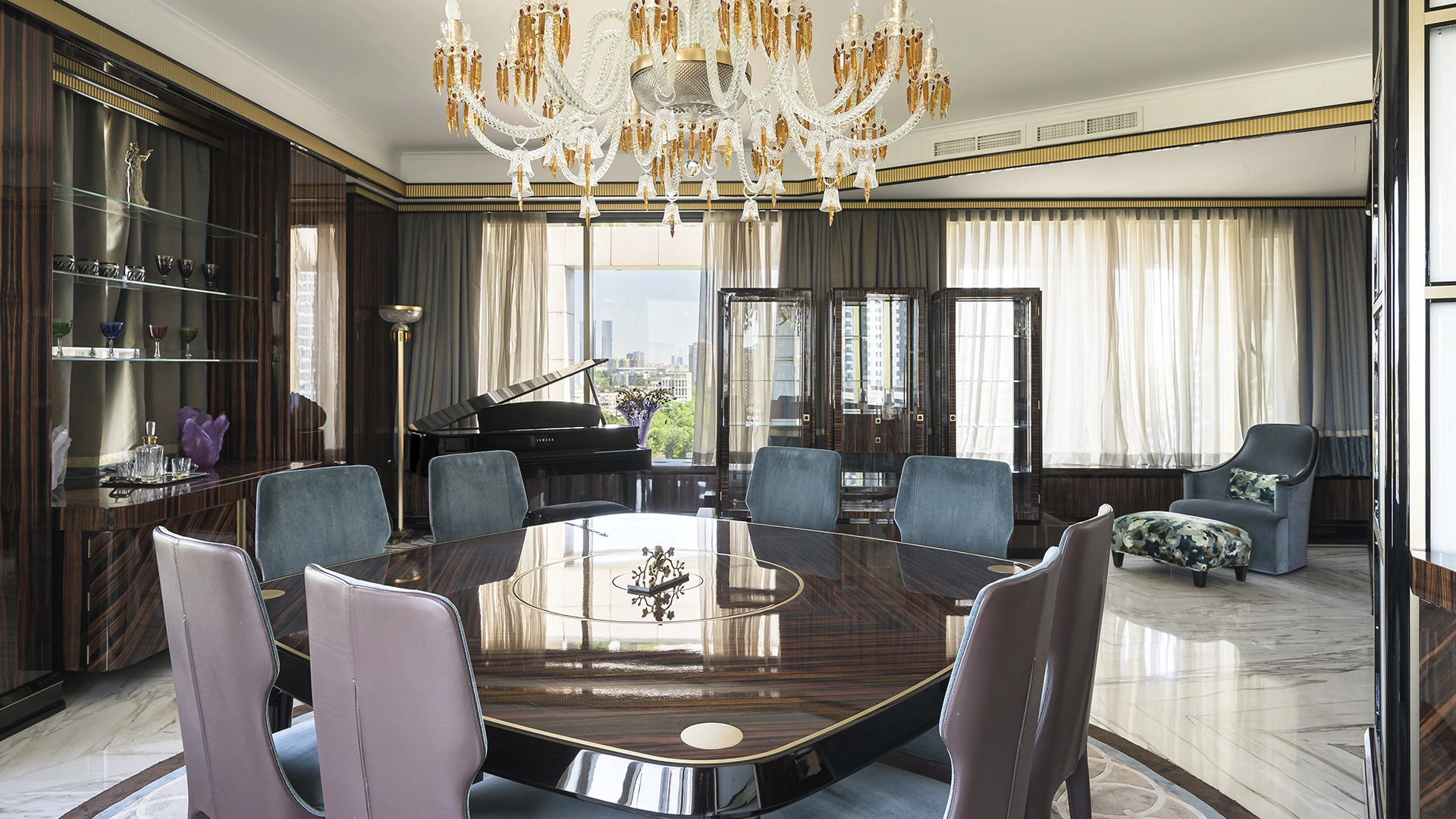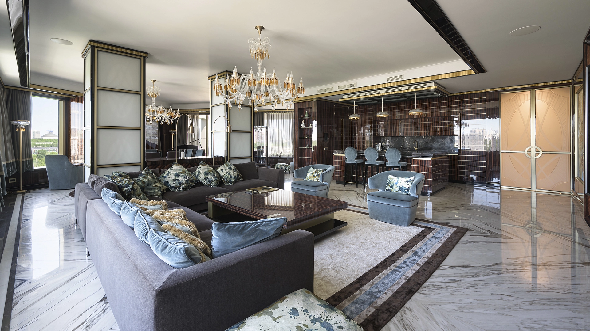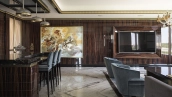 Designer apartment of 257 m² with interior by Italian design bureau Andrea Mingotti in a premium-class house Lake House on the bank of Mosfilmovsky pond in the south-west of Moscow. Premium materials, natural leather, ebony, bronze, brass, natural stone - onyx, marble, quartz, agate - are used in the finishing. The windows offer mesmerizing views of Mosfilmovsky pond, Victory Park and the skyscrapers of Moscow City.