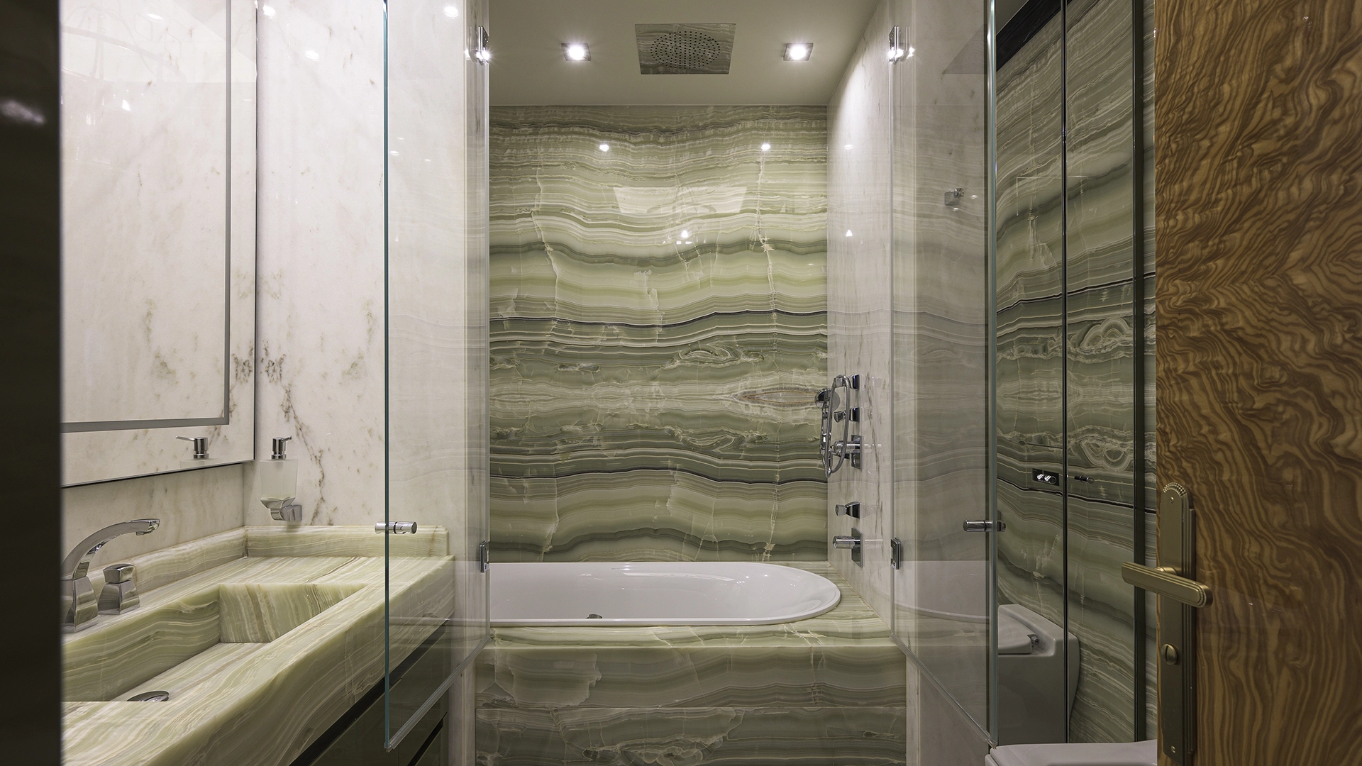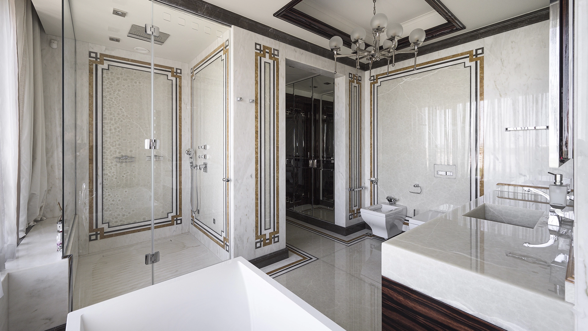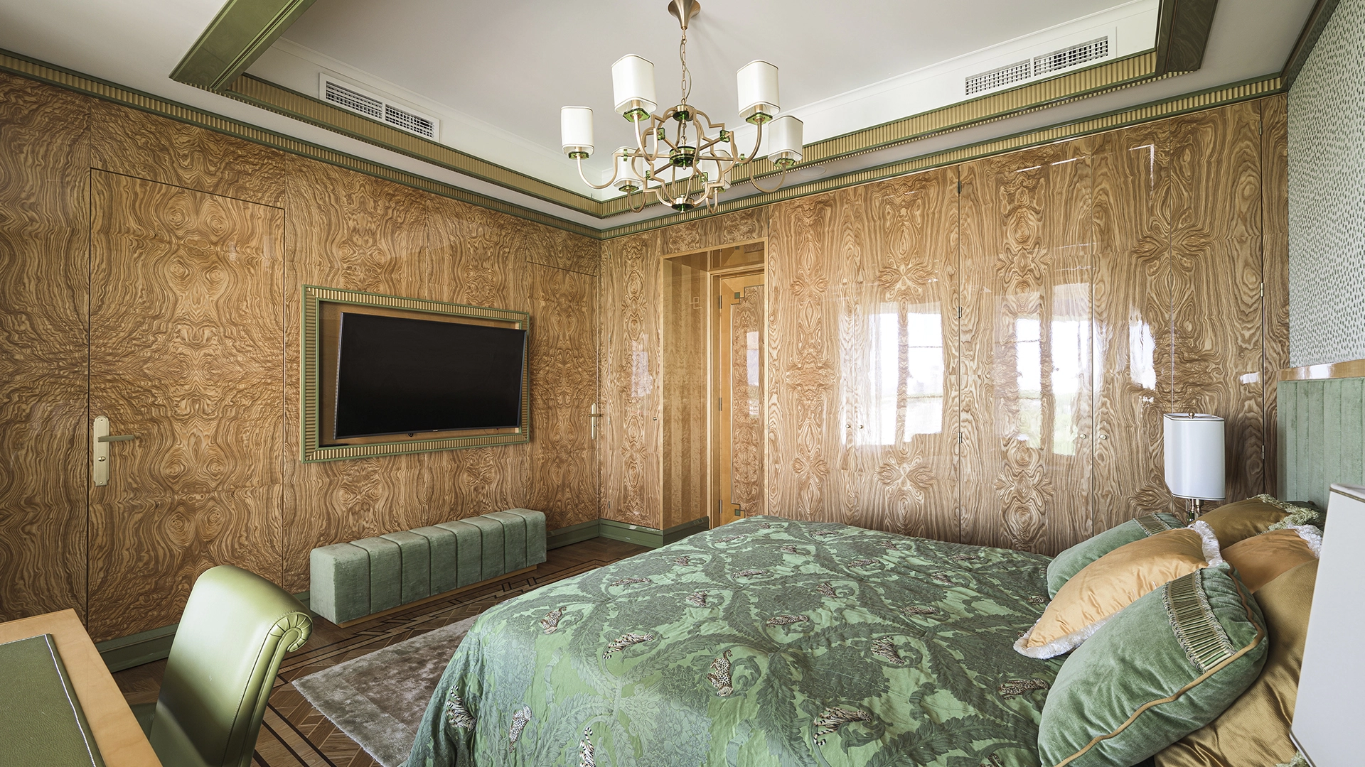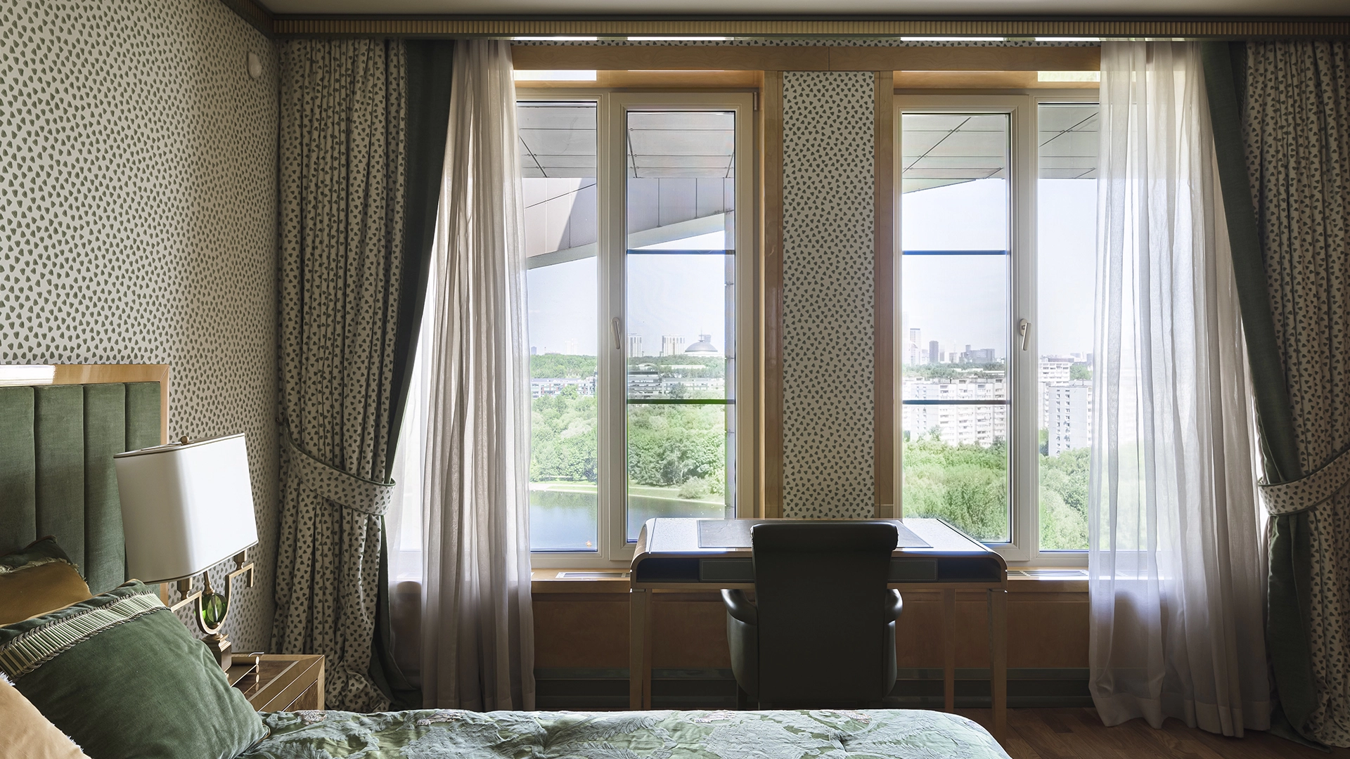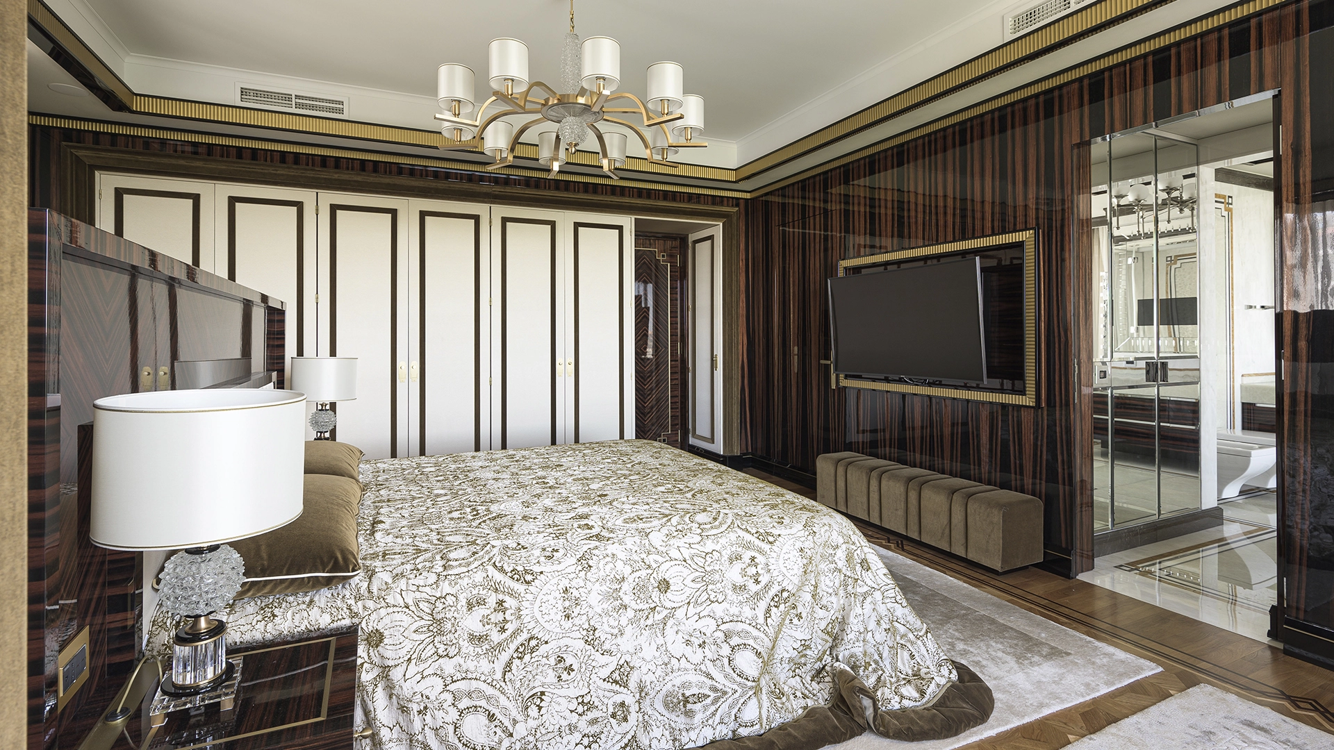 Designer apartment of 257 m² with interior by Italian design bureau Andrea Mingotti in a premium-class house Lake House on the bank of Mosfilmovsky pond in the south-west of Moscow. Premium materials, natural leather, ebony, bronze, brass, natural stone - onyx, marble, quartz, agate - are used in the finishing. The windows offer mesmerizing views of Mosfilmovsky pond, Victory Park and the skyscrapers of Moscow City.