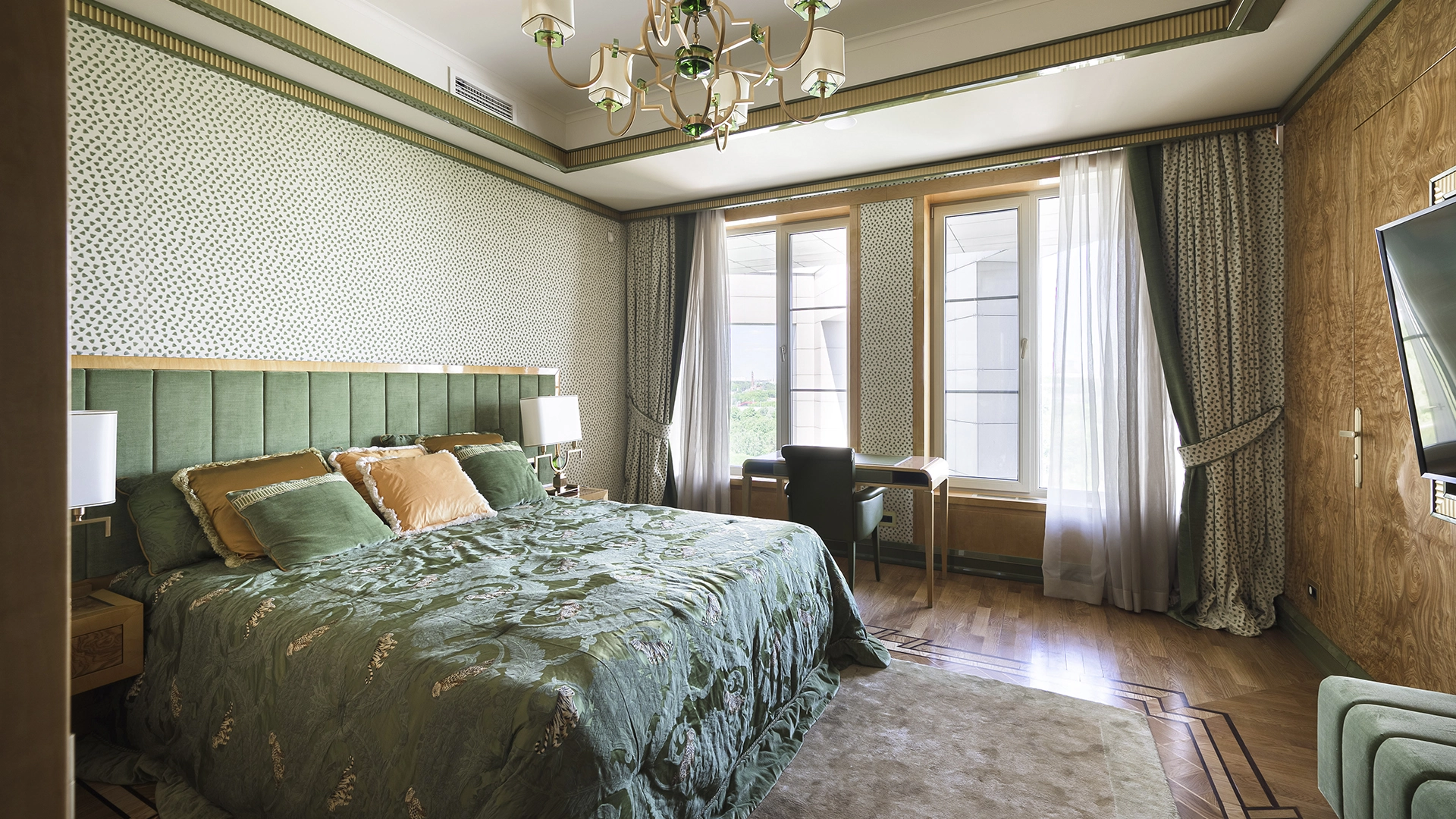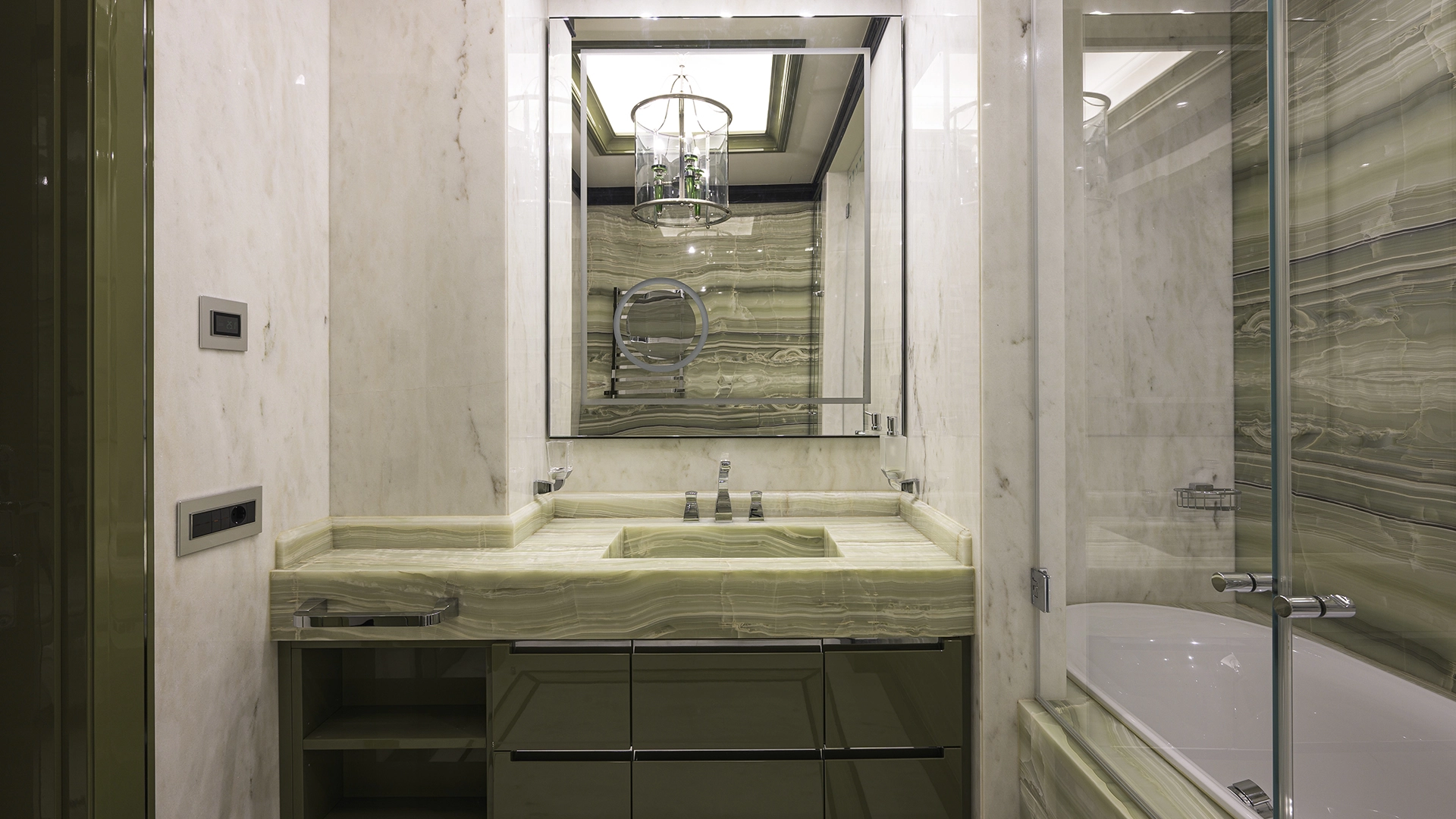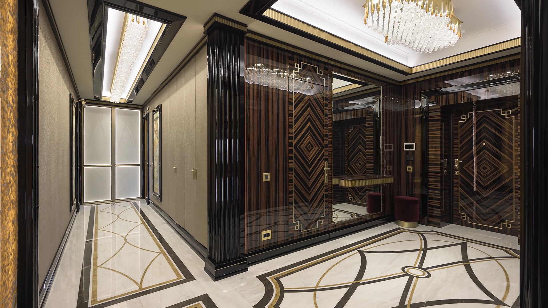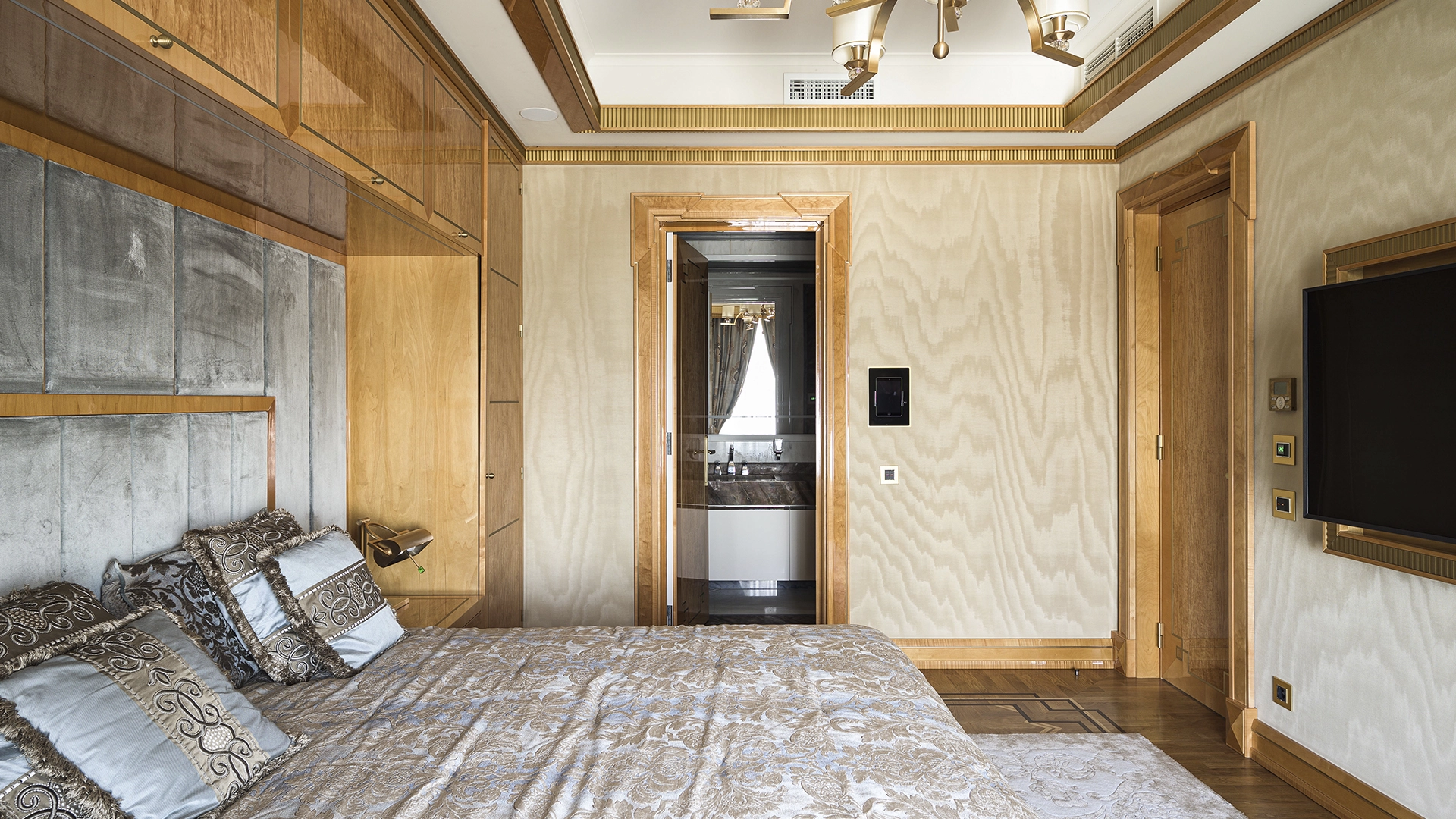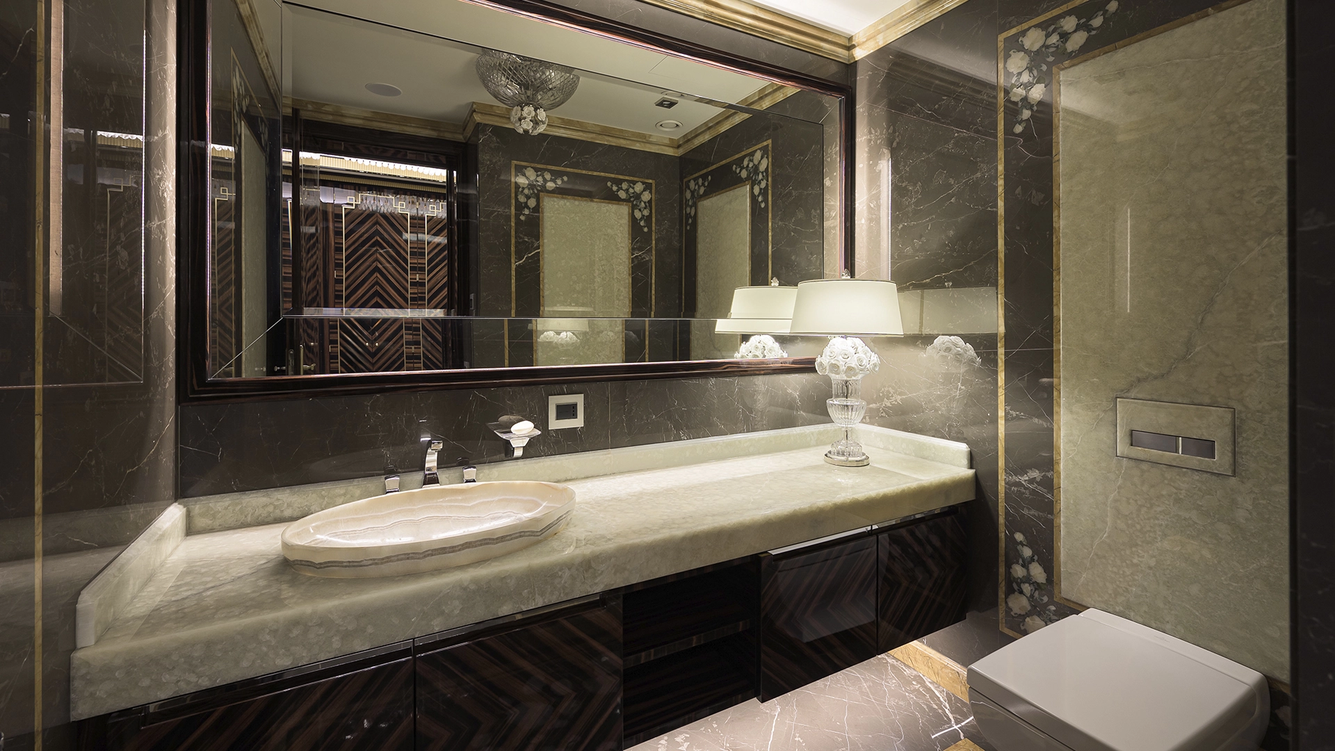 Designer apartment of 257 m² with interior by Italian design bureau Andrea Mingotti in a premium-class house Lake House on the bank of Mosfilmovsky pond in the south-west of Moscow. Premium materials, natural leather, ebony, bronze, brass, natural stone - onyx, marble, quartz, agate - are used in the finishing. The windows offer mesmerizing views of Mosfilmovsky pond, Victory Park and the skyscrapers of Moscow City.