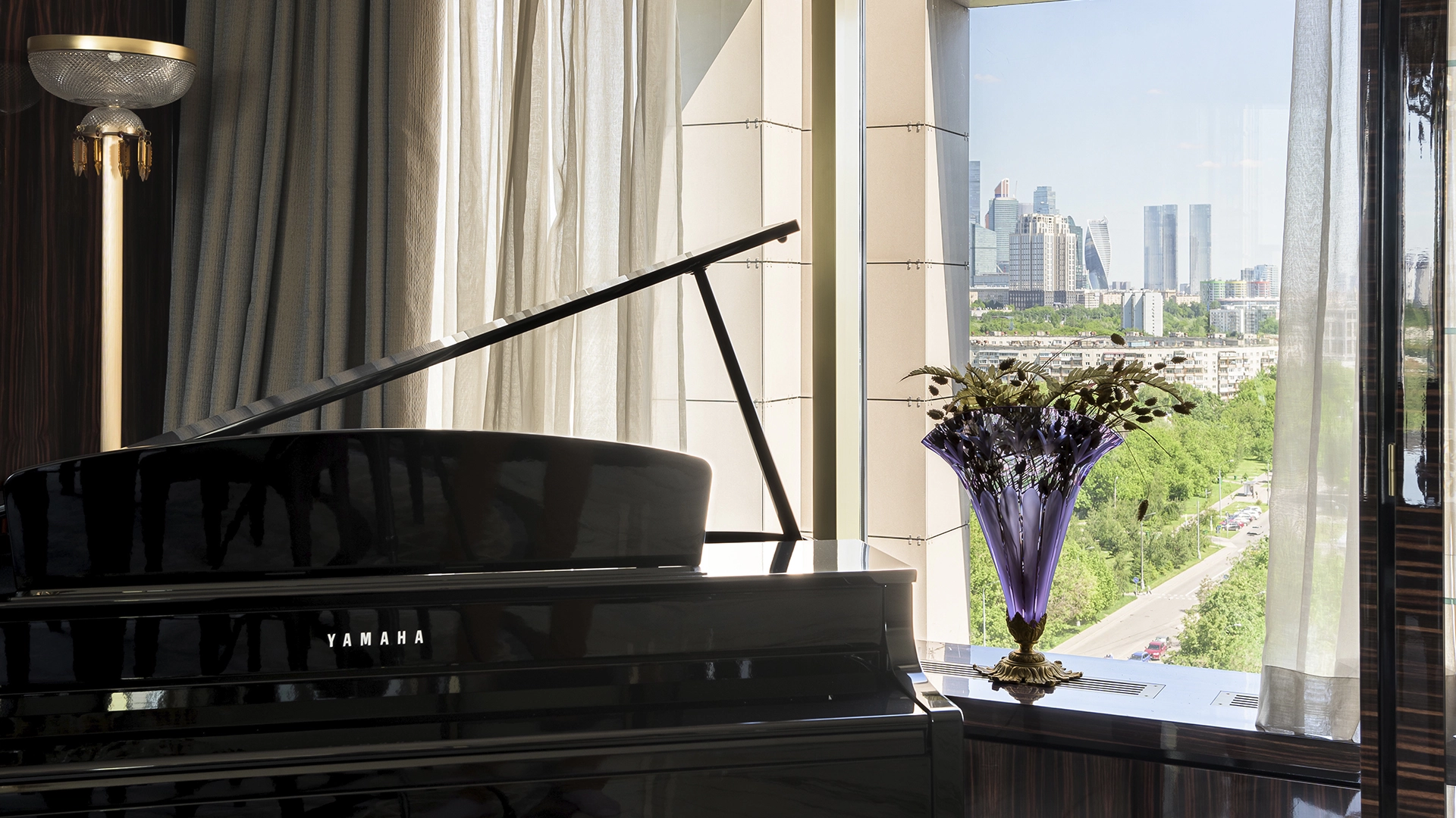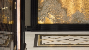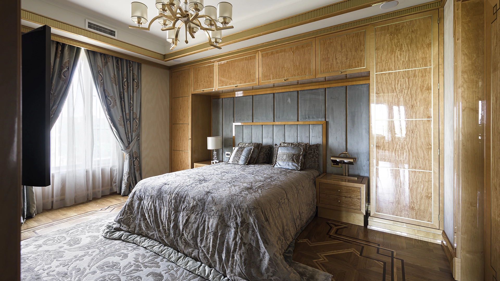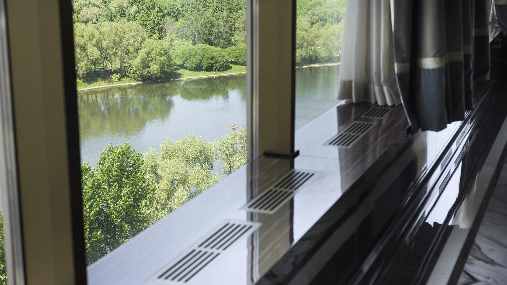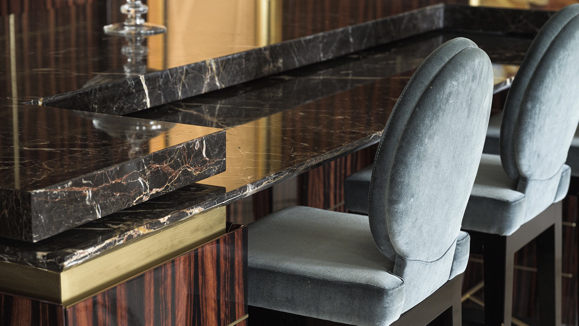 Designer apartment of 257 m² with interior by Italian design bureau Andrea Mingotti in a premium-class house Lake House on the bank of Mosfilmovsky pond in the south-west of Moscow. Premium materials, natural leather, ebony, bronze, brass, natural stone - onyx, marble, quartz, agate - are used in the finishing. The windows offer mesmerizing views of Mosfilmovsky pond, Victory Park and the skyscrapers of Moscow City.