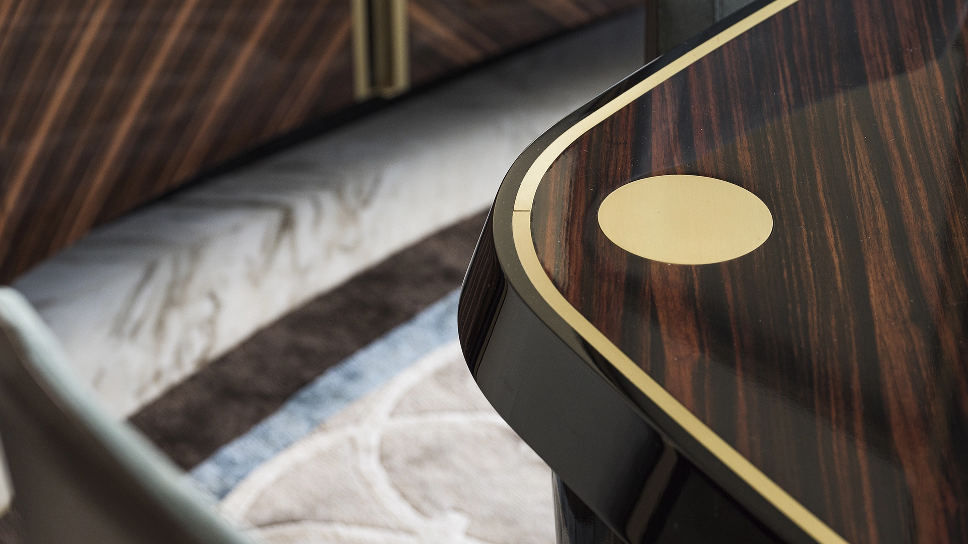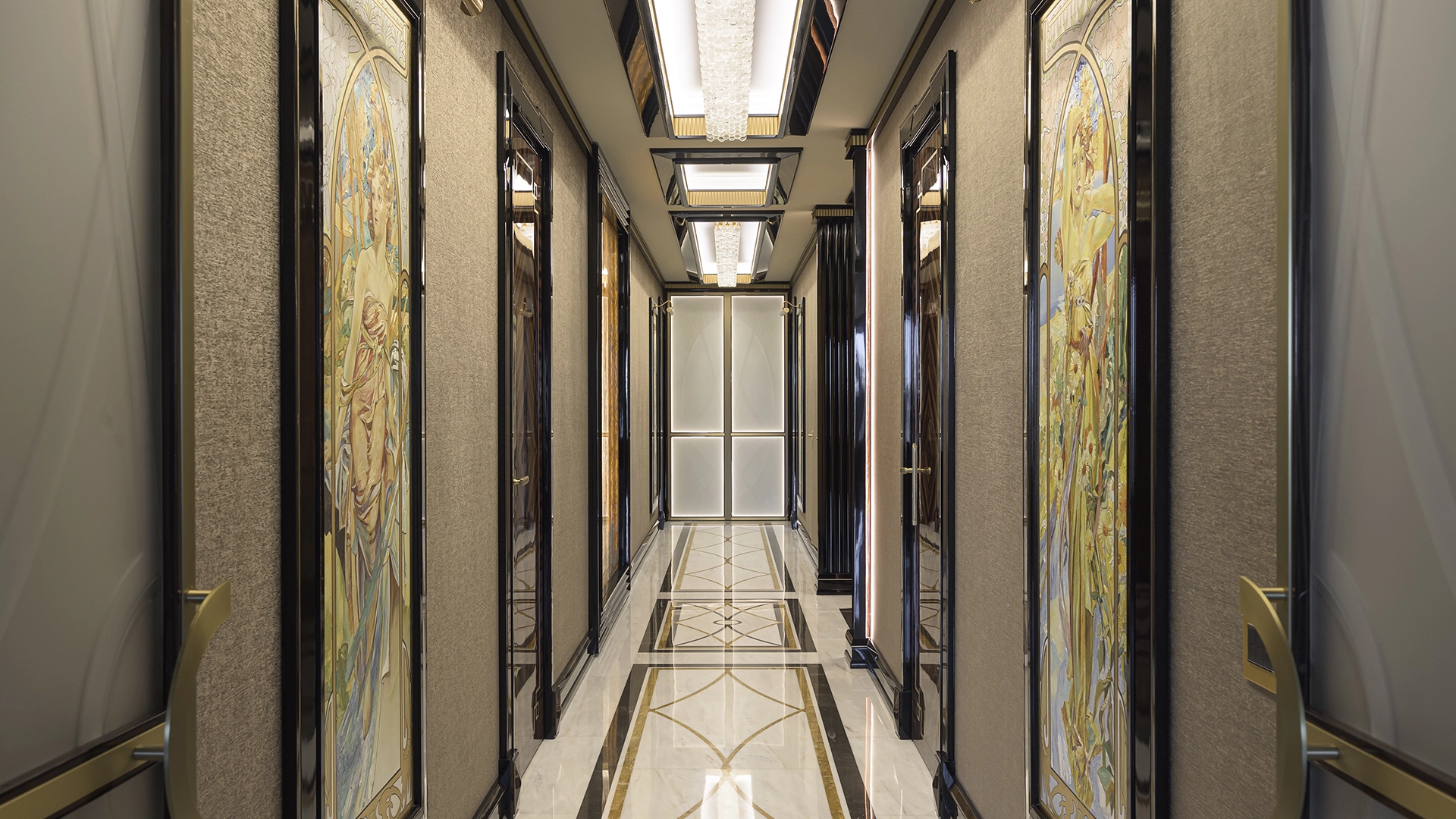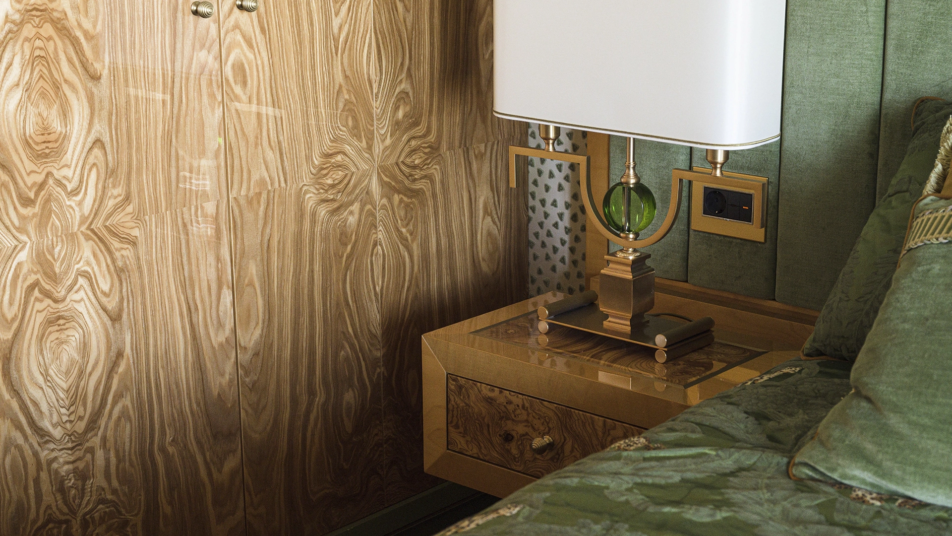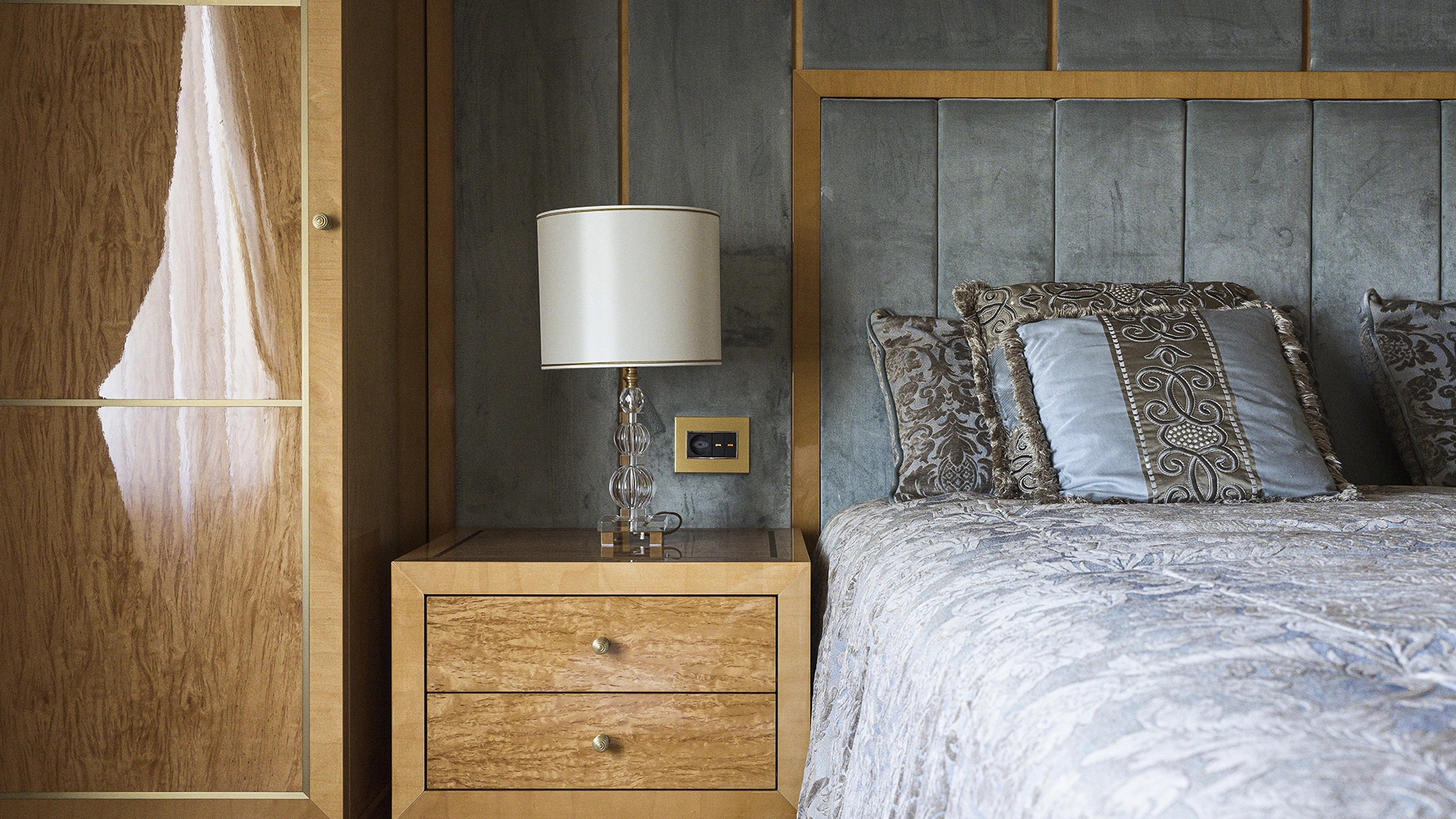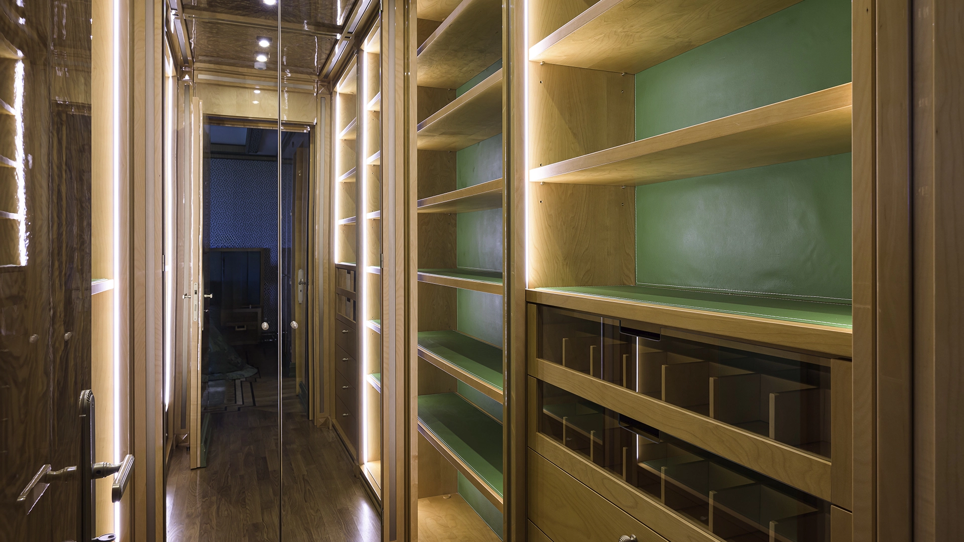 Designer apartment of 257 m² with interior by Italian design bureau Andrea Mingotti in a premium-class house Lake House on the bank of Mosfilmovsky pond in the south-west of Moscow. Premium materials, natural leather, ebony, bronze, brass, natural stone - onyx, marble, quartz, agate - are used in the finishing. The windows offer mesmerizing views of Mosfilmovsky pond, Victory Park and the skyscrapers of Moscow City.