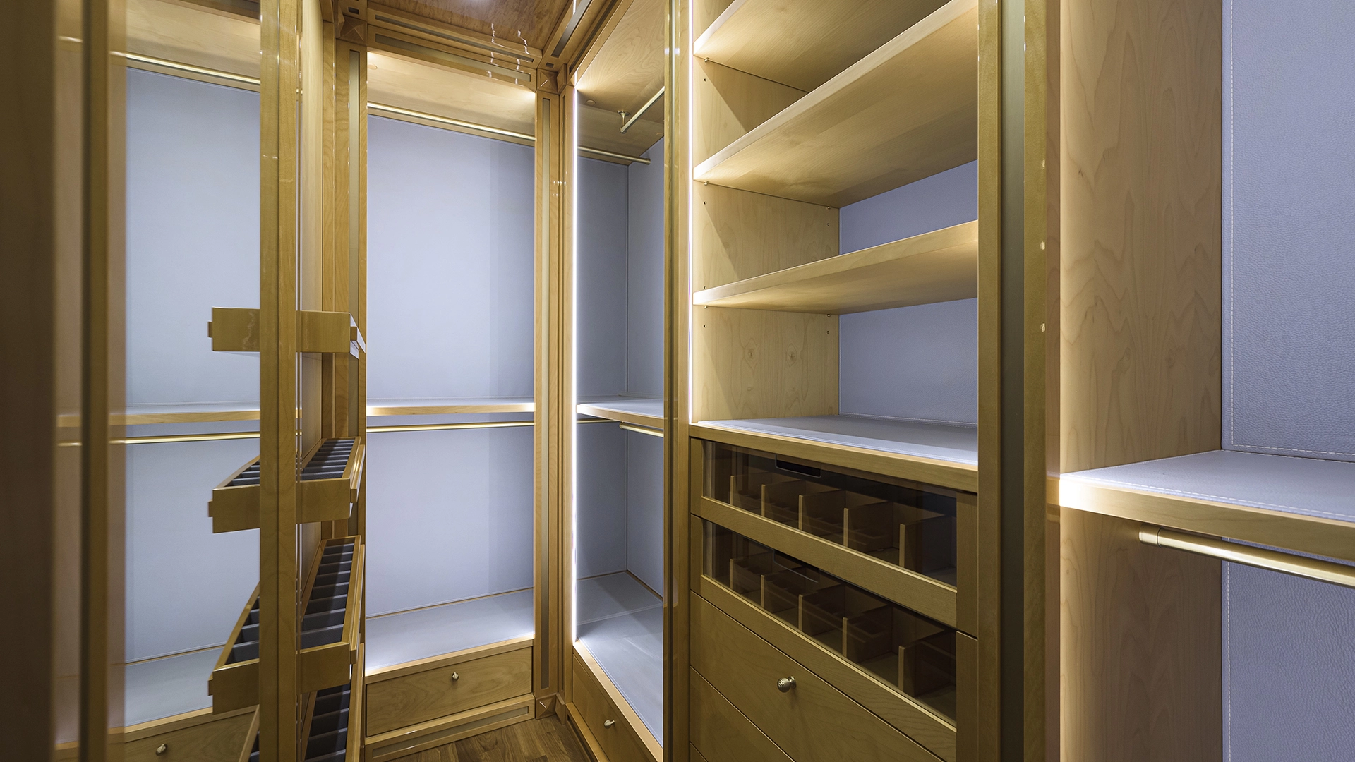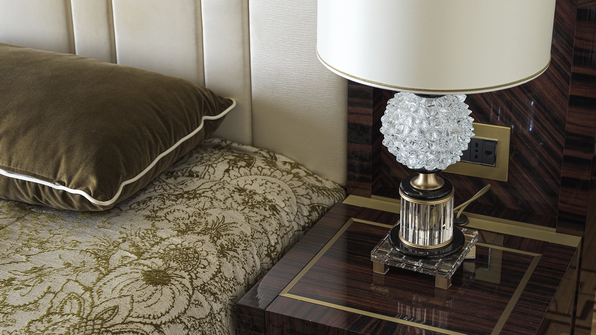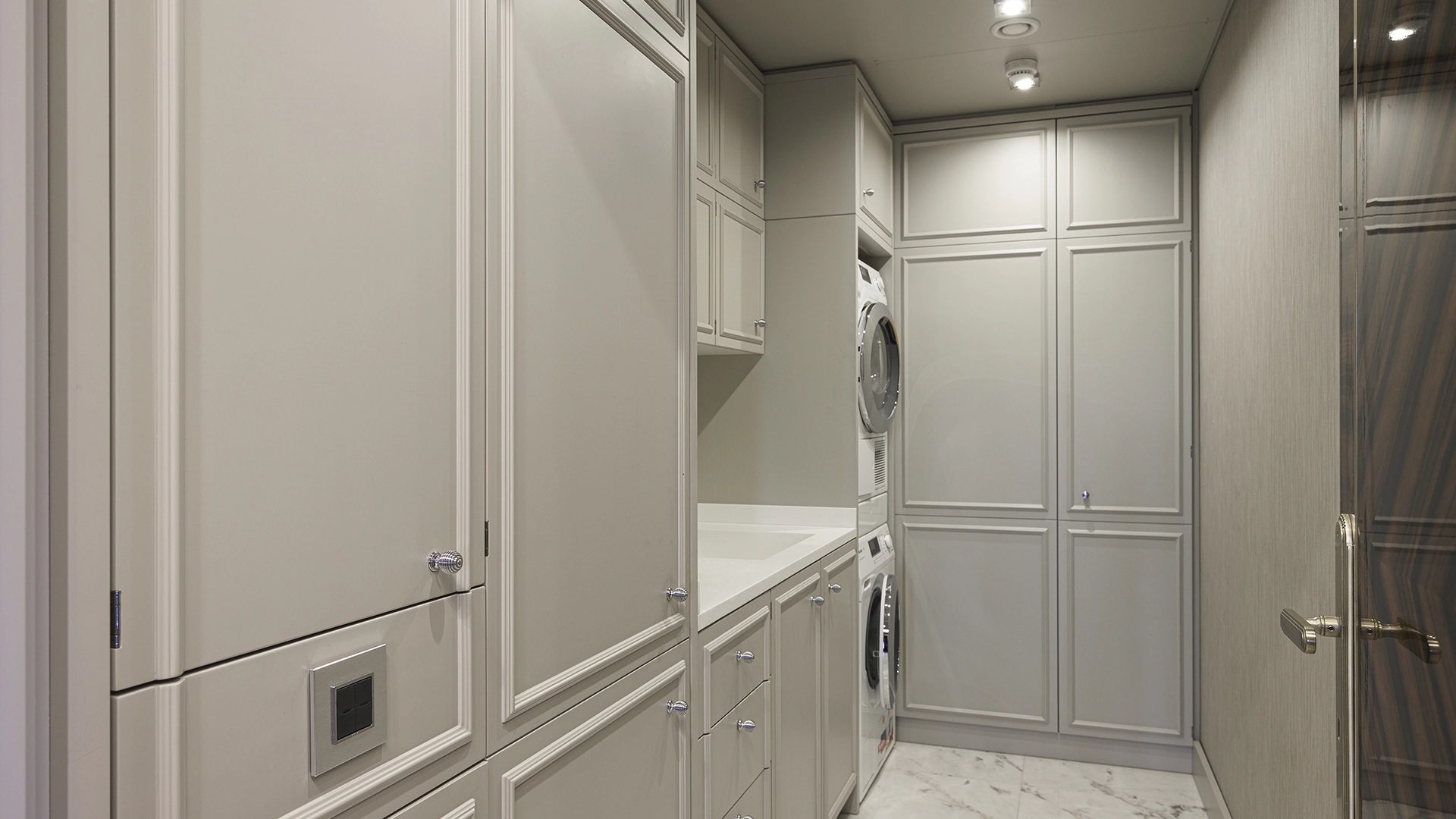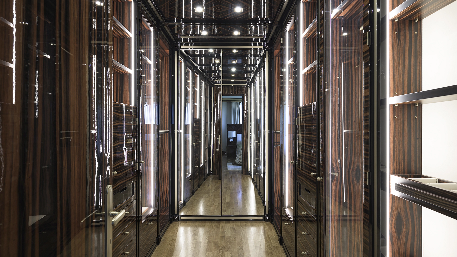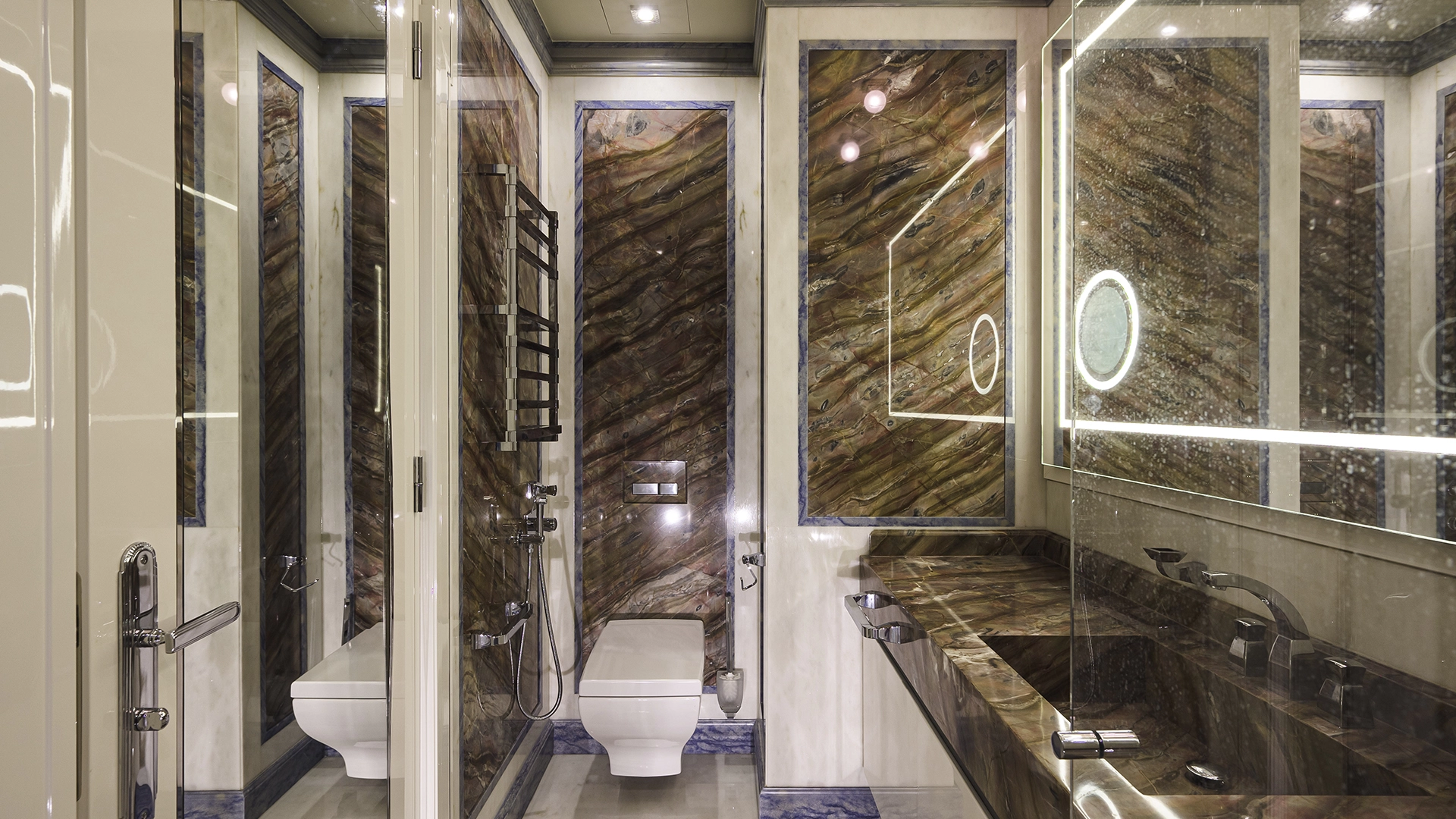 Designer apartment of 257 m² with interior by Italian design bureau Andrea Mingotti in a premium-class house Lake House on the bank of Mosfilmovsky pond in the south-west of Moscow. Premium materials, natural leather, ebony, bronze, brass, natural stone - onyx, marble, quartz, agate - are used in the finishing. The windows offer mesmerizing views of Mosfilmovsky pond, Victory Park and the skyscrapers of Moscow City.