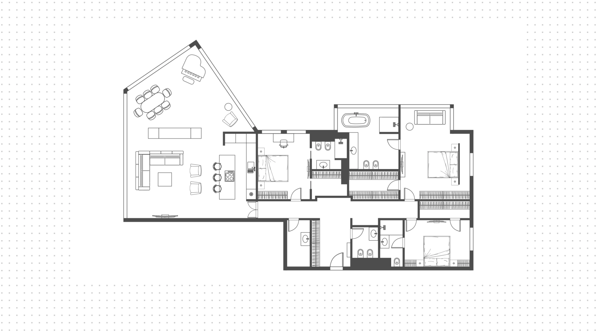 The space is divided into a spacious kitchen-living room with panoramic windows on 3 sides of the world and a private area with 3 bedrooms, each with its own bathroom and dressing room. The apartment is fully equipped with custom-made furniture. Premium appliances, laundry room with washer and dryer. Installed system "smart home", supply and exhaust ventilation, air conditioning, water purification system, security sensors and alarm system. Two parking spaces in the underground parking are included in the rent.