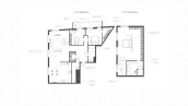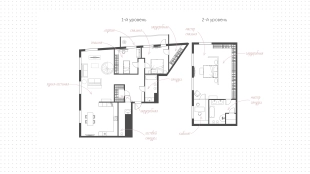 1st floor: living room, kitchen-dining room, bedroom with dressing room, children's bedroom, guest bathroom with boiler, washing machine and dryer. 2nd floor: master bedroom with a large dressing room, its own bathroom with bath and shower, study. In total there are 3 bathrooms including shower, bathtub and bidet. Air conditioning system, supply and exhaust ventilation is installed. Along the whole apartment is planned a spacious loggia. Additionally there are 3 parking places.