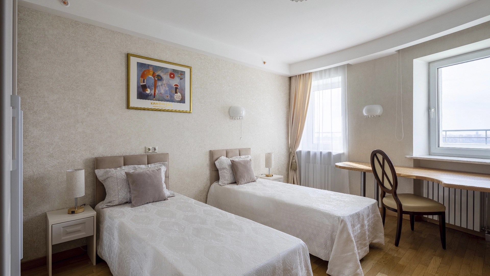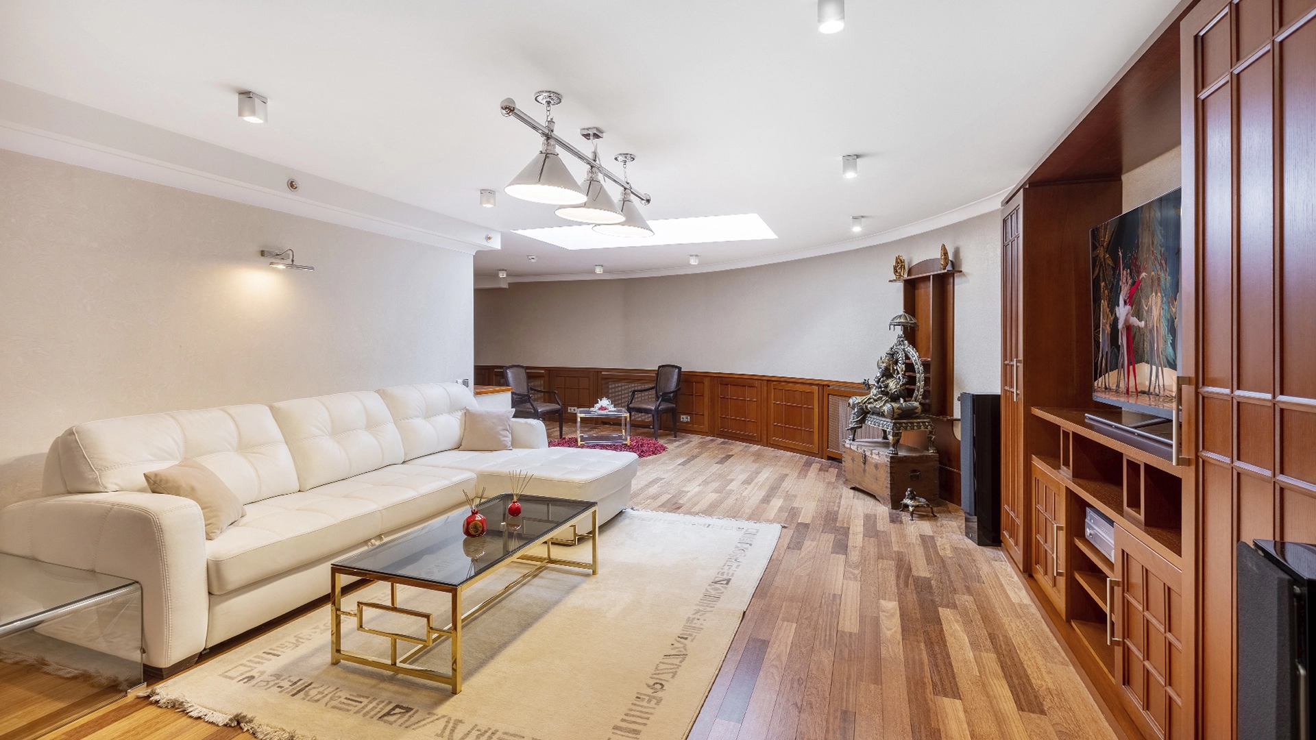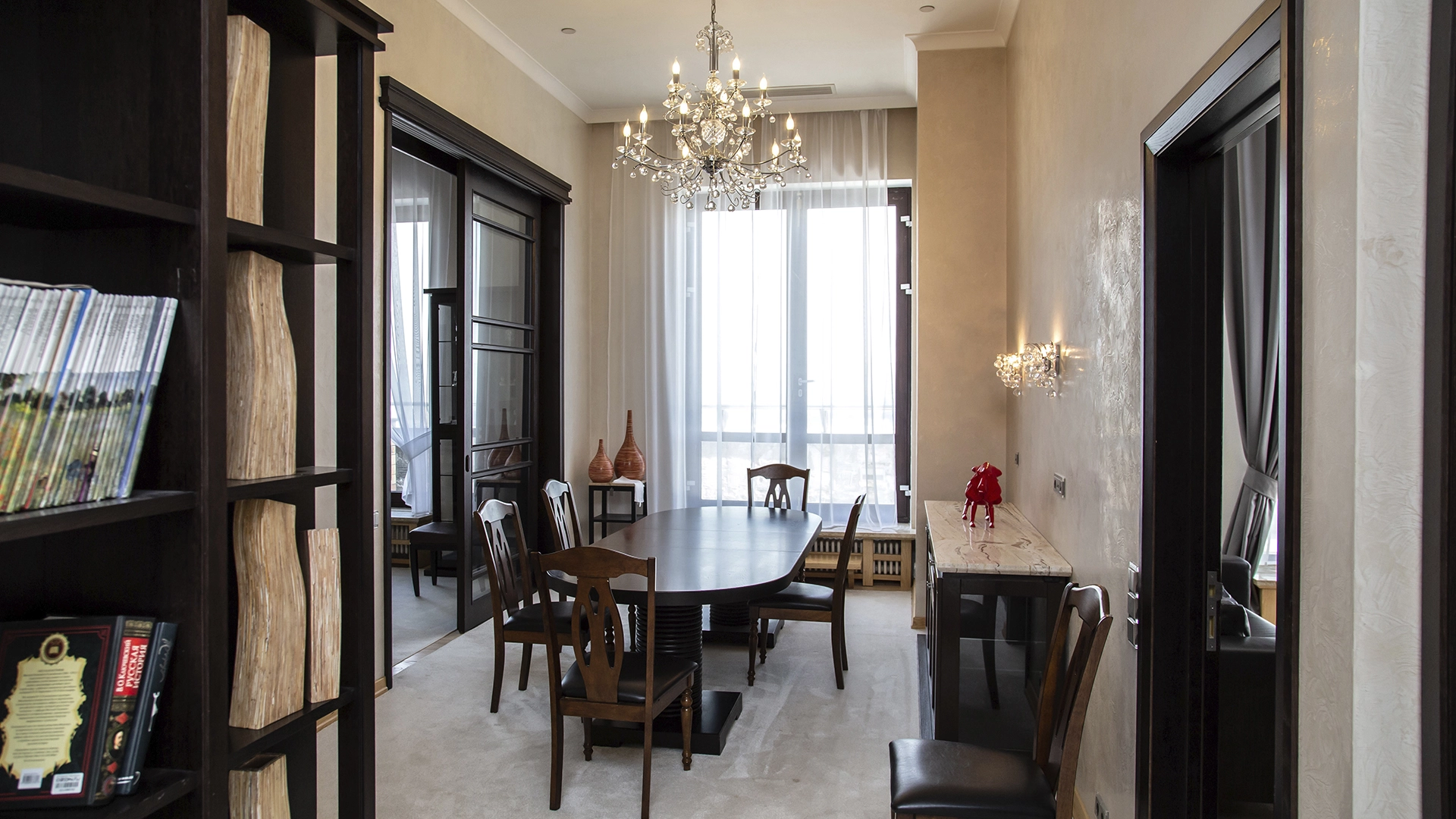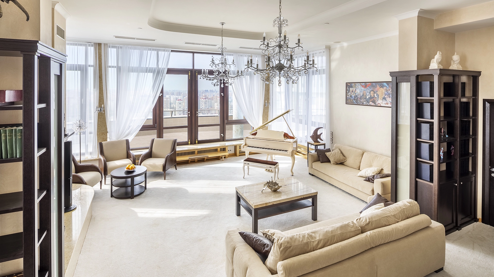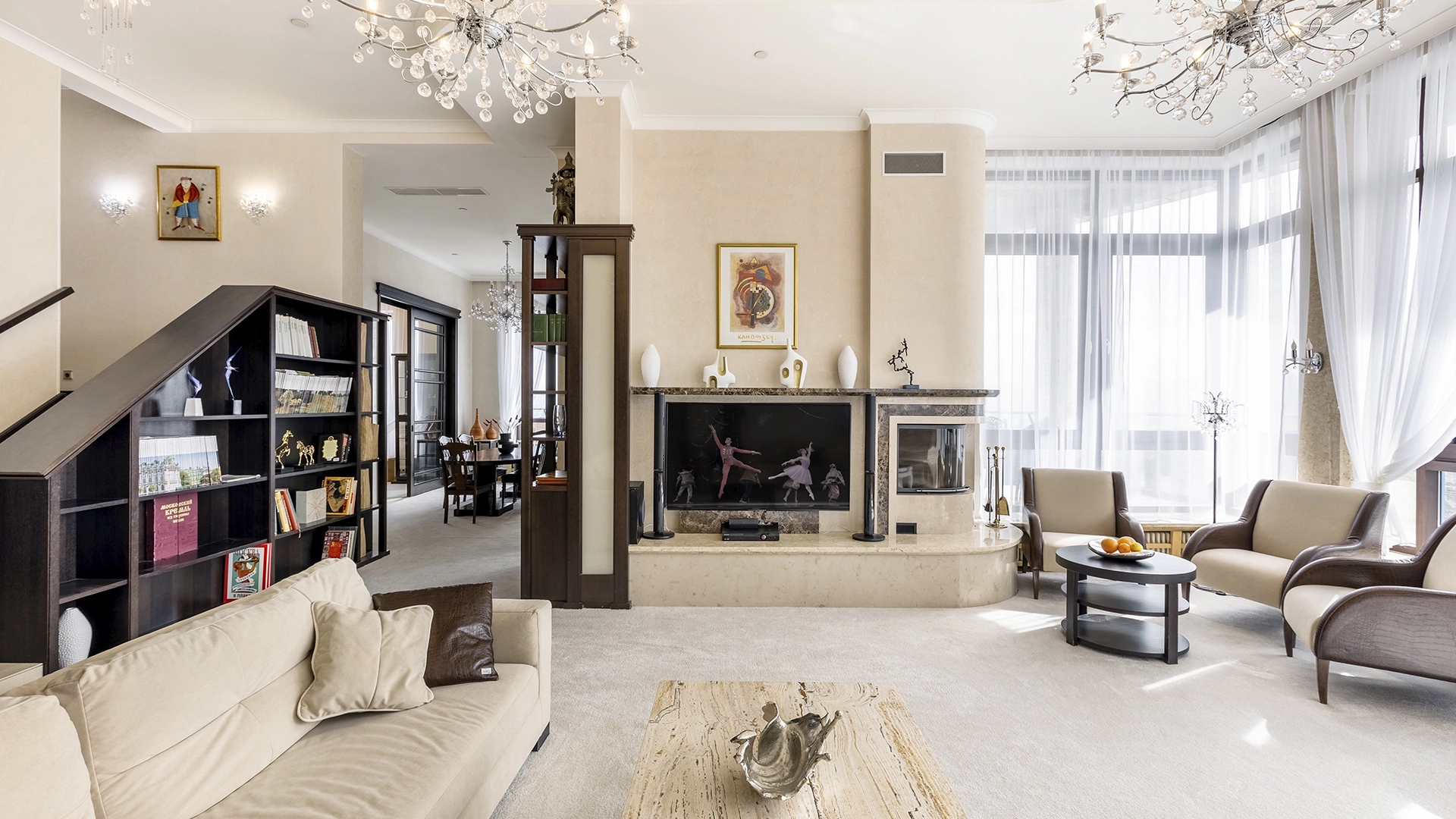 A 3-bedroom apartment with a total area of 500 m² in the premium-class residential complex "Vorobyovy Gory". The interior is decorated in laconic light beige colors, natural materials are used in the finishing. The spacious living room with a bay window has a grand piano, a fireplace and a large sofa. One of the bedrooms is equipped as a study. The kitchen is equipped with all necessary appliances. The second bedroom has an individual bathroom and a dressing room.
