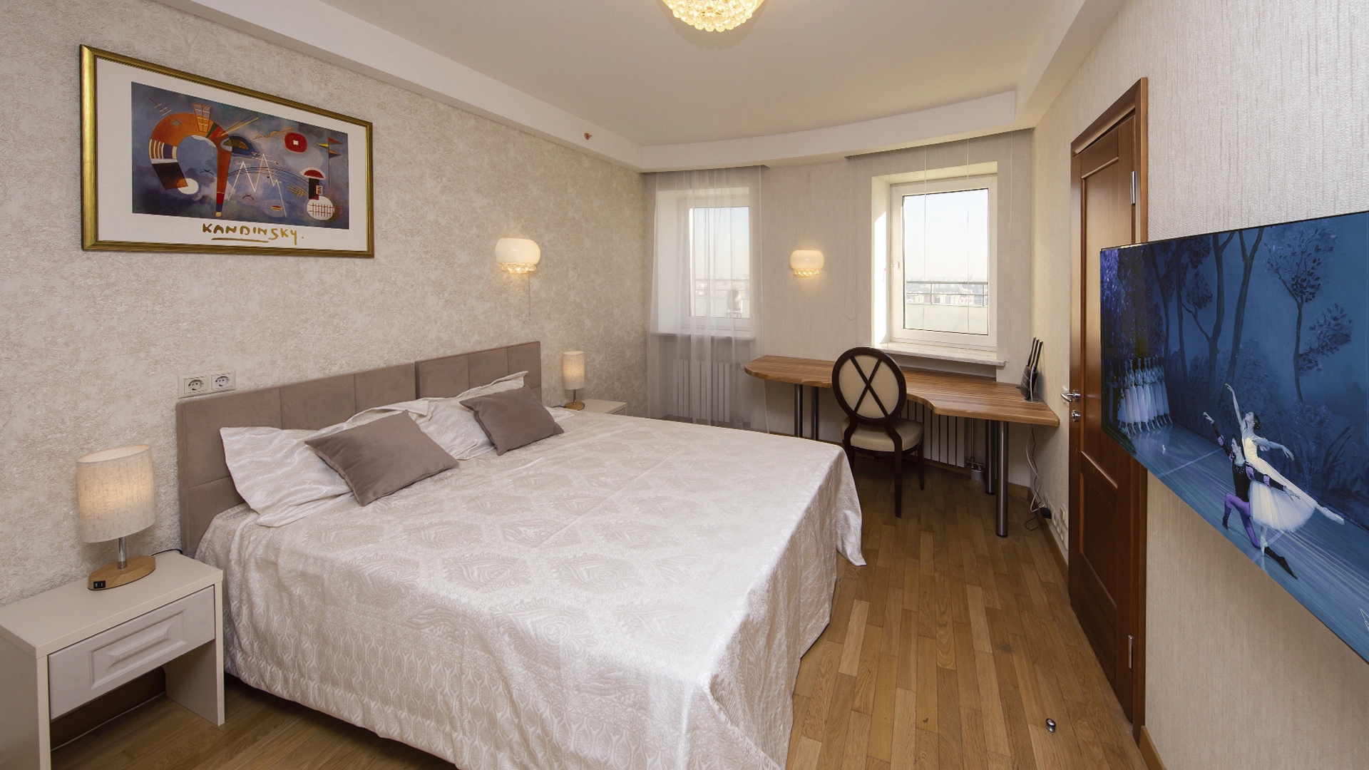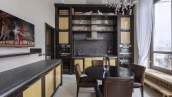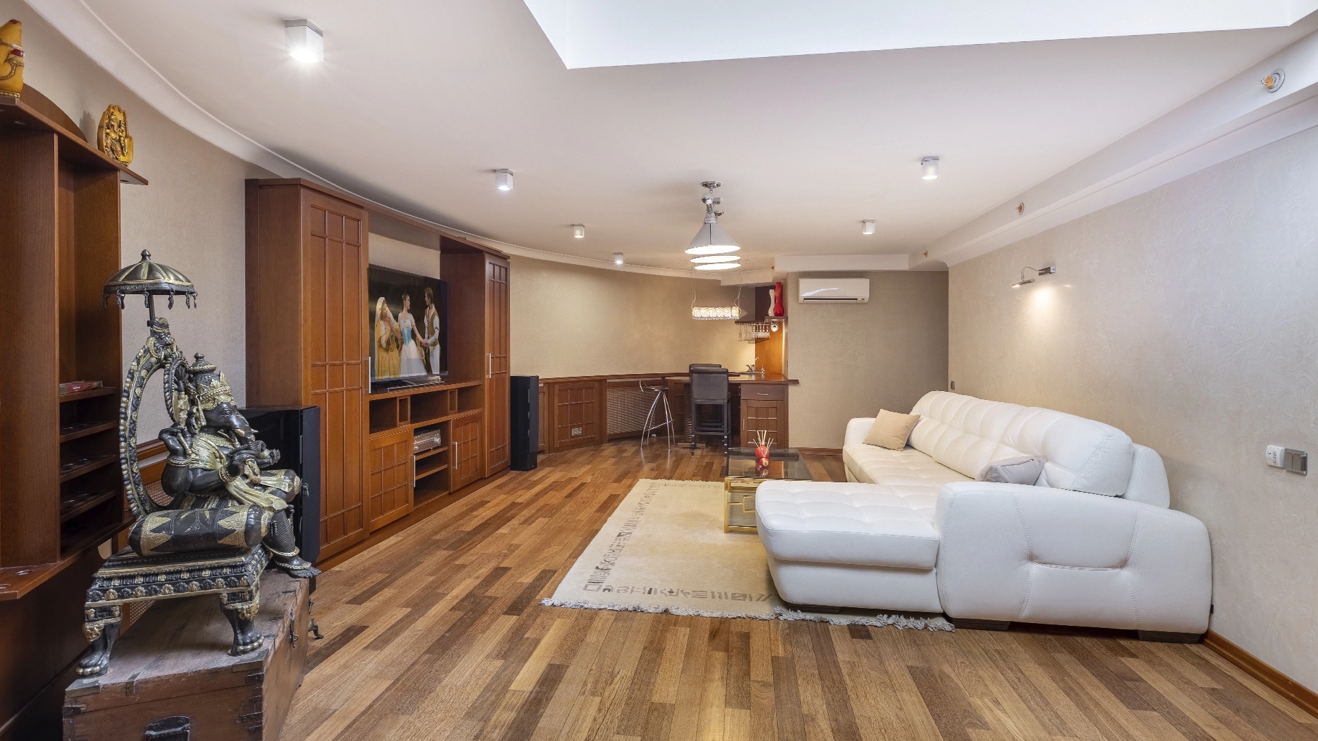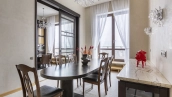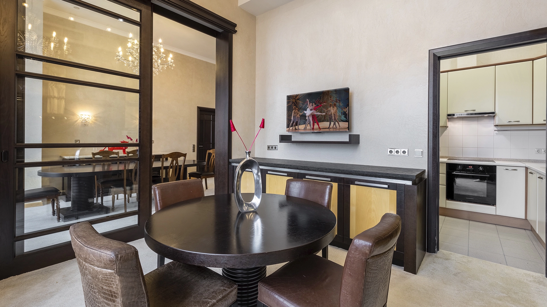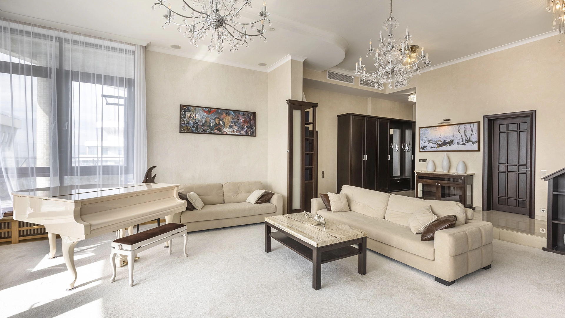 A 3-bedroom apartment with a total area of 500 m² in the premium-class residential complex "Vorobyovy Gory". The interior is decorated in laconic light beige colors, natural materials are used in the finishing. The spacious living room with a bay window has a grand piano, a fireplace and a large sofa. One of the bedrooms is equipped as a study. The kitchen is equipped with all necessary appliances. The second bedroom has an individual bathroom and a dressing room.