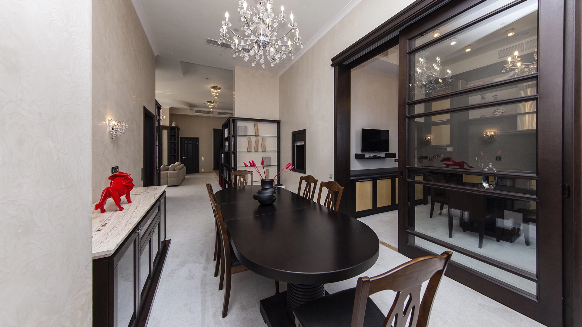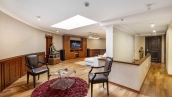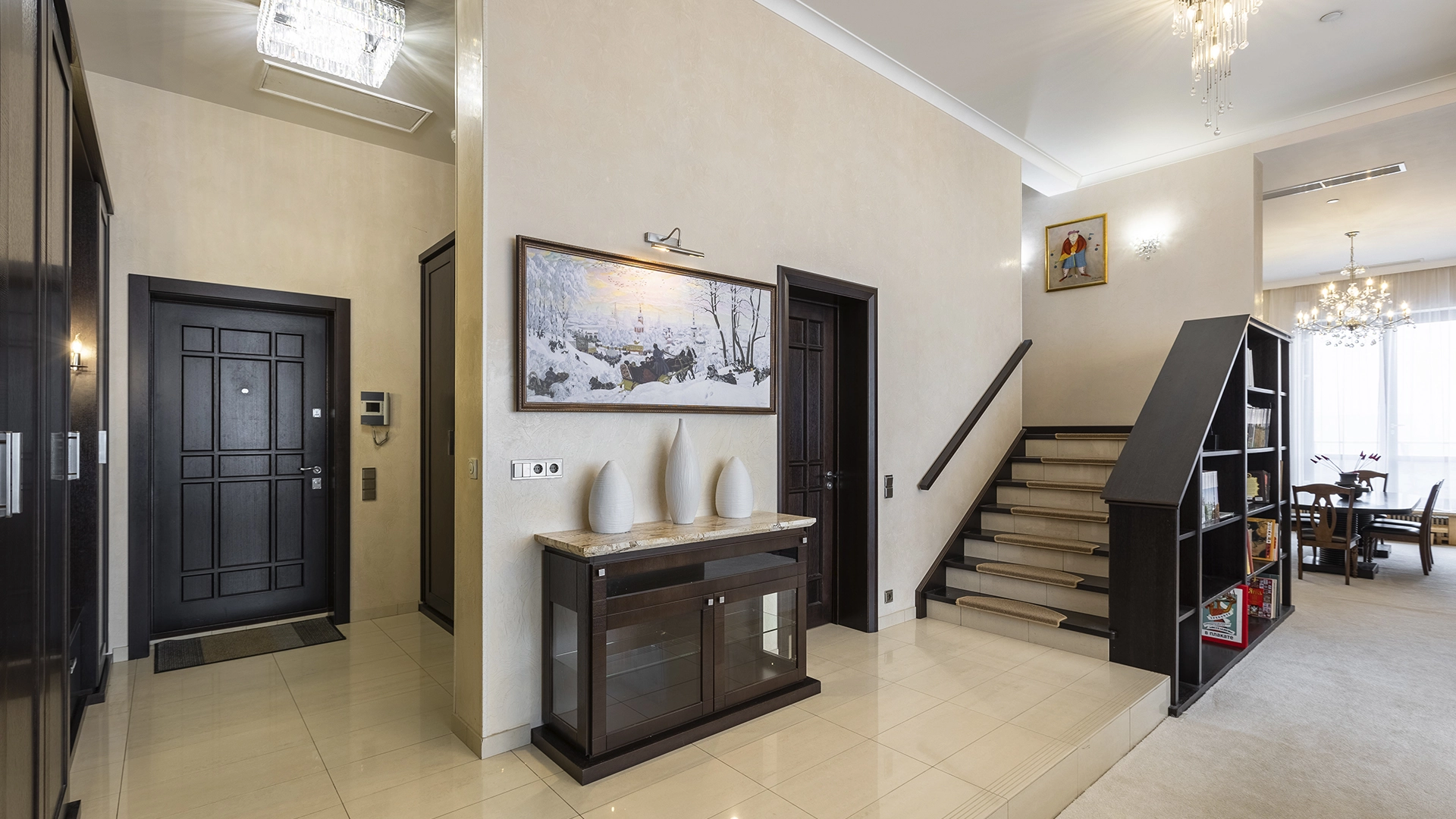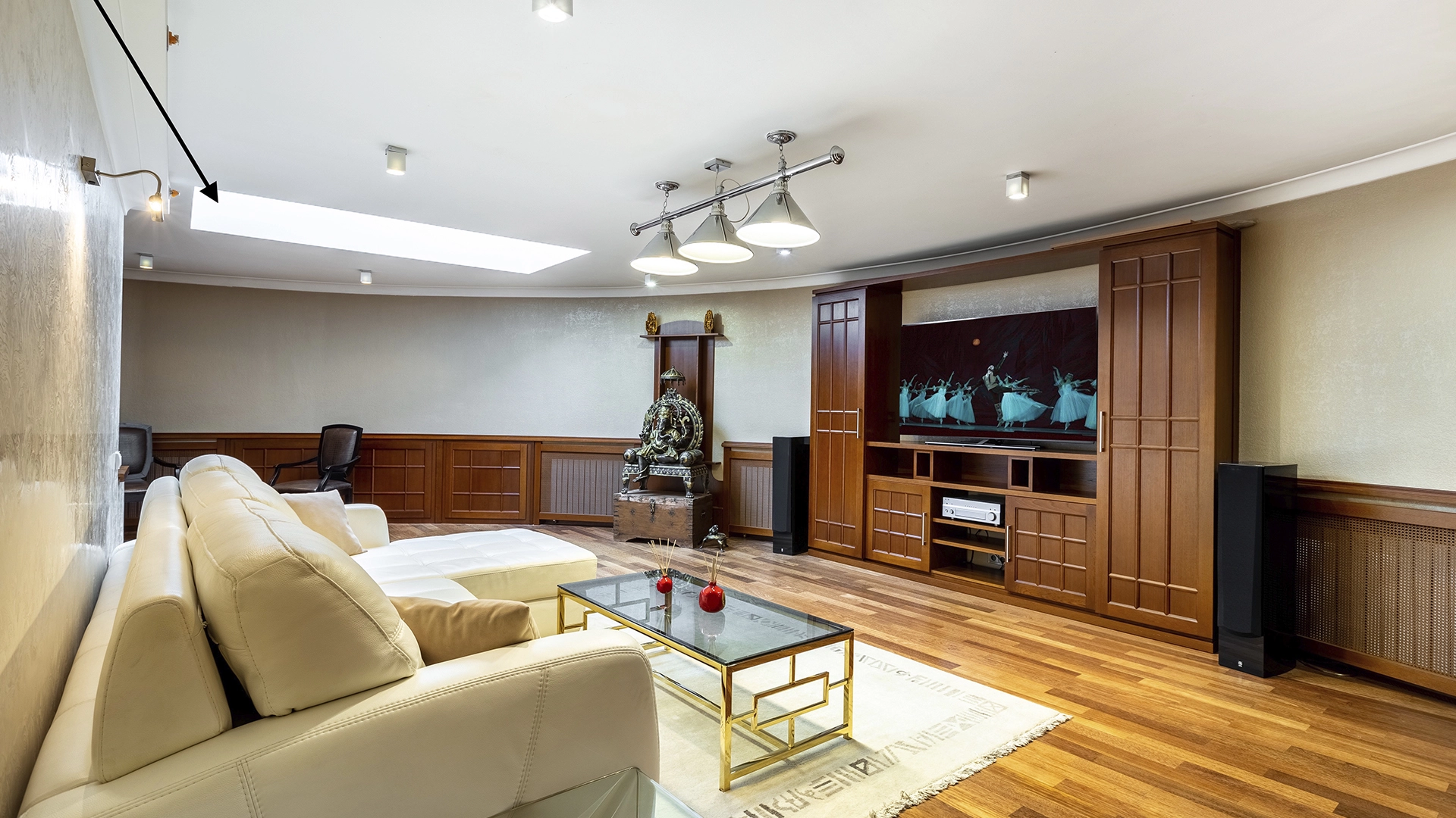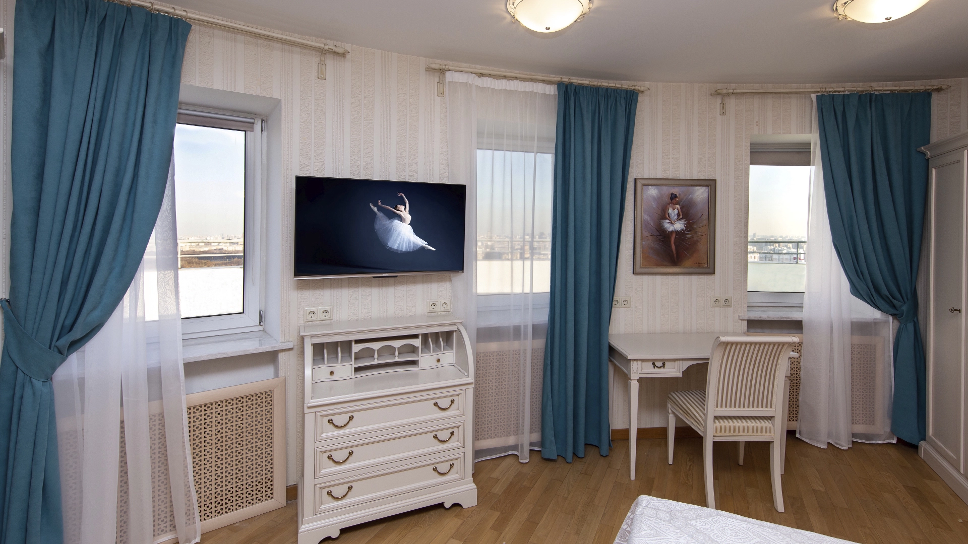 A 3-bedroom apartment with a total area of 500 m² in the premium-class residential complex "Vorobyovy Gory". The interior is decorated in laconic light beige colors, natural materials are used in the finishing. The spacious living room with a bay window has a grand piano, a fireplace and a large sofa. One of the bedrooms is equipped as a study. The kitchen is equipped with all necessary appliances. The second bedroom has an individual bathroom and a dressing room.