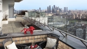 Air conditioners are installed. On the perimeter of the apartment is a terrace with 4 exits. There are cozy armchairs on the terrace, and from the windows there is a view of "Moscow City" and the city. Layout: kitchen, dining room, living room, 2 bedrooms, dressing room, 2 full bathrooms with windows, as well as a private bath.