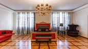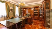 The four-level country house with an area of 670 m² is located on a field plot of 27 hectares. The facade of the building is faced with brown clinker brick, decorated with cream-colored cornices, balusters and lighting. The interior is decorated with warm colors, wood texture and imitation lipnina. The layout of the residence includes 6 bedrooms, living room, kitchen, dining room and study. There is a freestanding bathhouse, on the second floor of which there is a block for staff. In front of the garage for 2 cars is placed parking for 2 more cars. The plot is landscaped, paved paths and a house with a barbecue area and a fireplace.