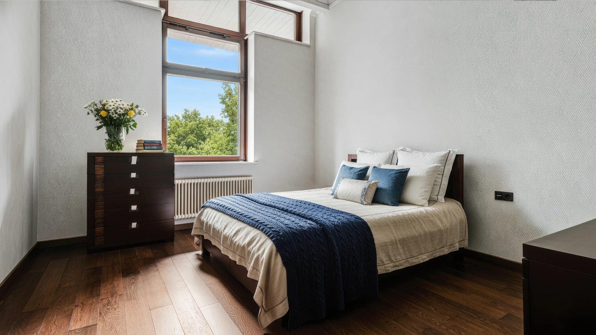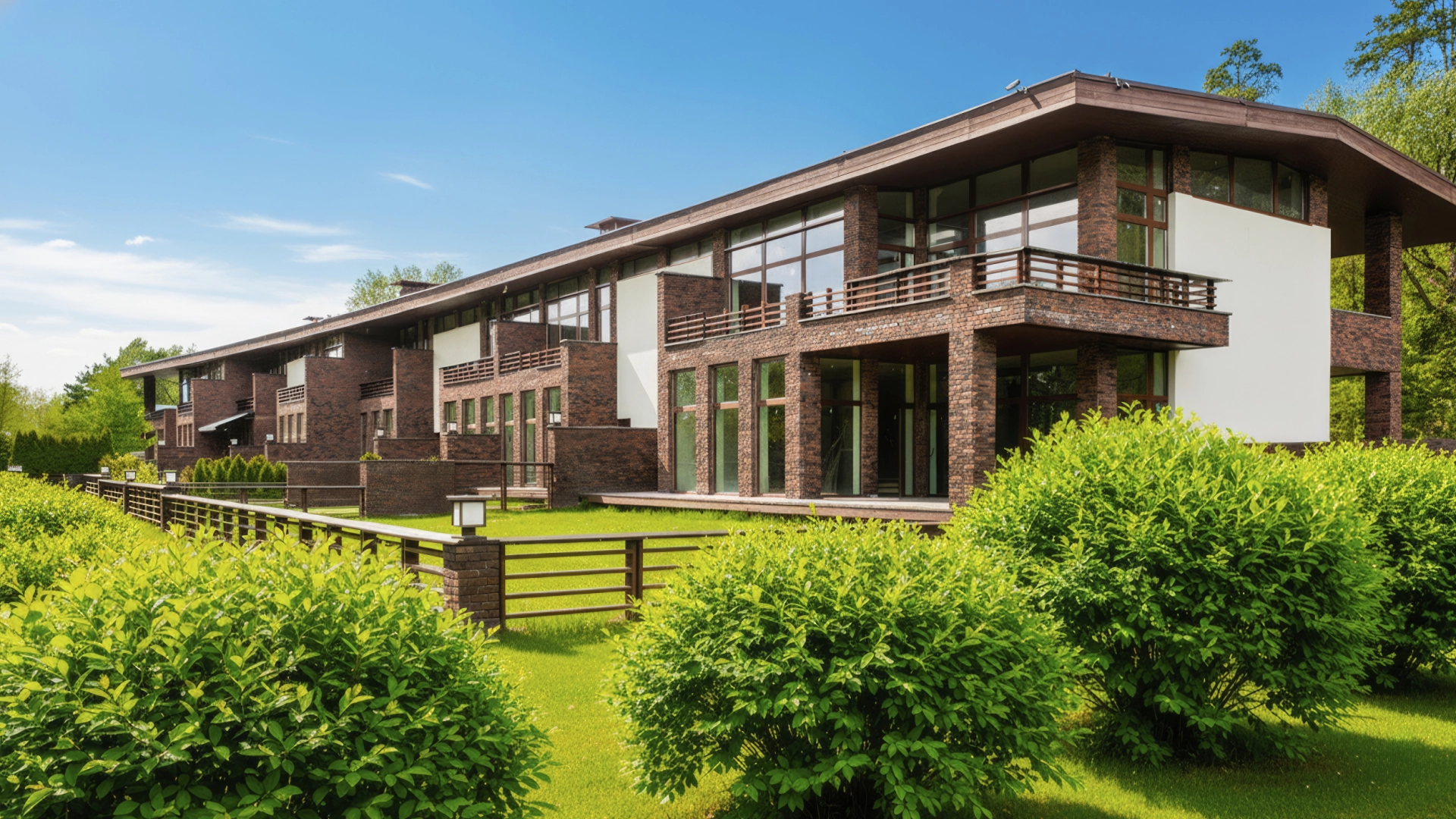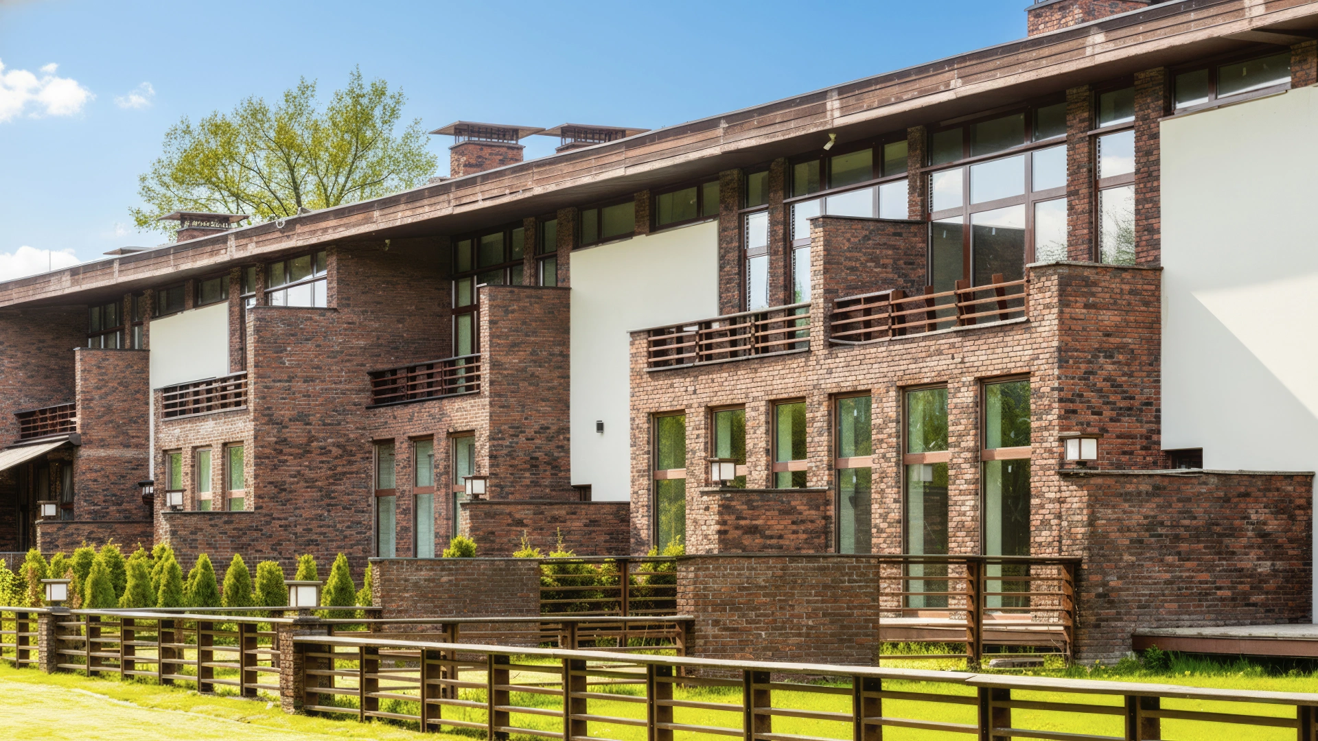 The three-level townhouse of 360 m² is built on a field plot of 3 hectares with lawn. The facade with large windows in modern style is faced with red clinker bricks and beige plaster. The laconic interior combines milk shades and dark wood texture. The house has 3 bedrooms, a living-dining room with access to the patio, a kitchen, a study and a SPA-zone with a sauna and a rest room. There is a staff block with 2 bedrooms and a kitchen. The plot overlooks the planted trees and shrubs.