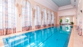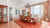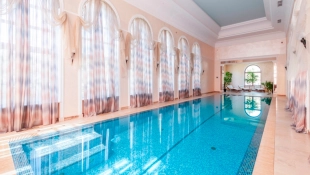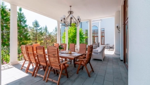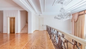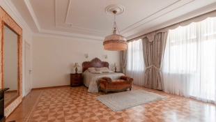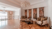 Luxury representative country residence in classic style. The main house has 6 bedrooms with bathrooms and dressing rooms on an area of 1800 m². Upon entering, guests enter an elevator lobby with a natural stone panel. The two-light living room and fireplace room with access to the terrace are furnished in the style of late Russian classicism. Carved furniture made of solid wood and antique items are incorporated into the interior. The floor has parquet with a different pattern in each room. SPA-zone is organized around a large swimming pool with a relaxation area. On a plot of 40 hectares around the fountain planted lilacs, the site was decorated with trees and ornamental shrubs, conducted street lighting, paths paved with tiles. A garage for 6 cars and a 3-bedroom staff apartment with a security room were built near the residence.