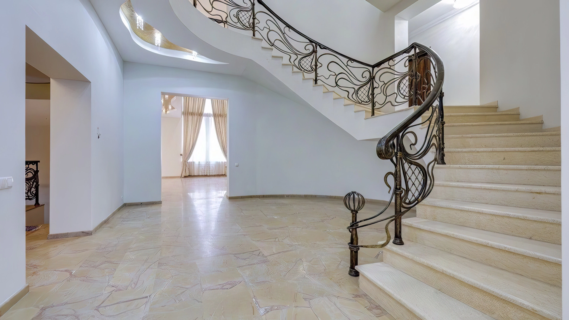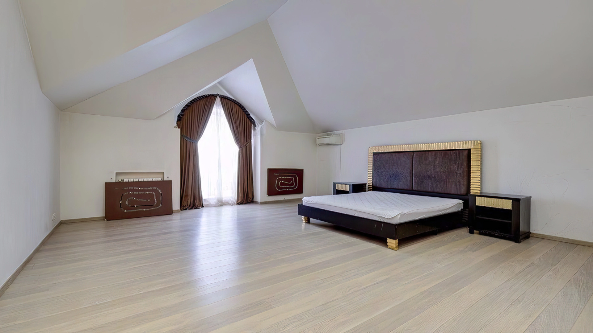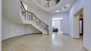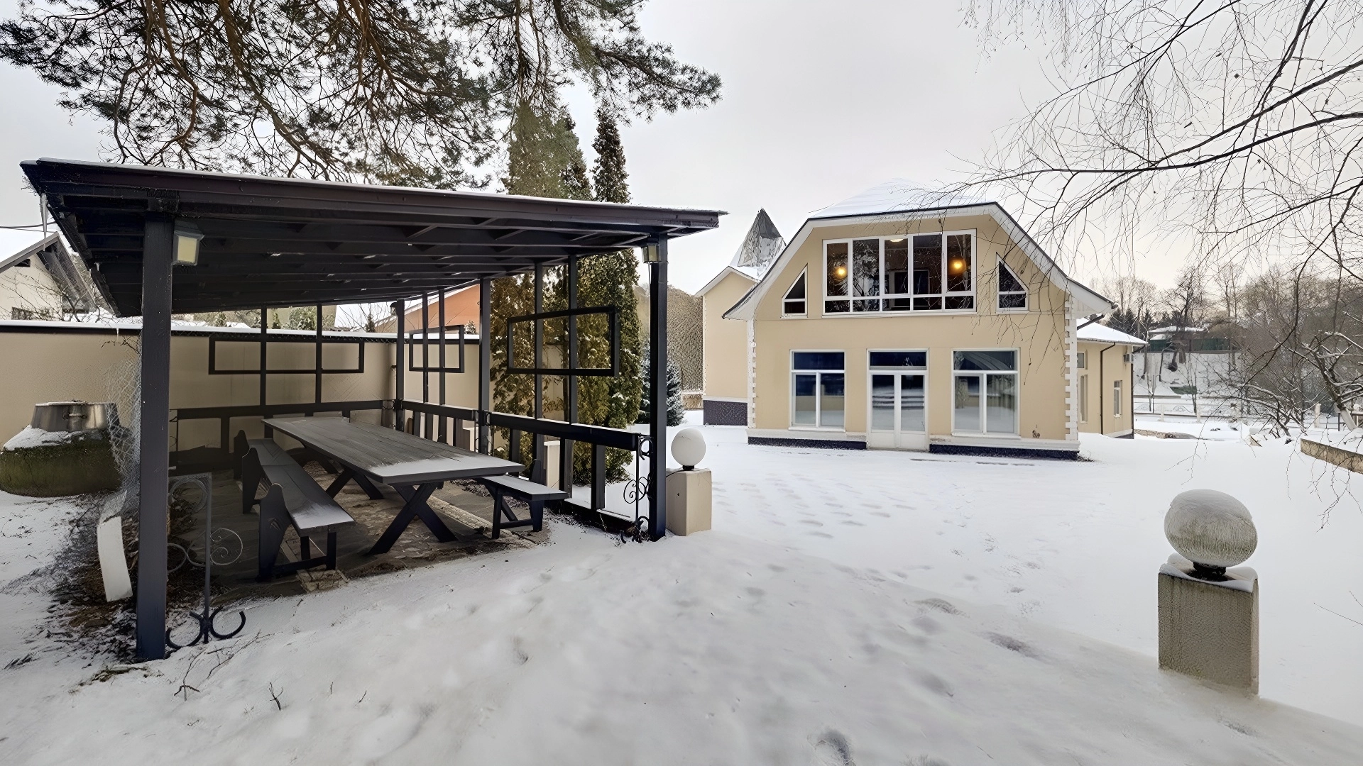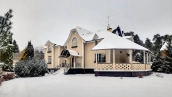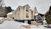 This 1000 m² country house with swimming pool is built on a large open plot. The facade of the house in European style is faced with textured plaster of sand color and decorated with rustovka. The house is finished with rough work, marble on the floor and stairs, and the pool is ready. A garage is built into the basement. The plot of 30 acres is landscaped, laid lawn, planted with ornamental shrubs and created a pond. Nearby built a summer gazebo in the same style with the main house.