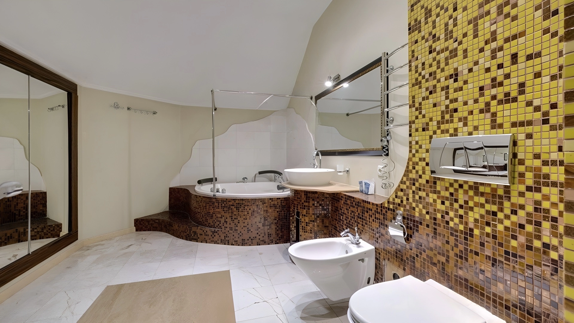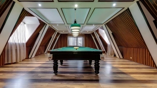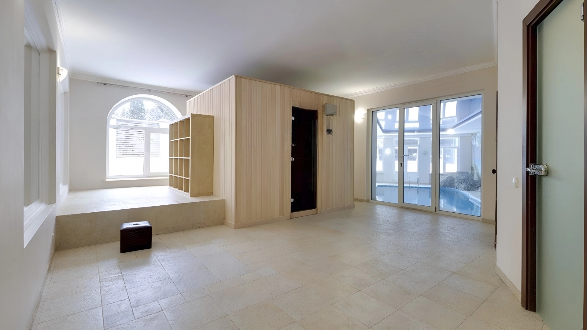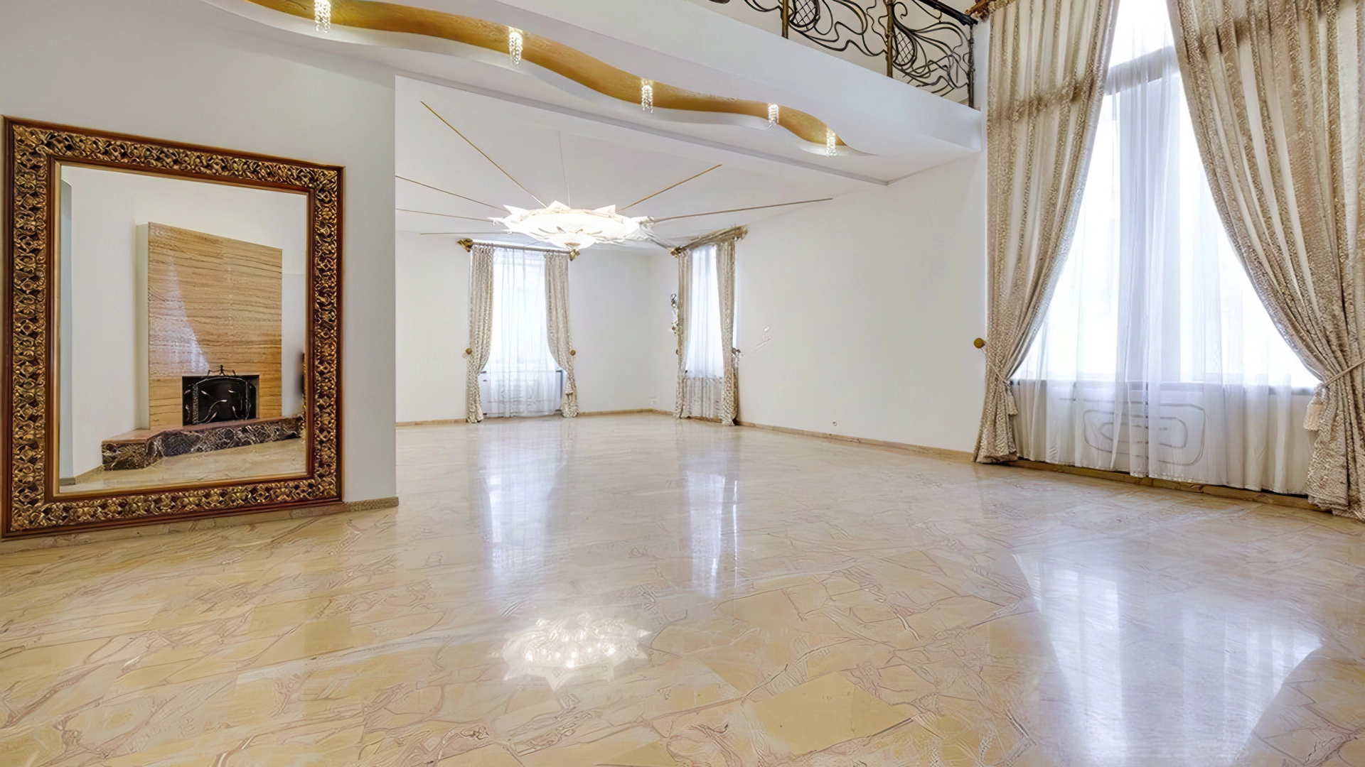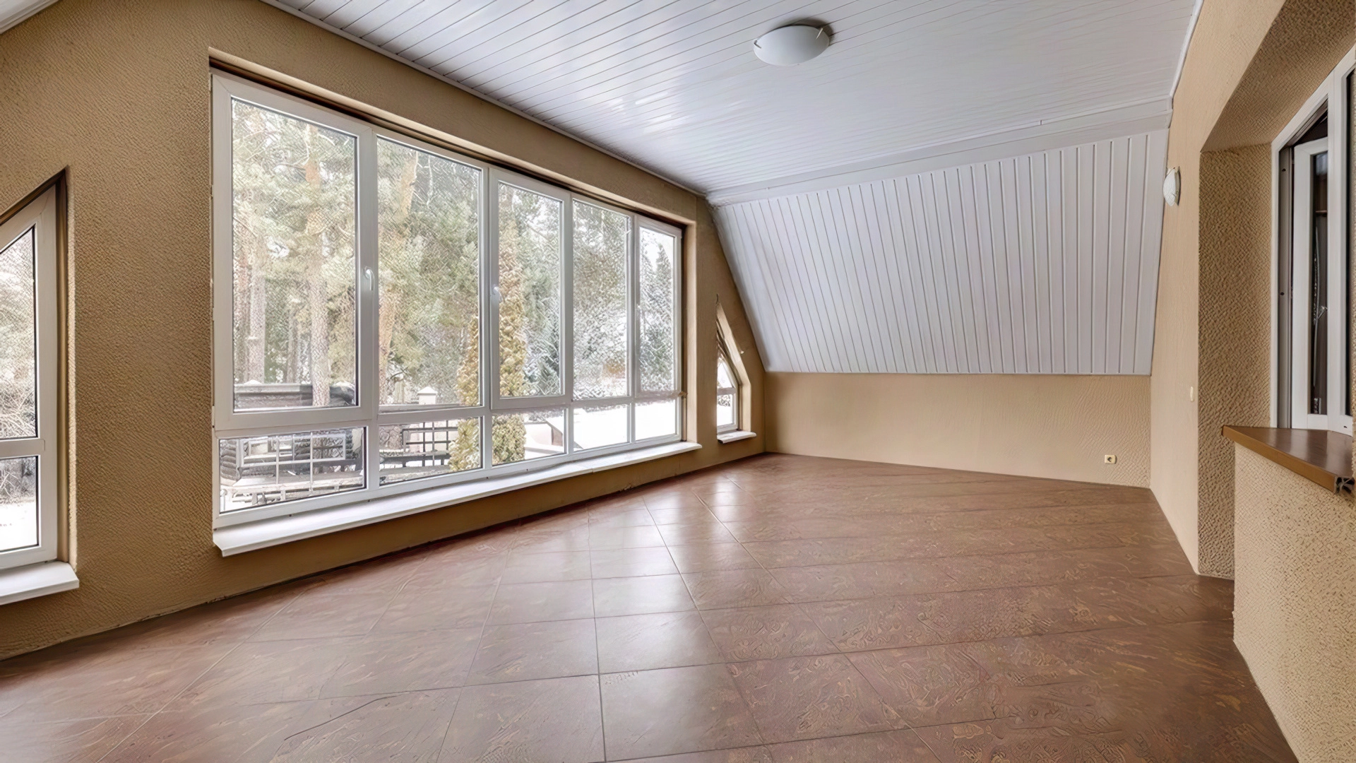 This 1000 m² country house with swimming pool is built on a large open plot. The facade of the house in European style is faced with textured plaster of sand color and decorated with rustovka. The house is finished with rough work, marble on the floor and stairs, and the pool is ready. A garage is built into the basement. The plot of 30 acres is landscaped, laid lawn, planted with ornamental shrubs and created a pond. Nearby built a summer gazebo in the same style with the main house.