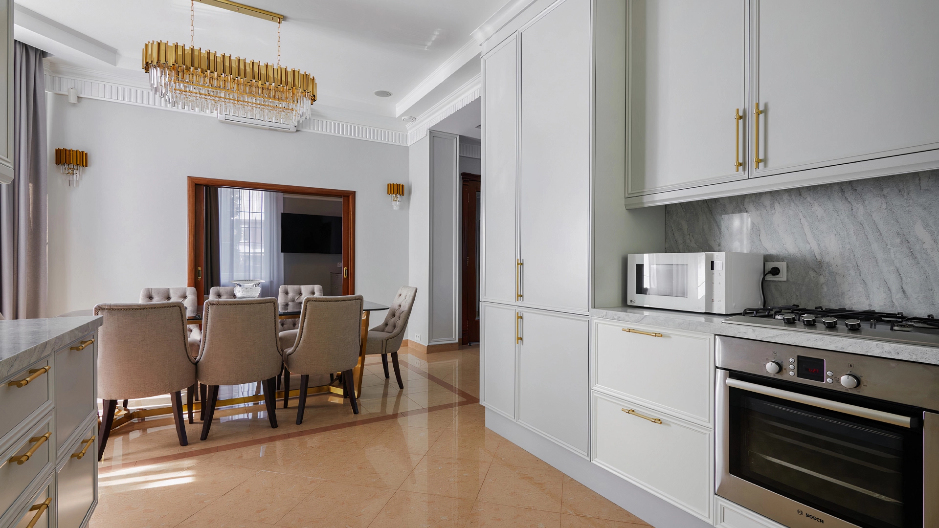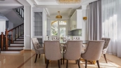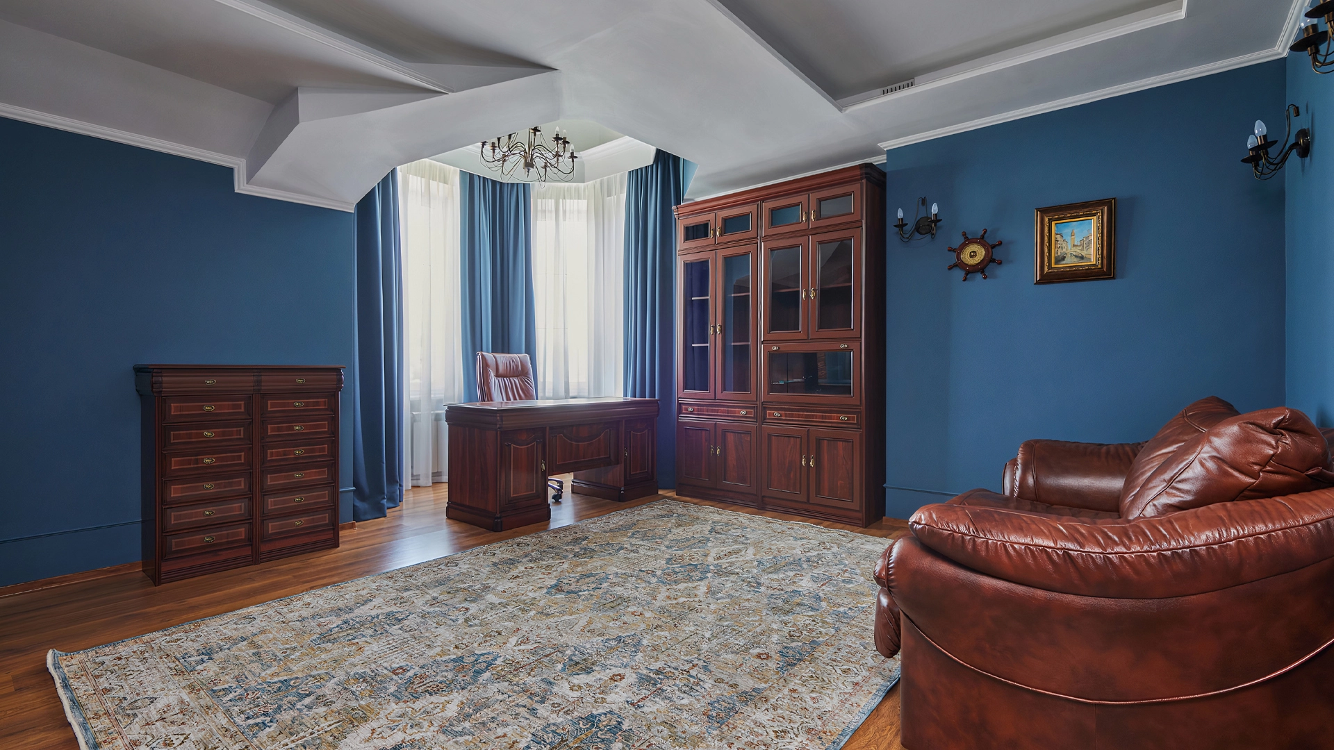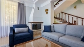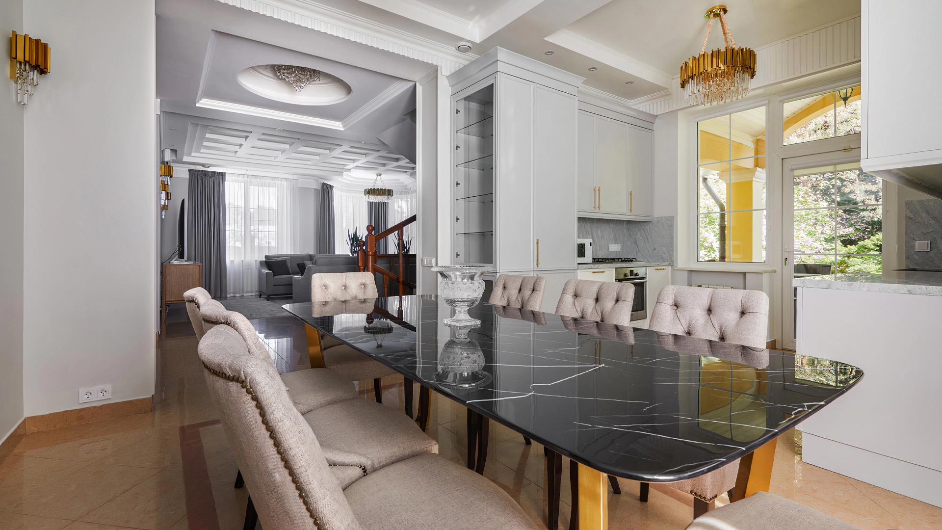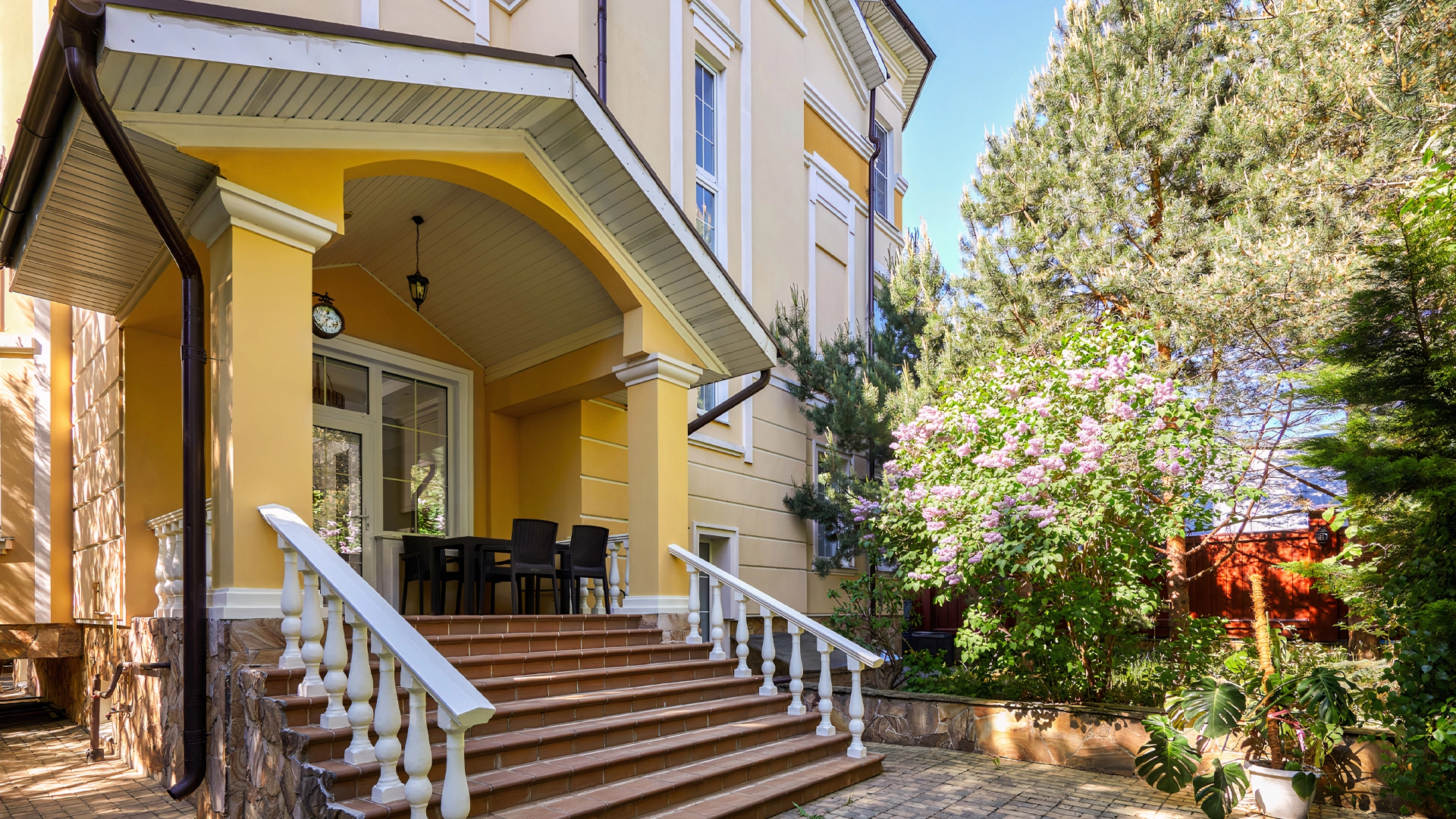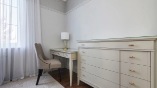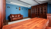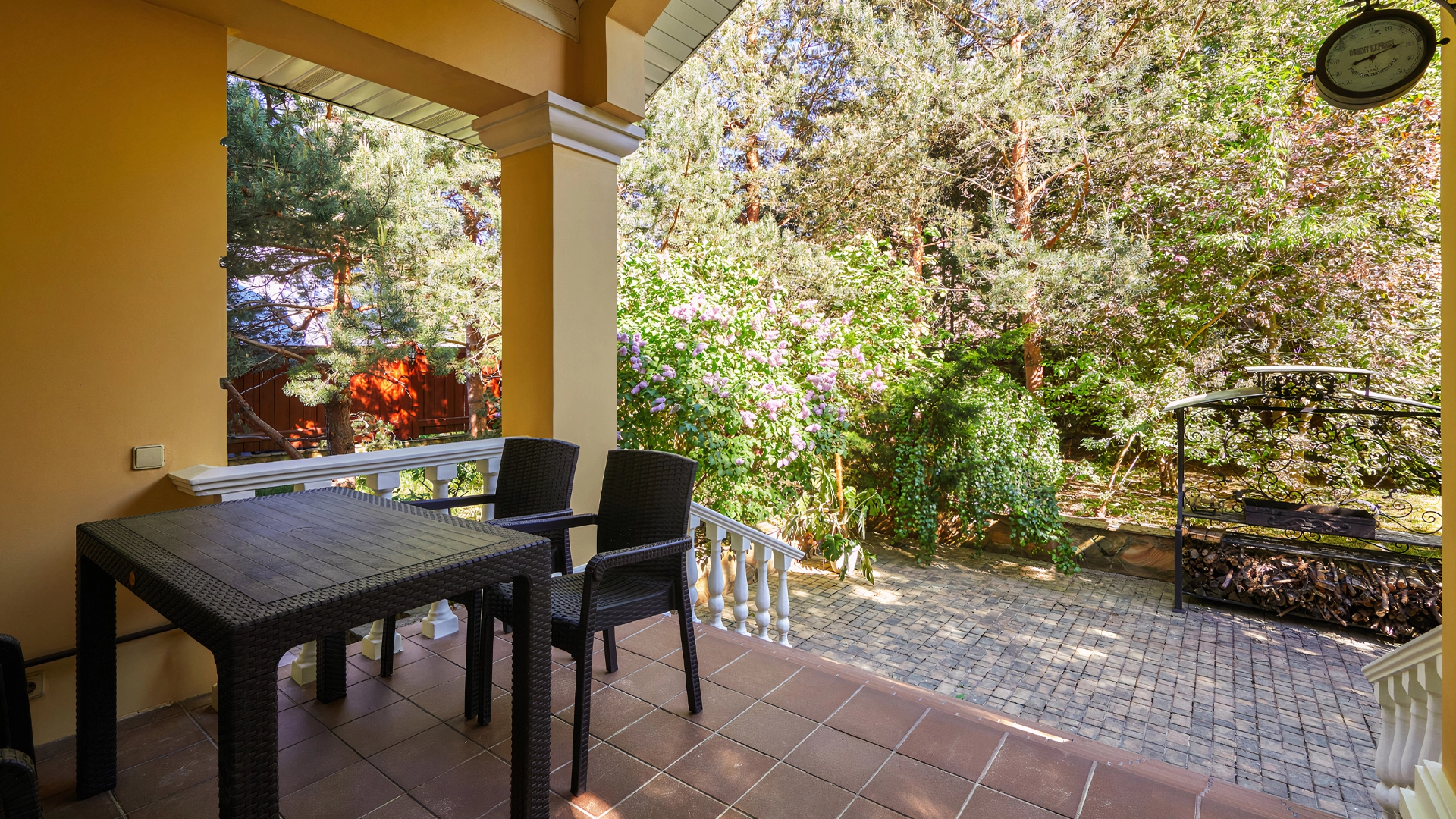 The country residence with an area of 418 m² is built on a field plot of 12 hectares. The facade of the building is made in neoclassical style and is faced with yellow-beige plaster, decorated with white platbands, cornices and semi-columns. The light interior is finished in warm colors combined with the texture of wood and stone. The layout of the house includes 4 bedrooms, a cozy living room with a fireplace, kitchen-dining room, study, gym, cinema and SPA-zone with a swimming pool and sauna. In the contour of the cottage there is a garage for 1 car. The plot is landscaped, paved areas and a barbecue area.