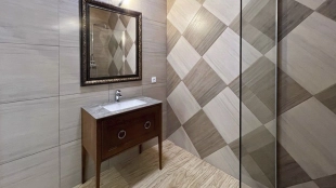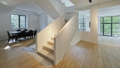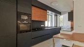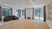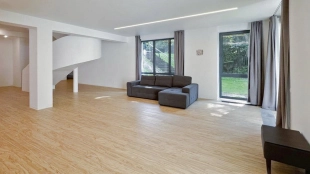 The two-storey country house of 442 m² with a basement is located on a relief wooded plot of 18 hectares. The cottage is made according to the author's project in European style - the guests are welcomed by a panoramic two-light living room. The central place in the interior of the house is occupied by a staircase in constructivism style. In combination with spacious rooms and a large area of glazing, the staircase created a memorable image.