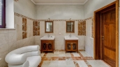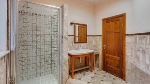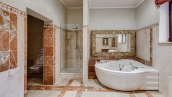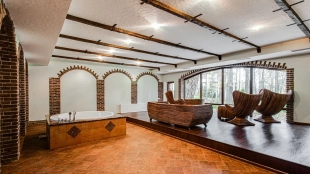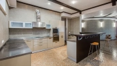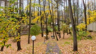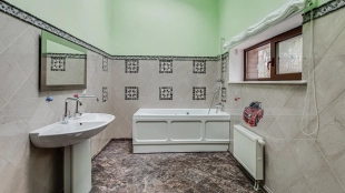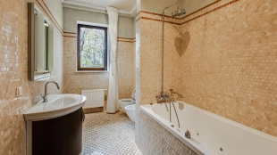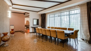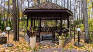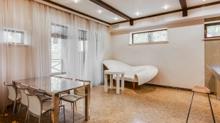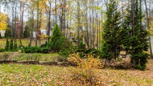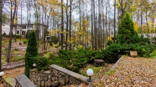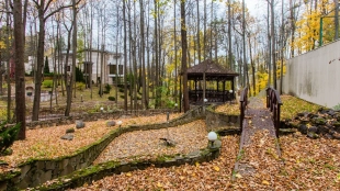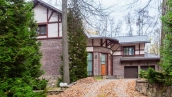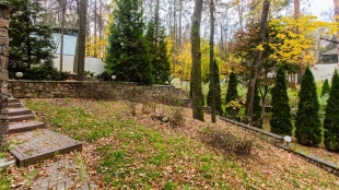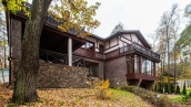 The European style house of 540 m² is situated on a relief spacious plot of 50 hectares with forest trees. The building with half-timbered elements is clad with gray clinker bricks, stone and white plaster. A garage for 2 cars is built into the first floor. On the first floor there is a living room in light colors in a mix of European and Japanese style. The kitchen is equipped with the necessary appliances. There is a sauna in the SPA-zone. A grand staircase leads to the second floor, where there are 4 bedrooms with bathrooms and dressing rooms for the owners and guests of the house. From the second floor you can go to the open terraces with views of forest trees. The plot is located on an elevated position and has been landscaped with a pergola, stone and tile paths.