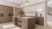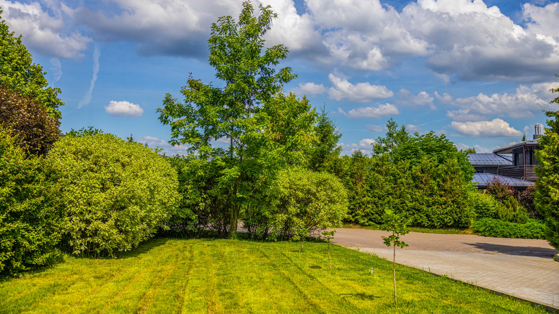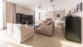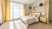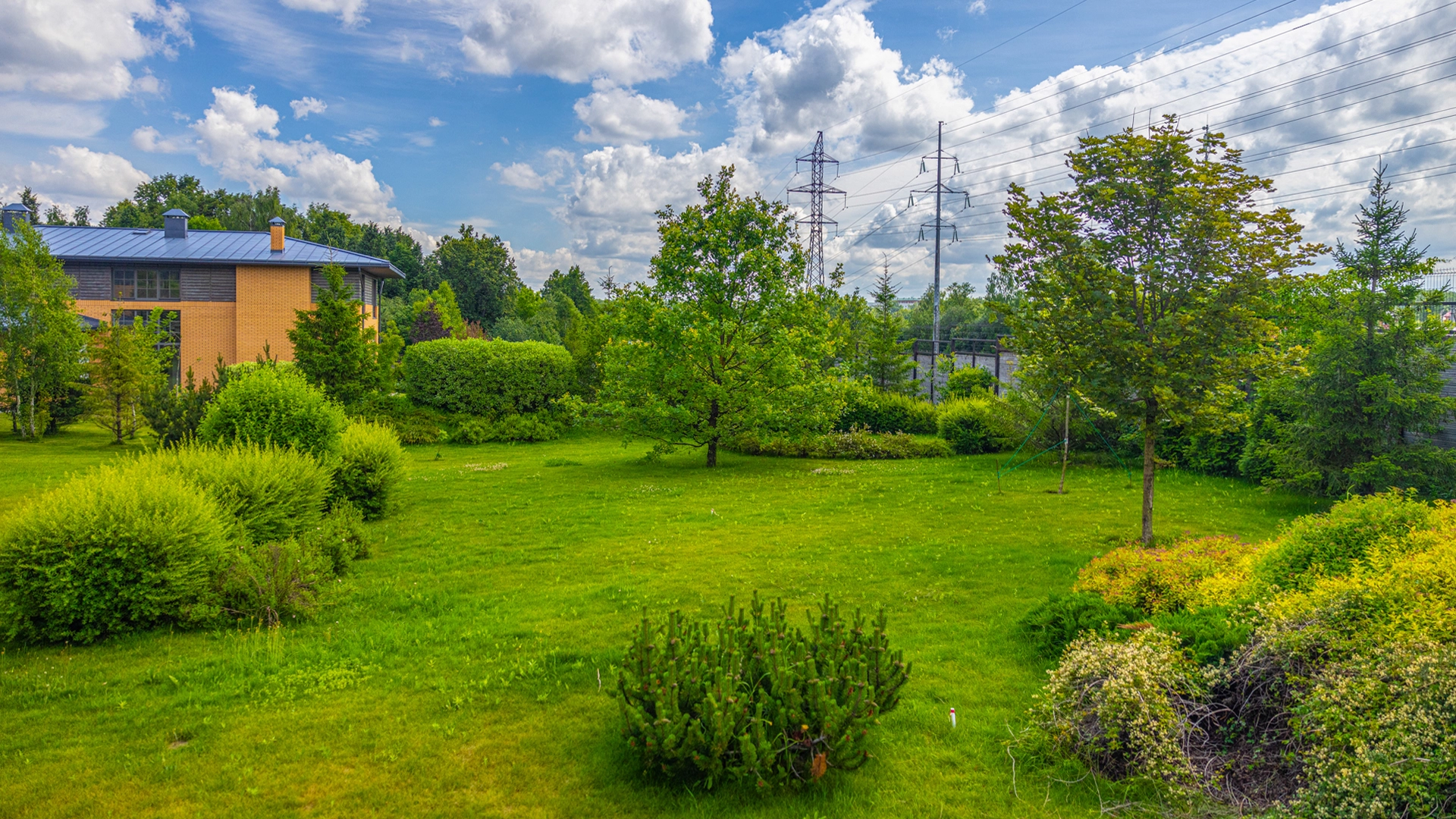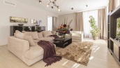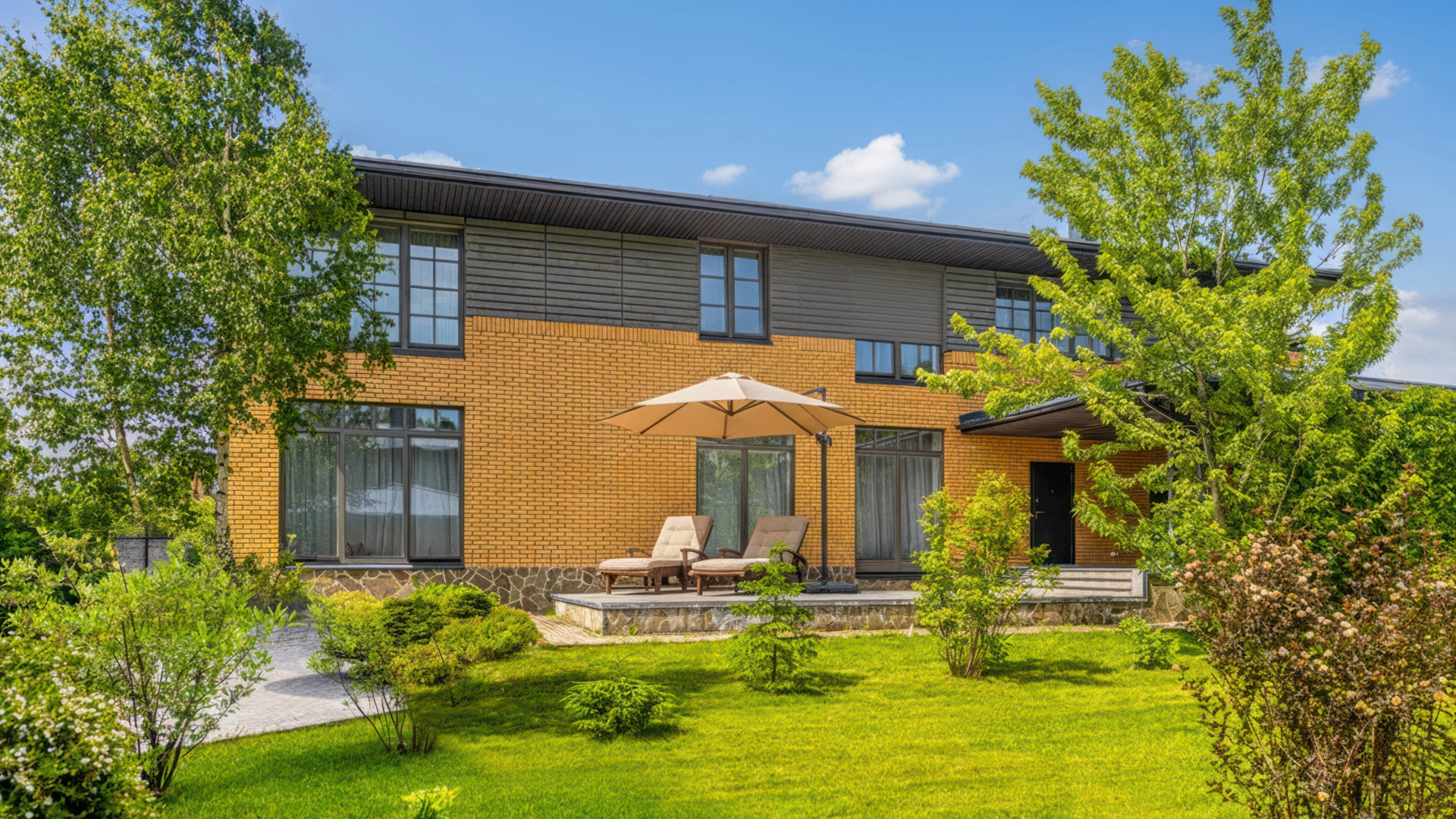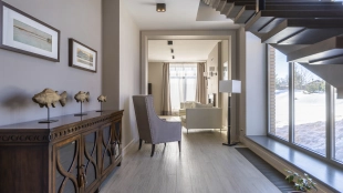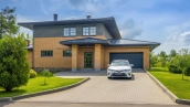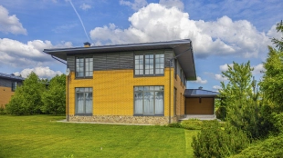 The 422 m² country house is built on a spacious field plot of 22 hectares. The facade of the building is faced with beige clinker brick and decorated with wood texture inserts. The interior is made in a modern style, in the finishing used on the walls paint and inserts of high-quality wallpaper, on the floor Italian tiles and engineering board, installed oak stairs and doors with natural veneer. The house is equipped with built-in closets and closets. The layout of the residence includes 6 bedrooms, a living room with a fireplace, a kitchen-dining room, a study and a terrace with a barbecue area. There is a garage for 2 cars.
