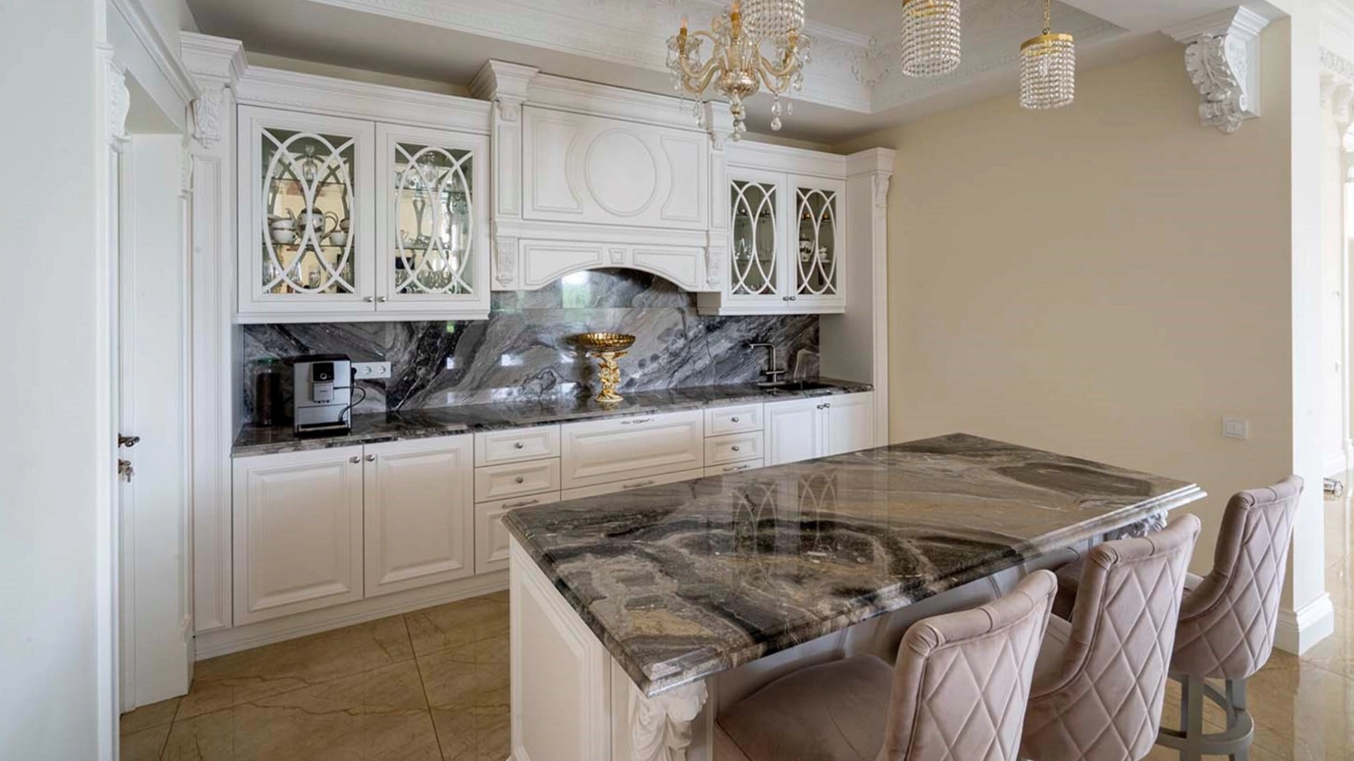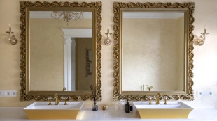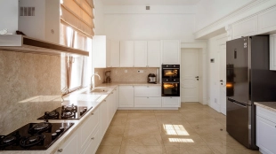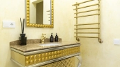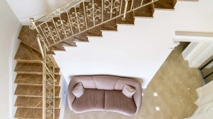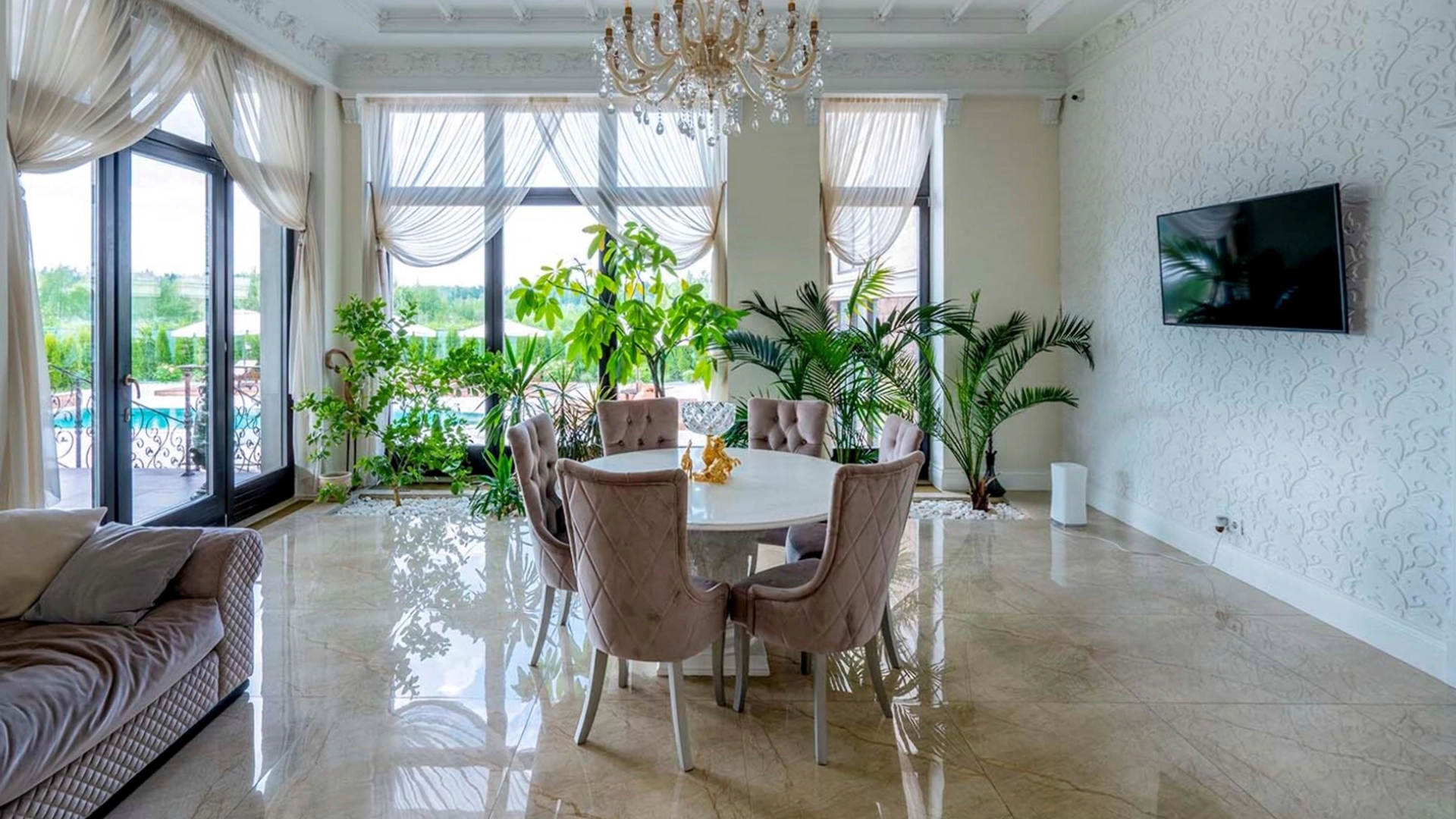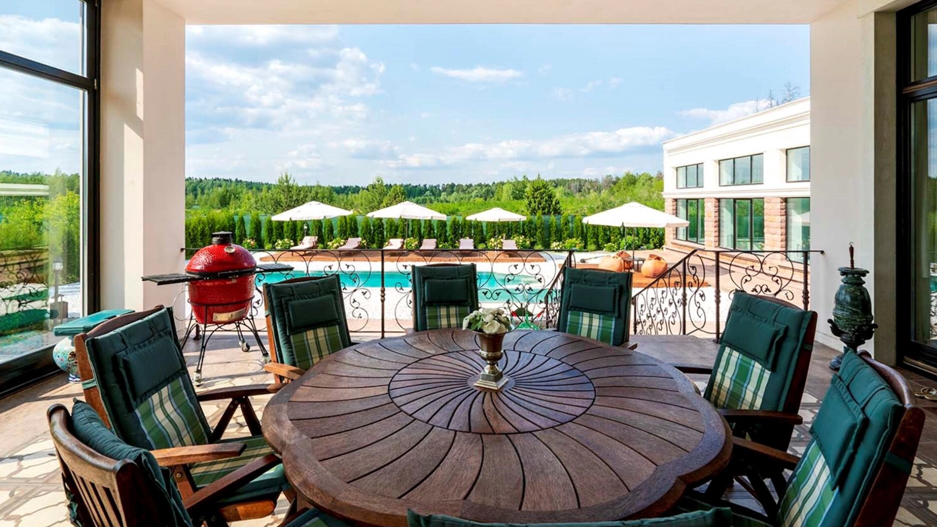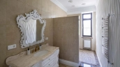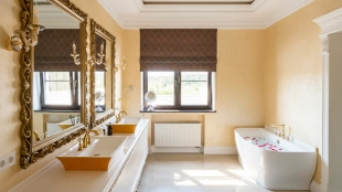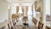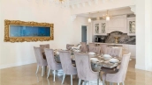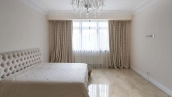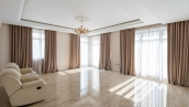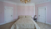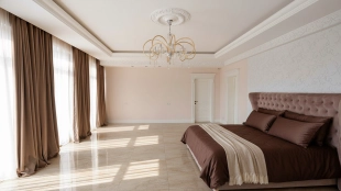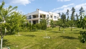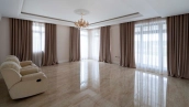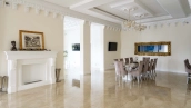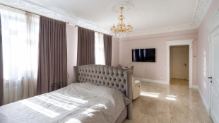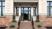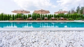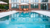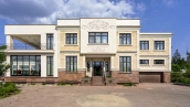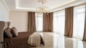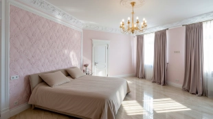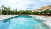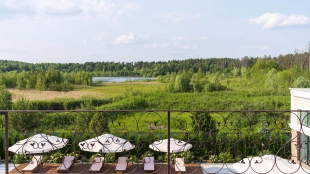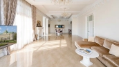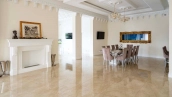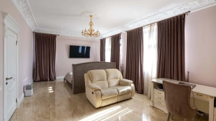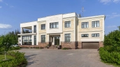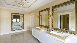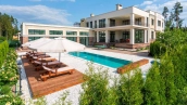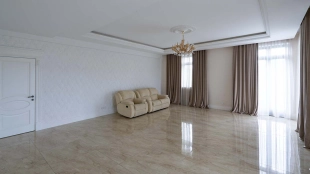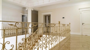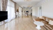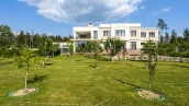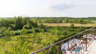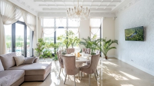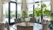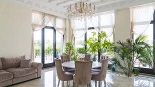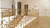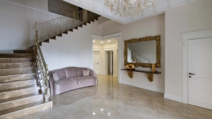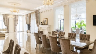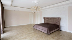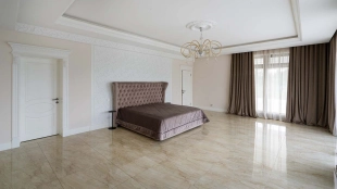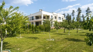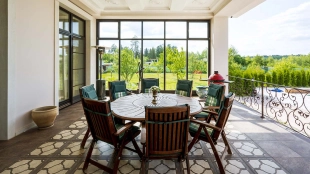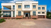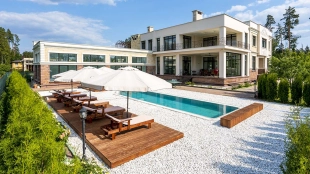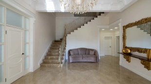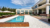 The country residence of 1663 m² is located on a spacious plot of 25 hectares near the forest. The bright facade combines modern and classic styles - the house with panoramic glazing is decorated with a stucco monogram. The layout of the cottage provides 8 bedrooms, living room with fireplace, kitchen, winter garden with access to the terrace, sauna, hammam, Russian bath, 2 gyms and a garage for 4 cars, above which located an apartment for staff. SPA-complex with a swimming pool is attached to the house. The interior was kept in a classic style in beige and golden colors. The plot was landscaped, lawns were laid, trees were planted, a pergola with a barbecue area, a parking lot and paths to the outdoor pool were laid.