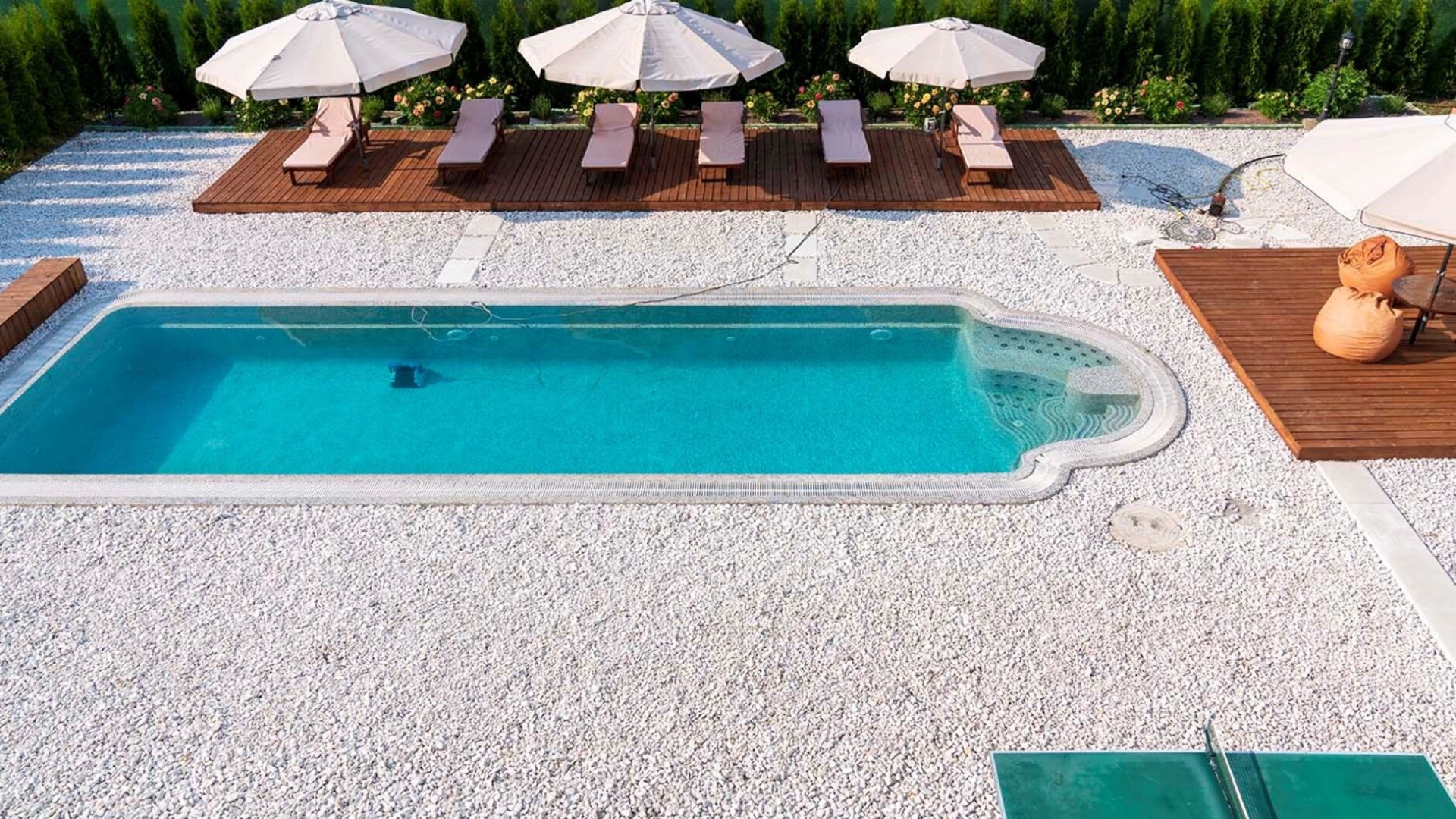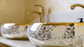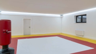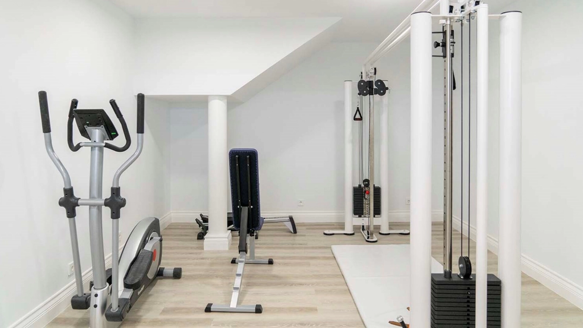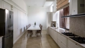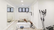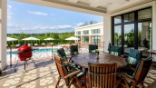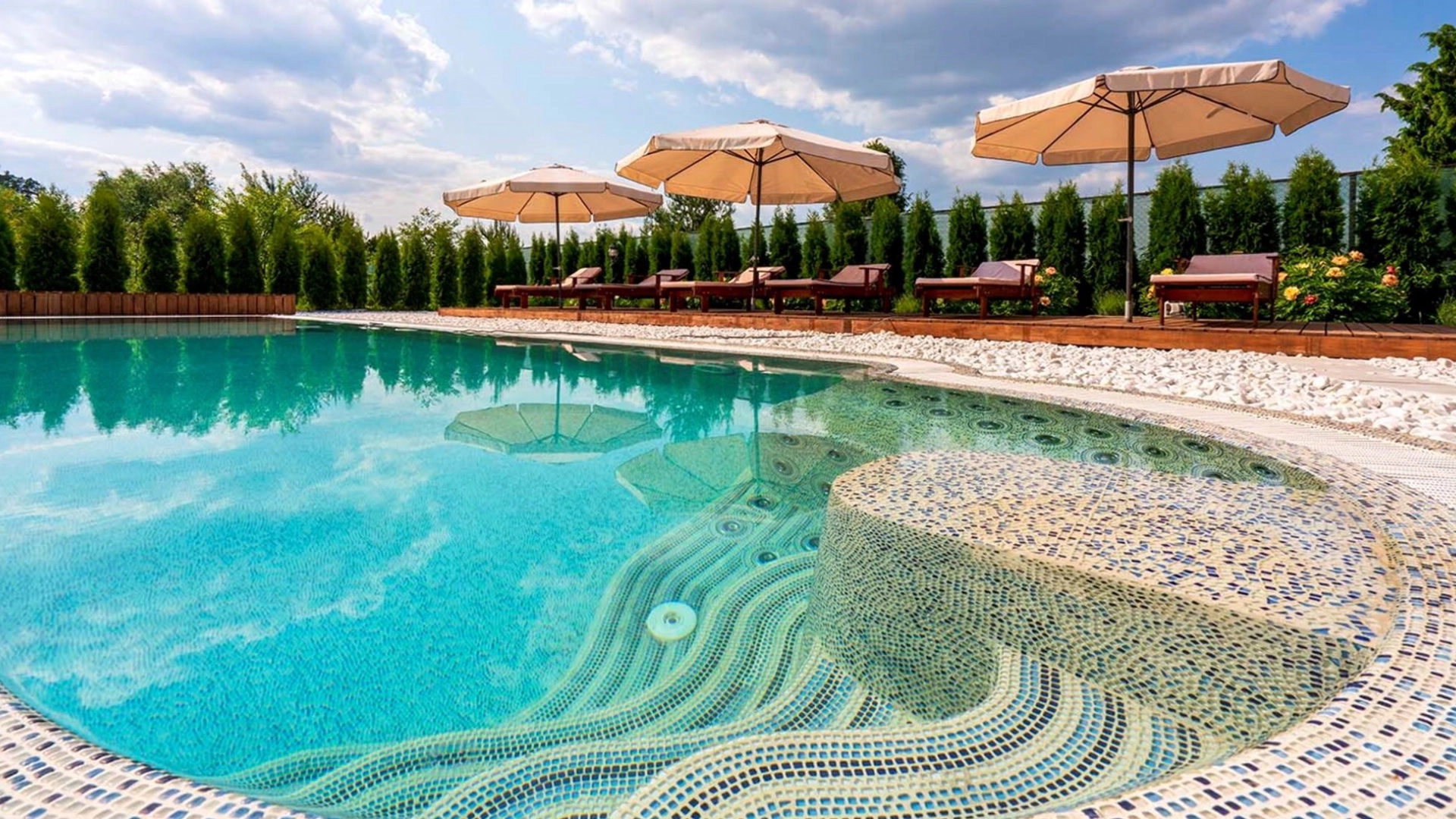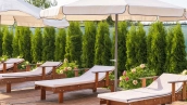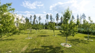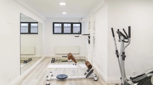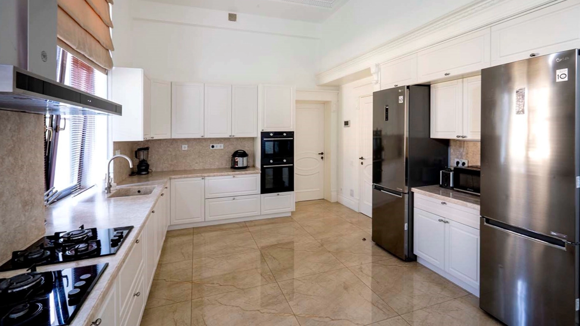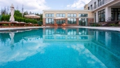 The country residence of 1663 m² is located on a spacious plot of 25 hectares near the forest. The bright facade combines modern and classic styles - the house with panoramic glazing is decorated with a stucco monogram. The layout of the cottage provides 8 bedrooms, living room with fireplace, kitchen, winter garden with access to the terrace, sauna, hammam, Russian bath, 2 gyms and a garage for 4 cars, above which located an apartment for staff. SPA-complex with a swimming pool is attached to the house. The interior was kept in a classic style in beige and golden colors. The plot was landscaped, lawns were laid, trees were planted, a pergola with a barbecue area, a parking lot and paths to the outdoor pool were laid.