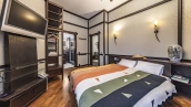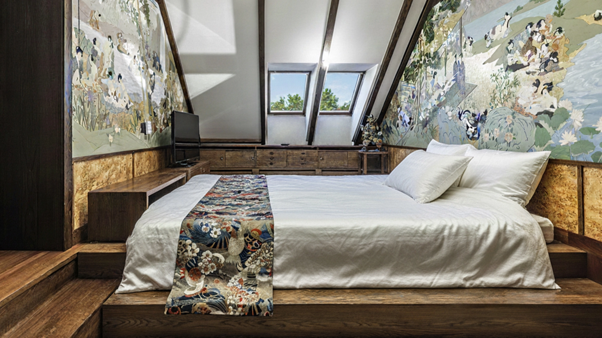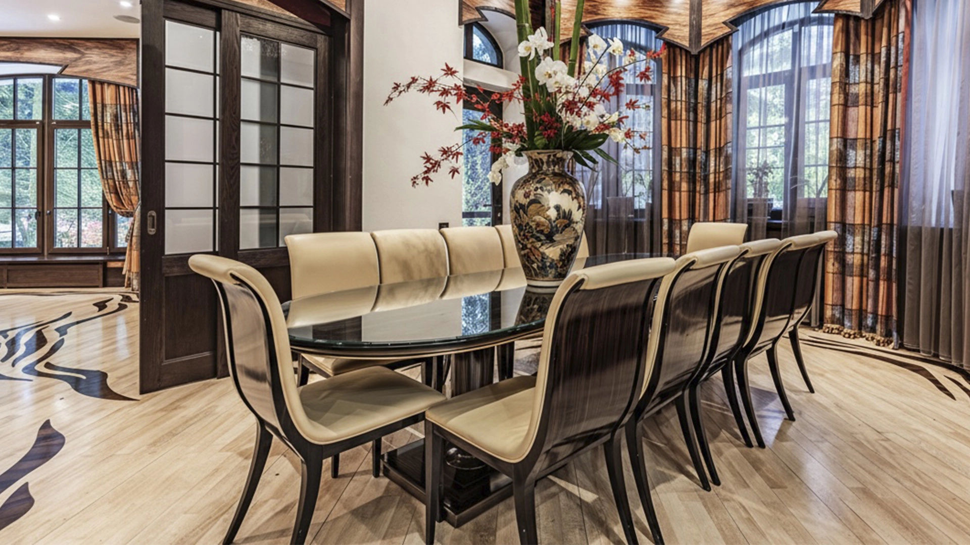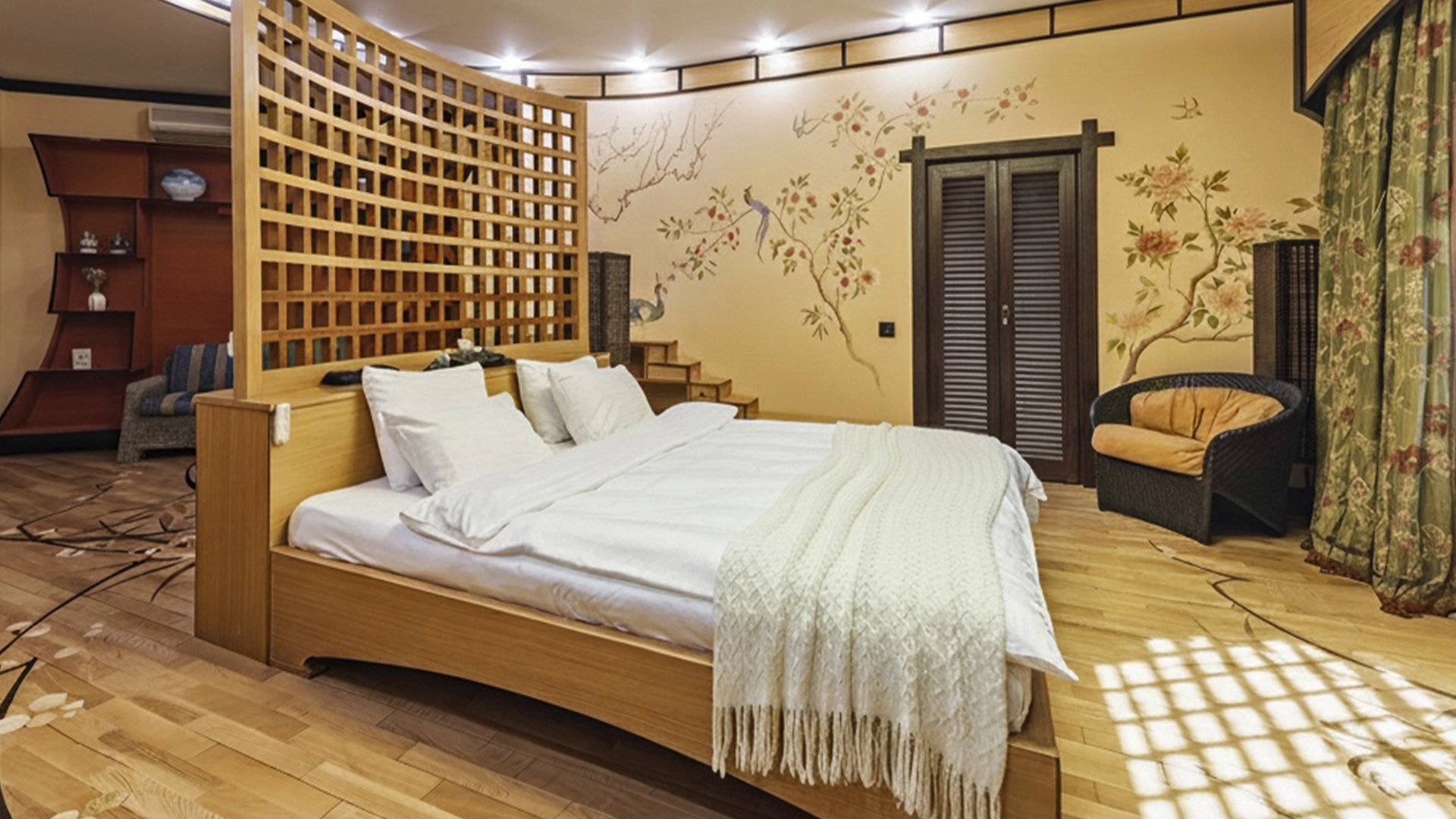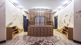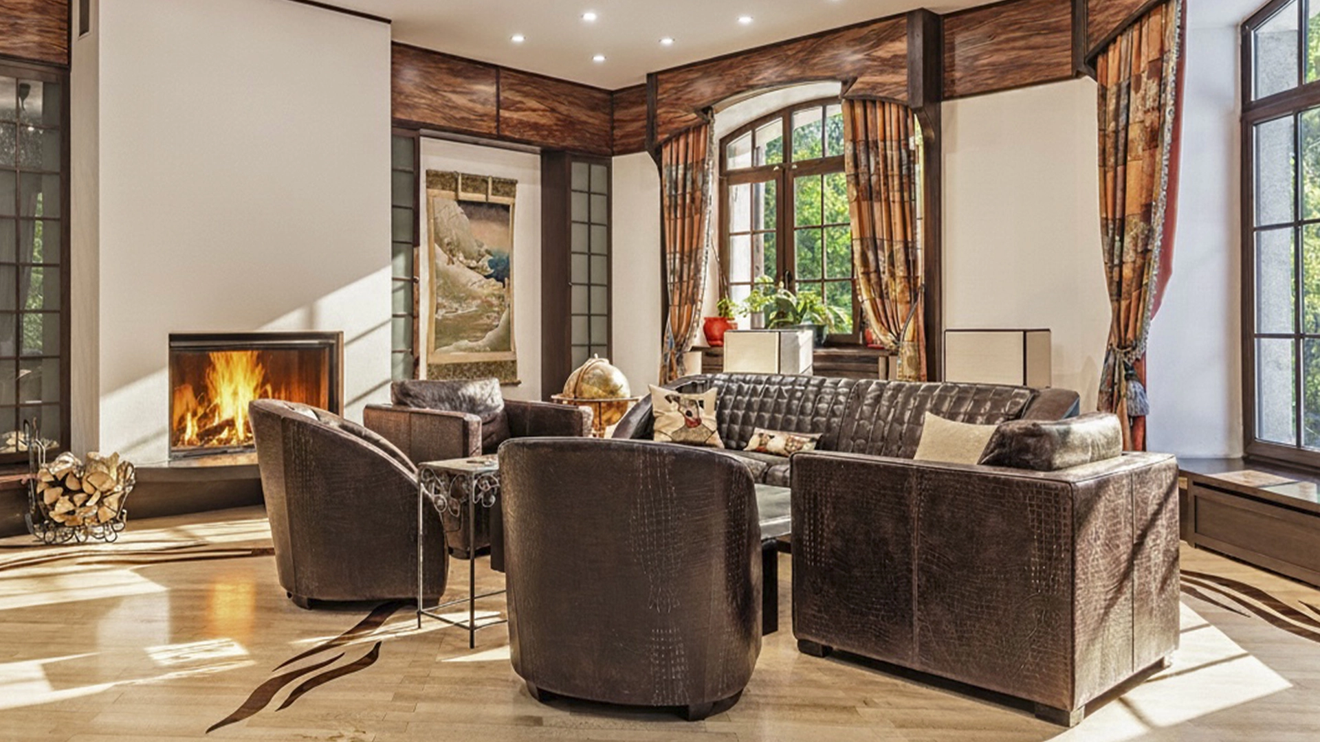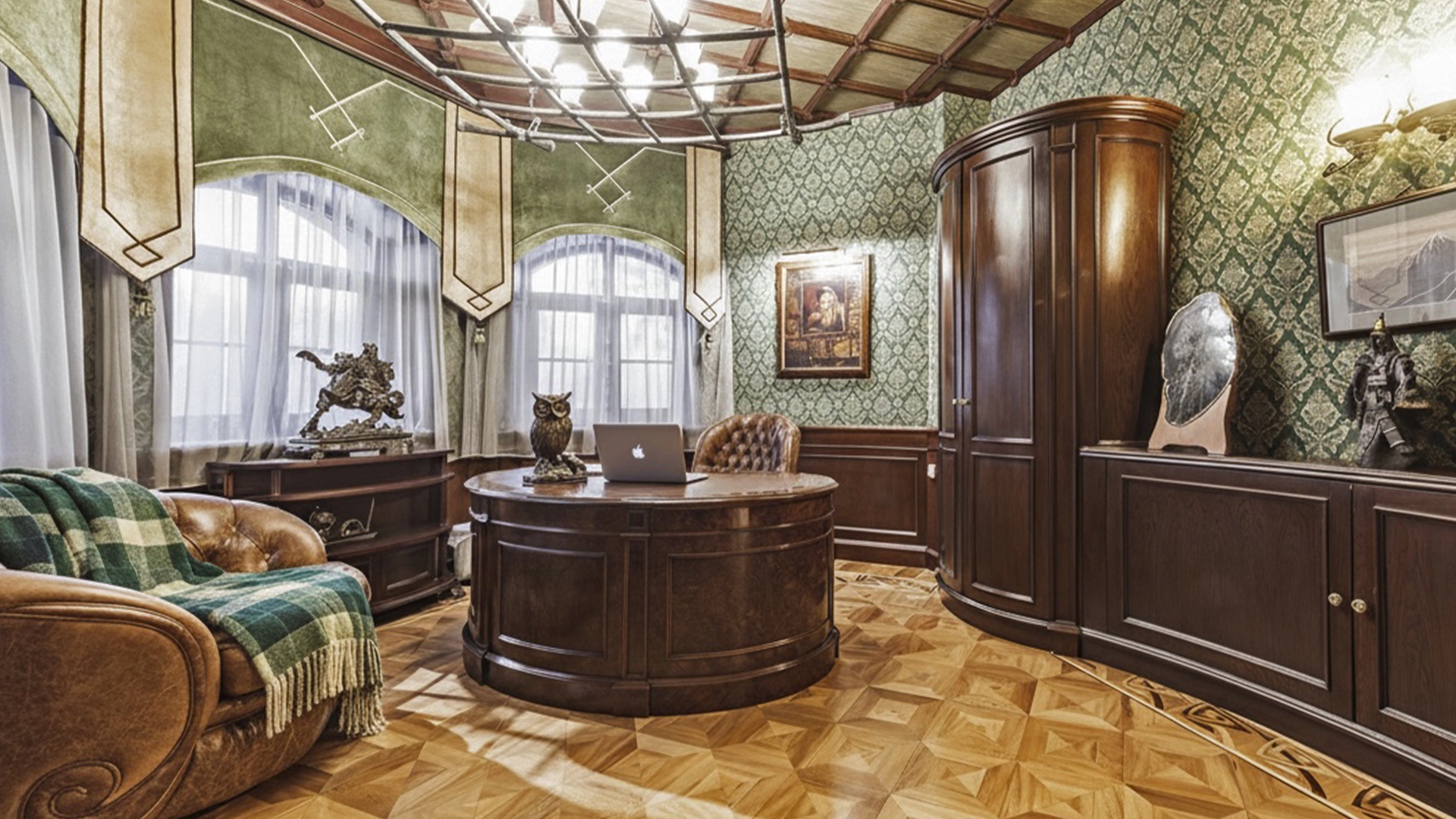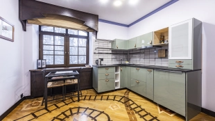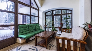 The country house of 1000 m² is located on a plot of 100 hectares with century-old coniferous trees. The building has a monumental facade in the spirit of a Renaissance castle. It is decorated with a tower, a high pitched roof, bay windows, wooden elements and a wrought iron dragon figure. At night the exterior is emphasized by lighting. Inside is renovated according to an individual design project in Japanese style, which is emphasized in details, decor and layout.