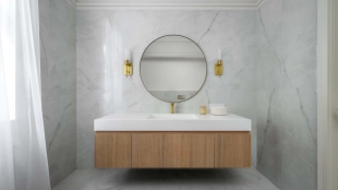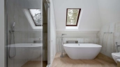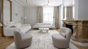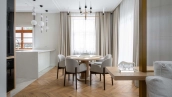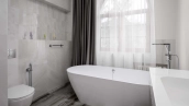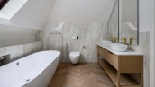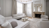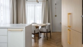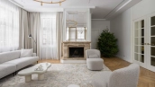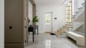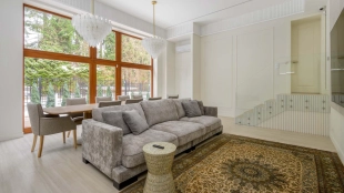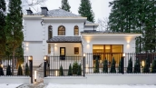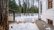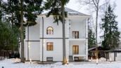 The country house of 550 m² is located on a wooded plot of 12 hectares. The facade with copper roof is made in neoclassical style, faced with snow-white plaster and decorated with backlighting and rustication. All window frames are made of natural wood. The interior is finished with premium materials, in light colors, decorated with moldings and complemented with stylish furniture, appliances and sanitary ware. For added comfort and security, air conditioning and video surveillance systems are installed.