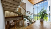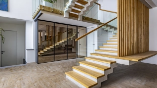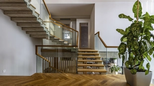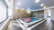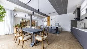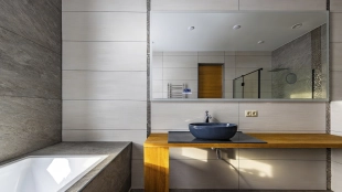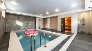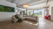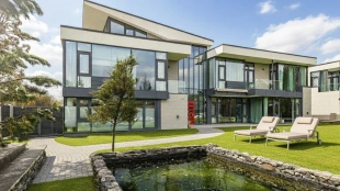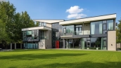 Country residence of 800 m² built on a field plot of 15 hectares. The facade with large windows in gray shades is made in a modern style. The cottage is presented without finishing, which allows you to realize an individual design project. The house has 5 bedrooms with individual bathrooms, one of them on the first floor, office, spacious kitchen-living room, working kitchen, swimming pool, sauna and staff room with a separate entrance. There is a built-in garage. The plot can be landscaped and equipped with a barbecue area.
