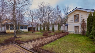 On the plot near the house grow thuys and ornamental trees, the paths are paved with tiles. For security guard built a separate small house, next to - a gazebo and barbecue area.