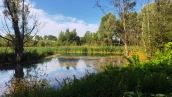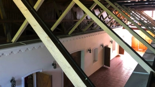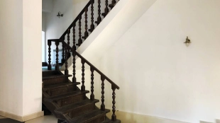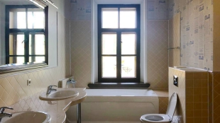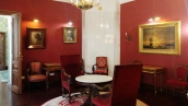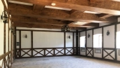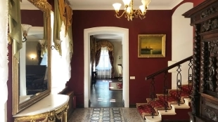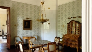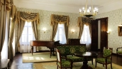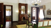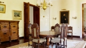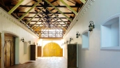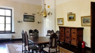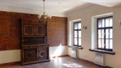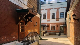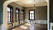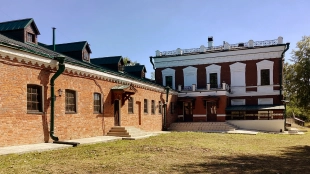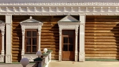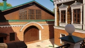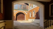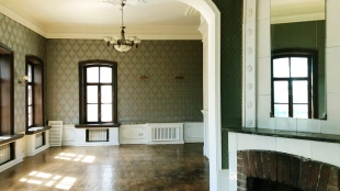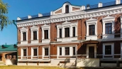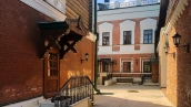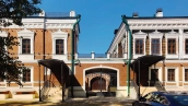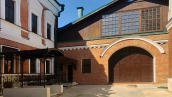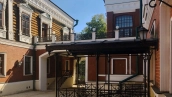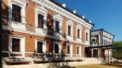 The Aigins' estate in Talitsy in the Moscow region. The complex of buildings includes the main house, an outbuilding and a carriage house located on the fenced park territory. The two-story main house with an underground level is connected to the carriage yard building, the gallery of which can serve as an exposition space or an event hall. The open terrace of the main house leads to a two-story outbuilding. The houses retain their historic parquet, painted or textile walls, stucco decor, tile stoves and wood-burning fireplaces. In front of the main house and outbuilding the cobblestone sidewalk was restored and a surface parking lot was organized. The estate is suitable for a company representative office or an event-agency.