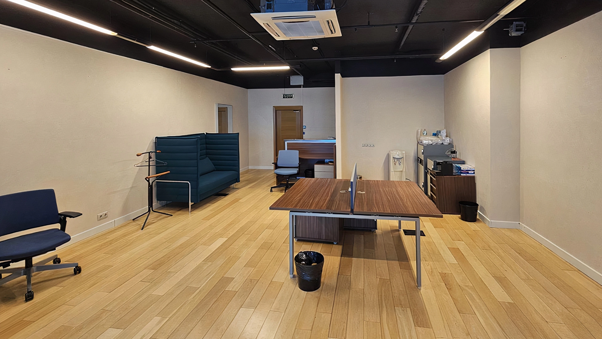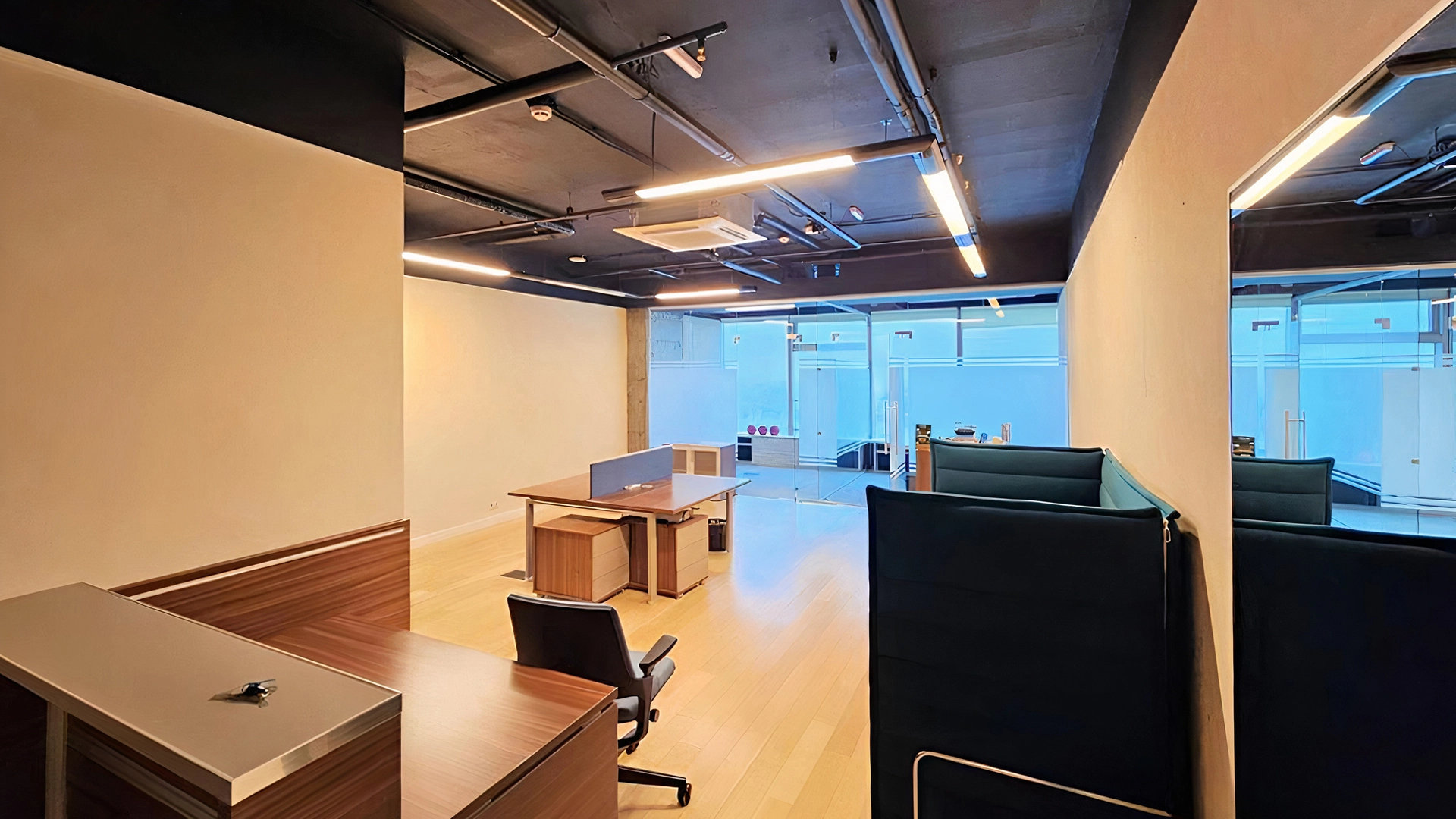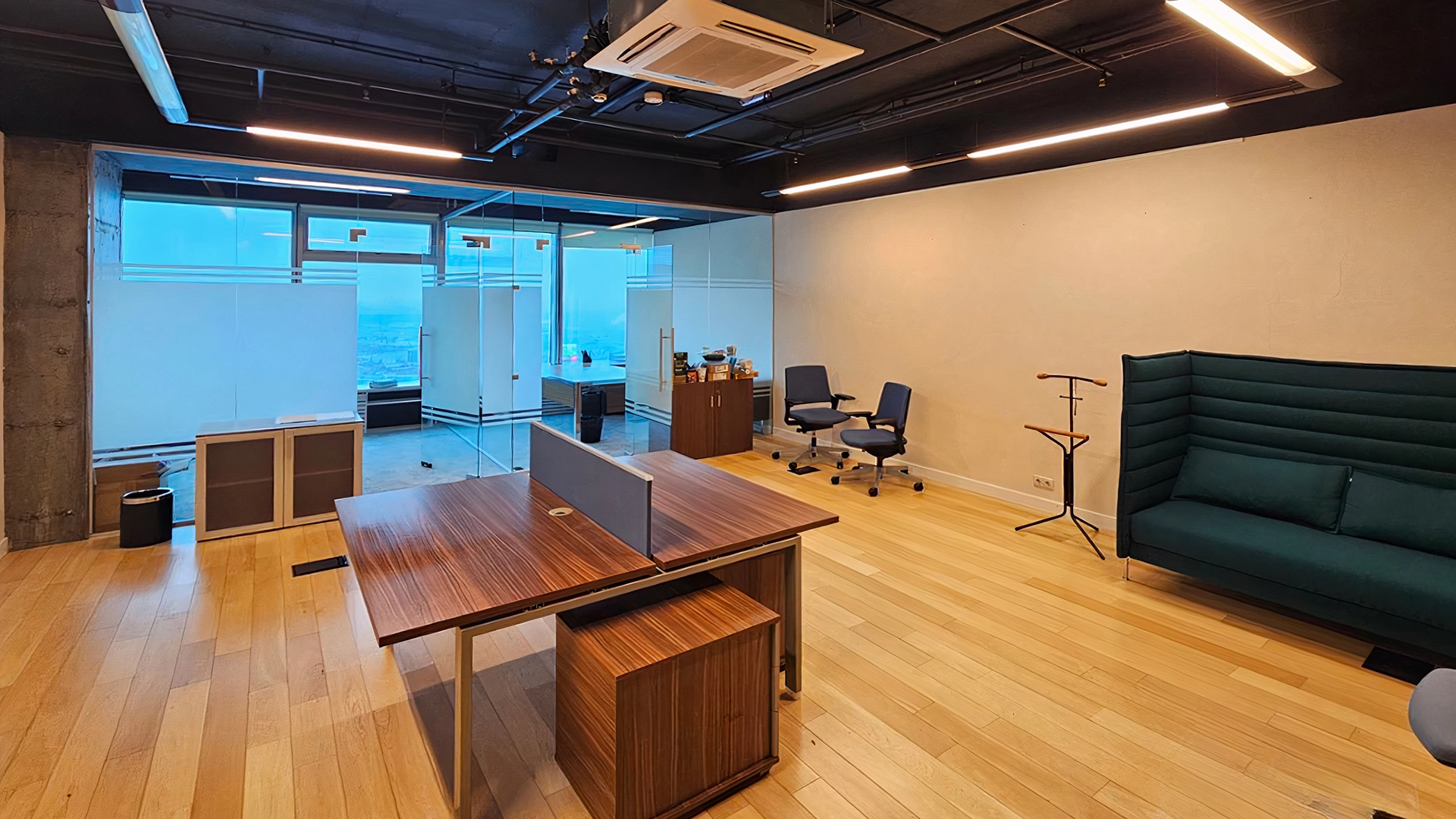 This 63 m² office is located on the forty-seventh floor of the Empire multifunctional center. The open-plan room is finished. Open space and two offices are planned, the space is zoned by glass partitions. Panoramic windows overlook the Moskva River and the city. Supply and exhaust ventilation and central air conditioning systems are installed. Entrance is through the common lobby in the building by pass.