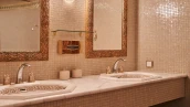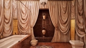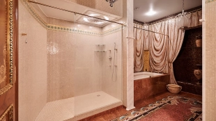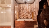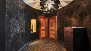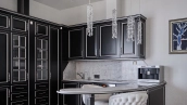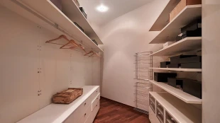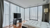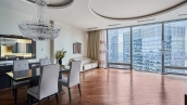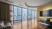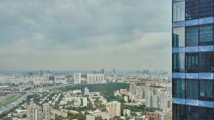 View spacious office of 139 m² on the 56th floor of the premium skyscraper complex "Federation" in the "West" tower. Premium designer finishing with Venetian plaster and American walnut. Open space with a kitchen, an office with corner panoramic glazing, a large bathroom with a shower zone and a bathtub, a spacious dressing room, a guest bathroom. The room is equipped with modern furniture and appliances.