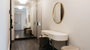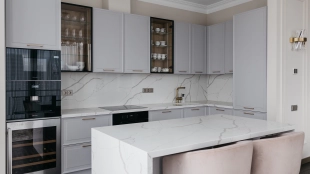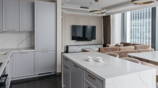 A 2-bedroom apartment with total area of 178 m² in a complex on Novy Arbat. The interior is decorated in light colors in a modern style.