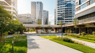 Ландшафтный баланс. Многообразие зелёных насаждений от вертикальных навесов до «зелёных» крыш, гармония природных форм для эмоциональной перезагрузки. Променады вдоль хвойных и лиственных деревьев, аллеи с ароматным шалфеем и цветами, пикники на лужайке.